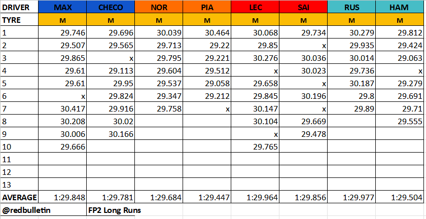 Αντιθέτως, στις προσομοιώσει αγώνα η Ferrari, ξεκίνησε το stint πιο συντηρητικά, αλλά είχε καλύτερους χρόνους προς το τέλος. Ο Leclerc όμως ανέφερε ότι ίσως η Ferrari είχε κάνει υπερβολικά πολλούς γύρους με το σετ μέσης γόμας πριν από τις προσομοιώσεις αγώνα.