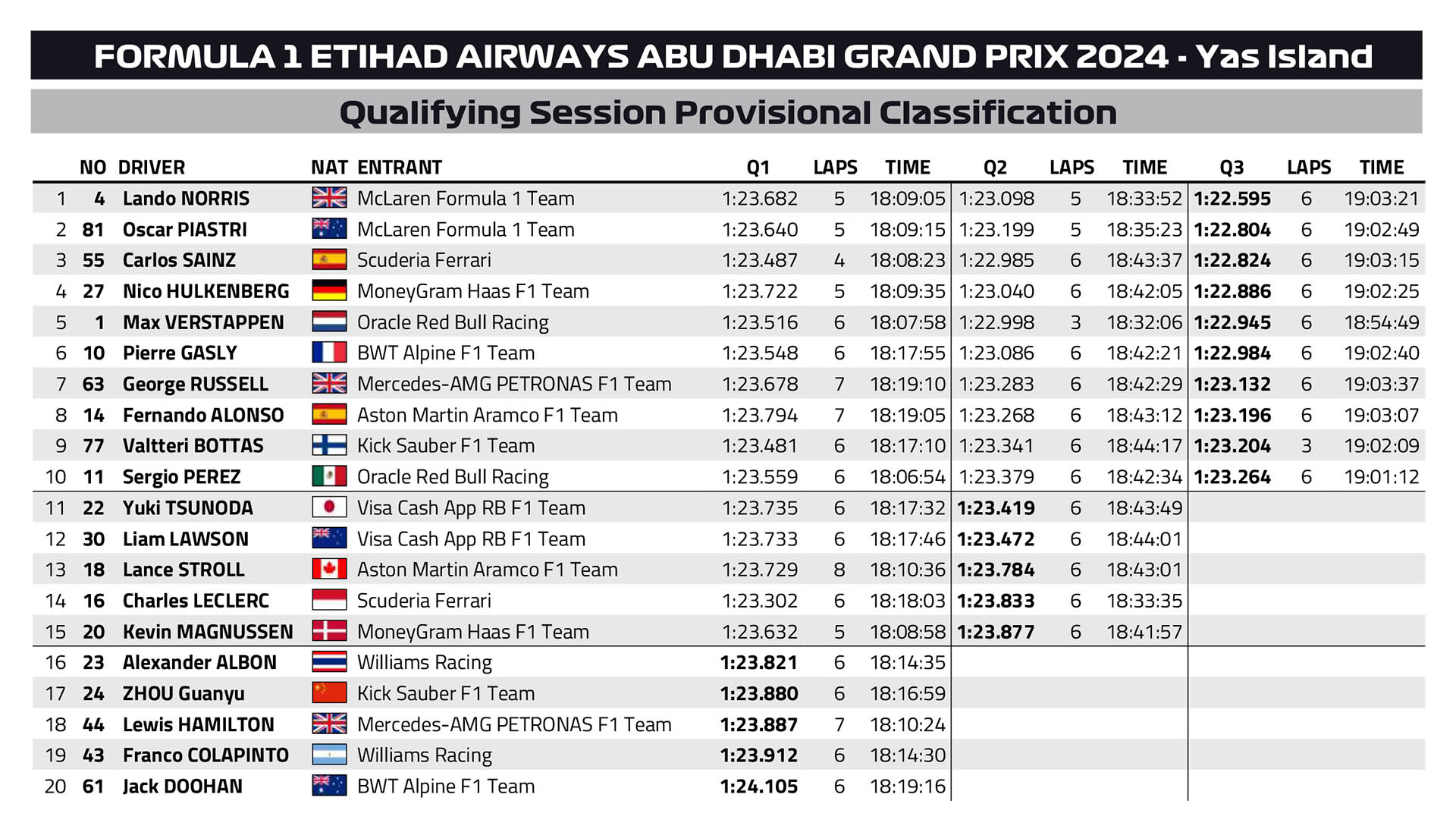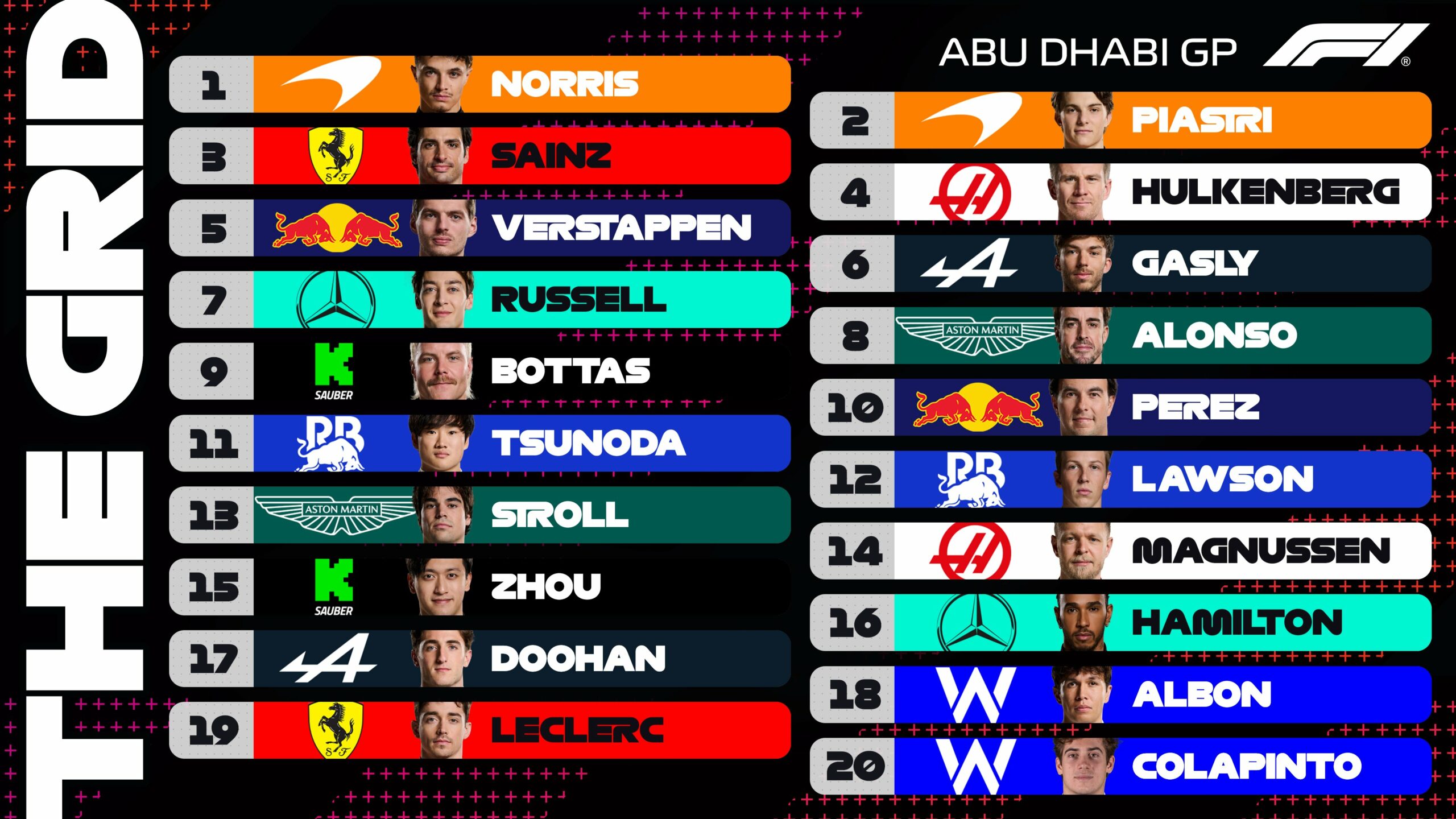 O Lando Norris κατέκτησε την pole position για τον τελευταίο αγώνα της φετινής σεζόν της Formula 1, το GP Άμπου Ντάμπι, με τον Oscar Piastri να τον πλαισιώνει στην πρώτη σειρά εκκίνησης, εμπρός από τον Carlos Sainz.