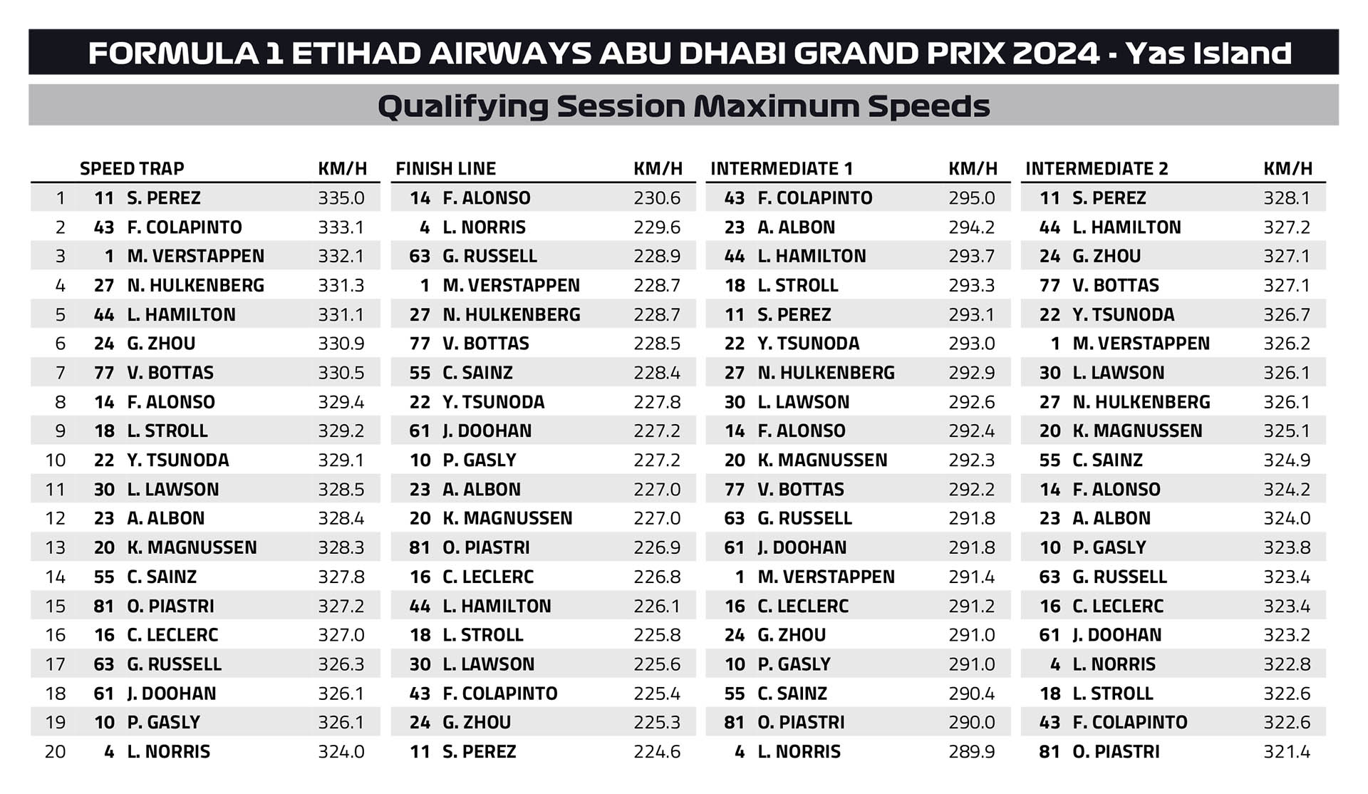 Ο Perez, όπως και ο Colapinto, ξεκίνησαν τo Q1 με υπέρβαση ορίων πίστας στην 1η στροφή, με συνέπεια να διαγραφεί ο χρόνος της πρώτης τους προσπάθειας. Ωστόσο, το περιστατικό επανεξετάστηκε και ο χρόνος του Μεξικανού επέστρεψε στον πίνακα, και ήταν ο 3ος ταχύτερος, αλλά μέχρι να συμβεί αυτό, είχε ήδη βγει στην πίστα ξανά με άλλο ένα φρέσκο σετ ελαστικών μαλακής γόμας, ενώ ο Verstappen ήταν ο μοναδικός που επέμεινε με το ίδιο σετ.