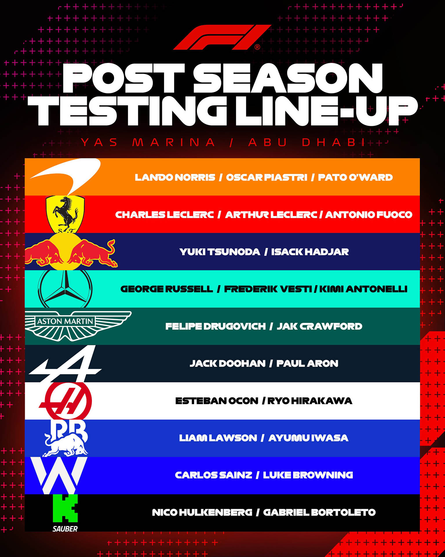 Στην Alpine, δίπλα από τον Jack Doohan, που έκανε το ντεμπούτο του στη Formula 1 στο GP Άμπου Ντάμπι, βρέθηκε ο 20χρονος Εσθονός Paul Aron, 3ος φέτος στην τελική βαθμολογία της Formula 2, ο οποίος οδήγησε για πρώτη φορά μονοθέσιο F1 και θα αποτελεί εφεδρικό οδηγό της γαλλικής ομάδας το 2025.