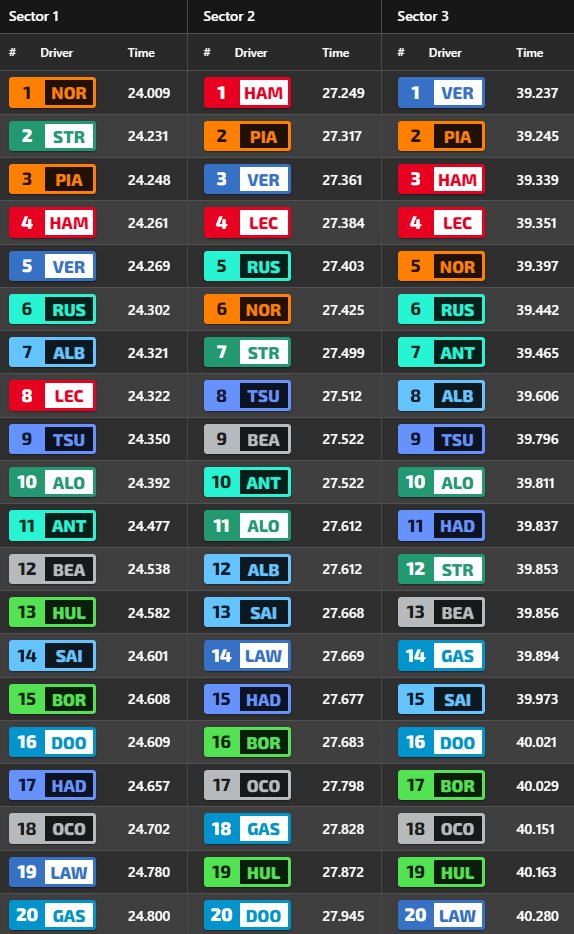 Πολύ καλή εμφάνιση έκανε ο Andrea Kimi Antonelli για να βρεθεί στην 7η θέση στην αυριανή εκκίνηση. Ο Ιταλός ένιωθε καλύτερα στο μονοθέσιο και δυσκολεύτηκε με τη μετάβαση στα μαλακά ελαστικά, έχοντας χαμηλές θερμοκρασίες στις πρώτες στροφές. Ο Antontelli θα παραταχθεί εμπρός από τον Yuki Tsunoda, που με τη Racing Bulls είναι ο καλύτερος από τους «υπόλοιπους», έχοντας βάλει πίσω του τον πολύ καλό Alex Albon με τη Williams και τον Lance Stroll, που κέρδισε την εσωτερική αναμέτρηση στην Aston Martin και συμπλήρωσε την πρώτη δεκάδα.