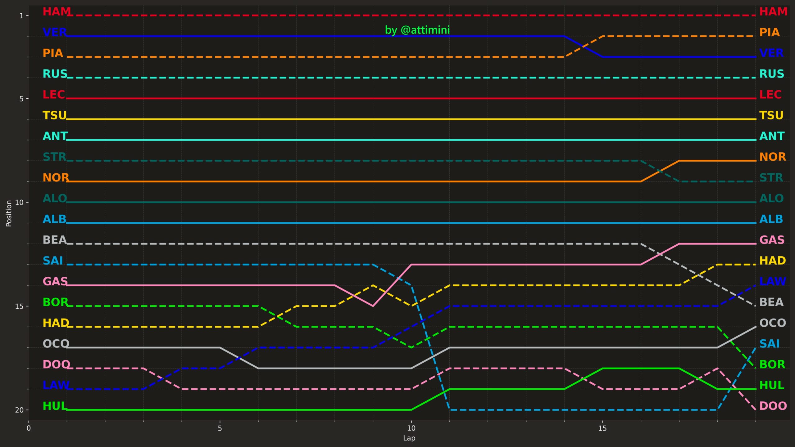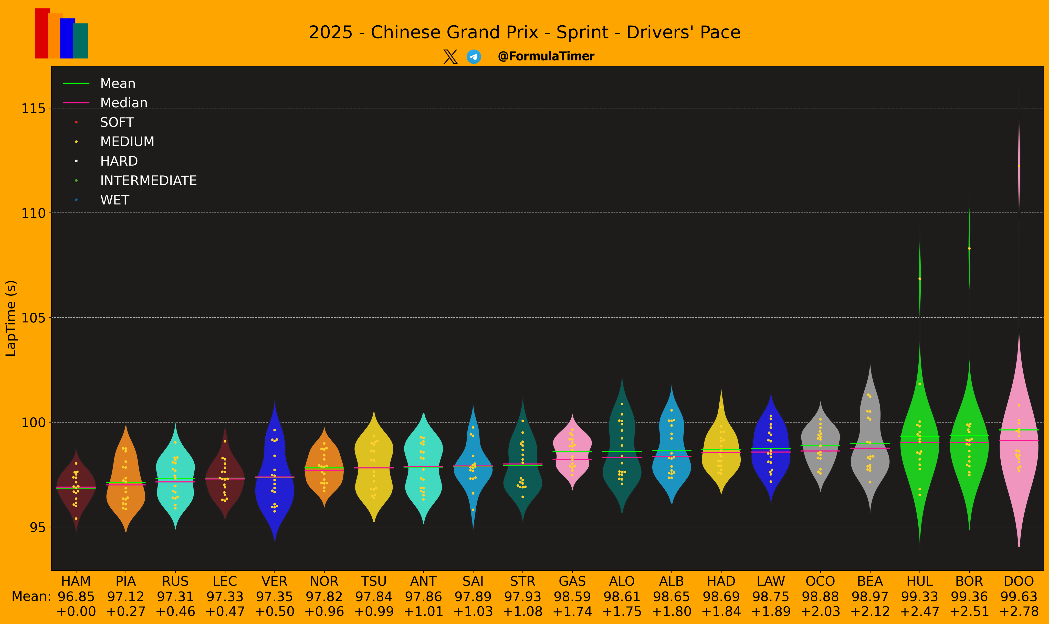O Yuki Tsunoda έκανε ένα πολύ καλό σπριντ για να σημειώσει τους πρώτους 3 βαθμούς της Racing Bulls στη φετινή σεζόν, καθώς κατάφερε να περάσει τον Andrea Kimi Antonelli στις πρώτες στροφές και να τον διατηρήσει πίσω του έως την καρό σημαία, παρότι η Mercedes του Ιταλού είχε DRS για τη μεγαλύτερη διάρκεια του μίνι αγώνα. O Ιταλός δυσκολεύτηκε με την υπερθέρμανση των ελαστικών του στον διαταραγμένο αέρα που άφηνε πίσω της η Racing Bulls του Ιάπωνα.