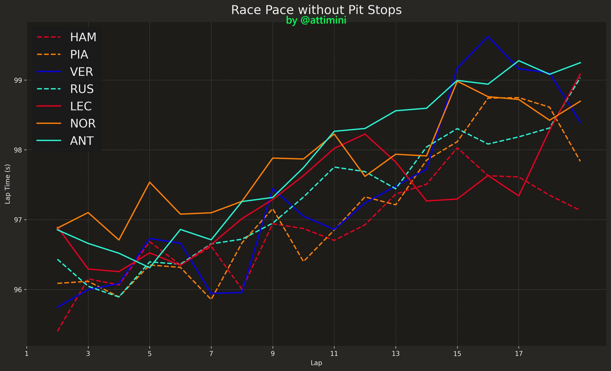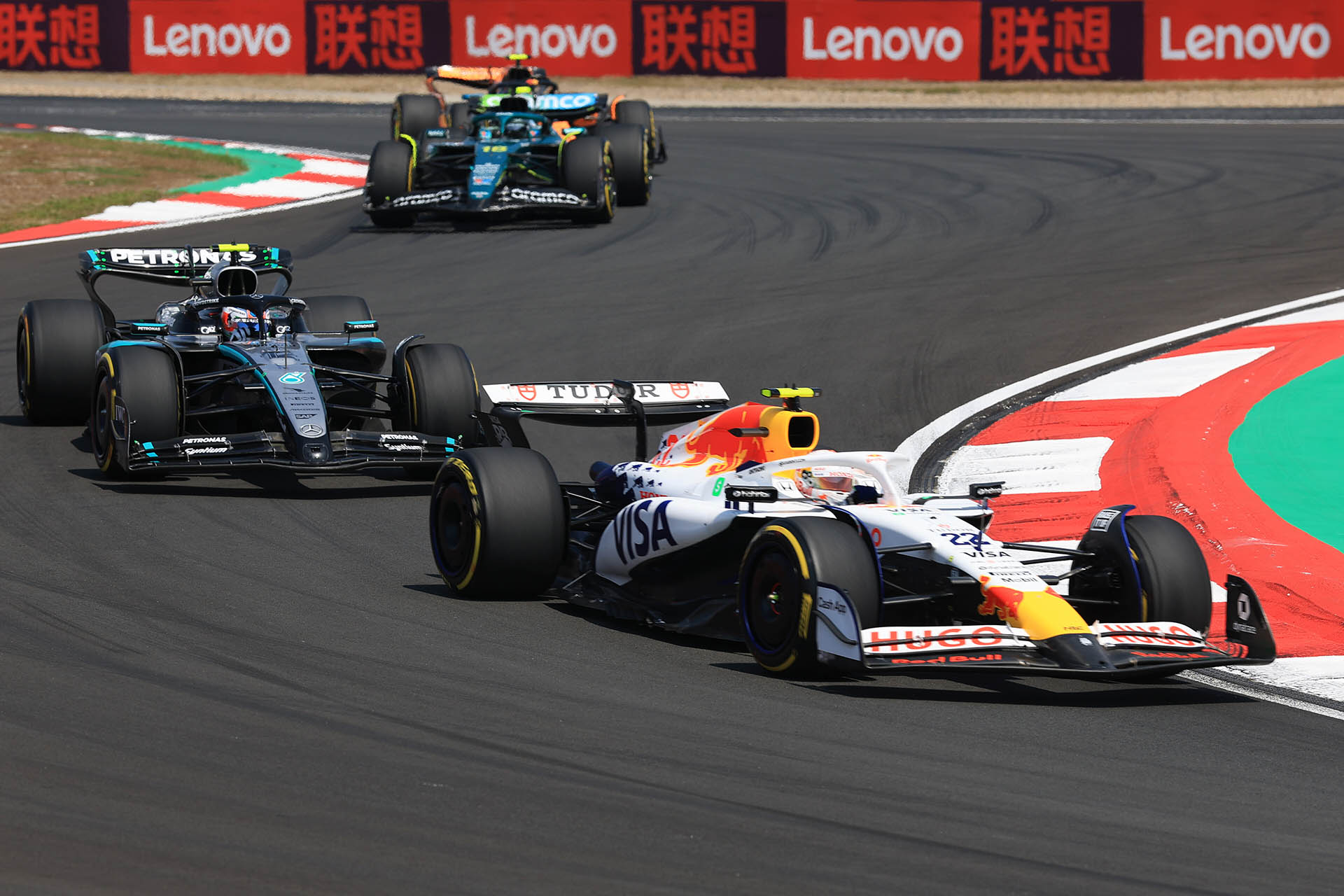 Ο Verstappen πλησίασε σε εμβέλεια DRS, αλλά έφτασε μόνο μέχρι εκεί. Ο Hamilton φρόντισε να απομακρυνθεί σχεδόν άμεσα, σπάζοντας για 2η φορά το DRS έως τον 9ο γύρο. Ο Verstappen, που δεν είχε με τη Red Bull τόσο καλό ρυθμό αναγκαζόταν να πιέζει περισσότερο, ιδίως στις γρήγορες στροφές, με αποτέλεσμα να καταπονήσει περισσότερο τα ελαστικά του. Σε εκείνη τη φάση προσπαθούσε να αποκτήσει το DRS και για να αμυνθεί εναντίον του Oscar Piastri με τη McLaren.