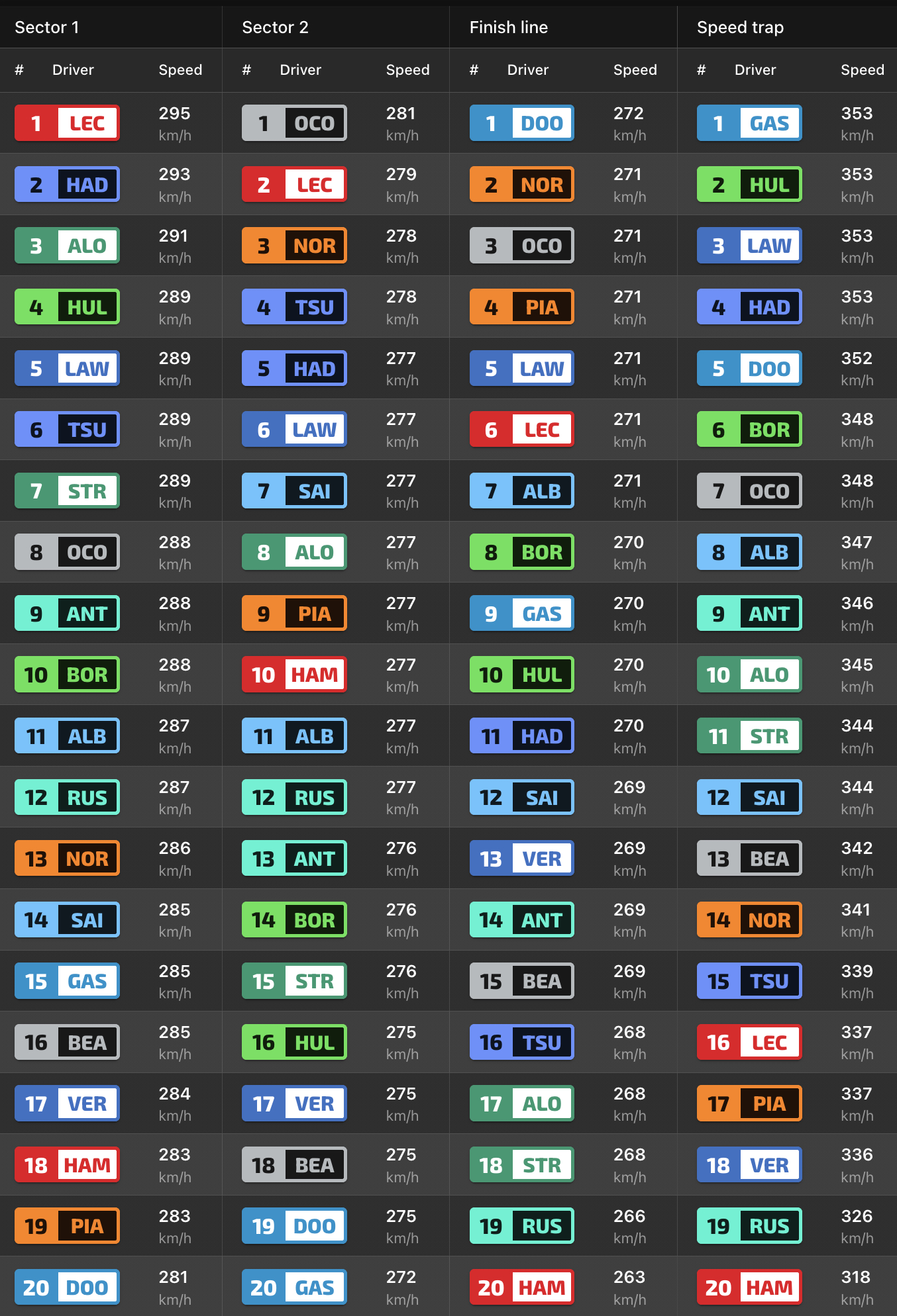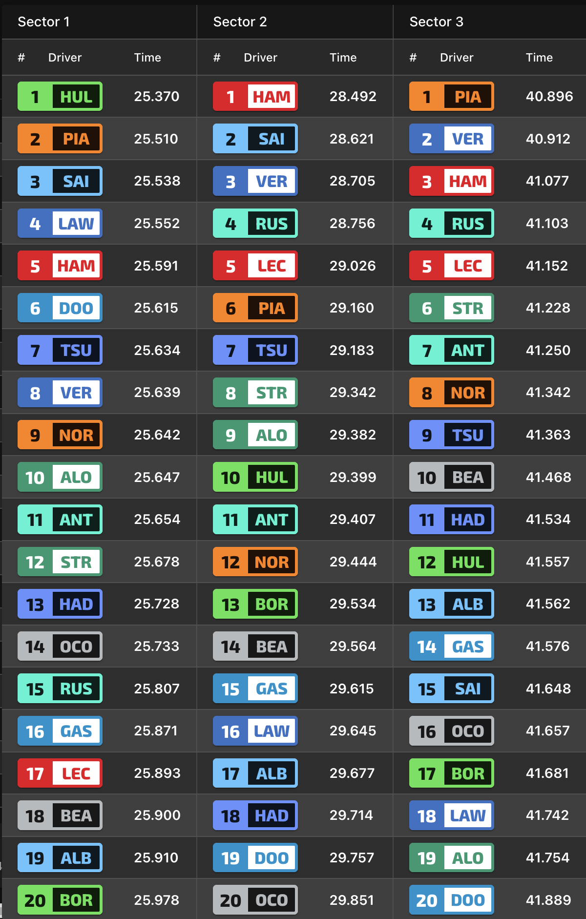 Καλή εμφάνιση έκαναν οι Isack Hadjar και Liam Lawson, πραγματοποιώντας πολλά προσπεράσματα, καθώς είχαν εκκινήσει σε πιο πίσω θέσεις από τις πραγματικές δυνατότητες των μονοθεσίων τους. Δύσκολο σπριντ για τις Williams, αφού ο Alex Albon τερμάτισε 11ος και ο Carlos Sainz αναγκάστηκε να κάνει pit stop για αλλαγή ελαστικών. Ο Ισπανός επωφελήθηκε στην προτελευταία στροφή από την επαφή Doohan και Bortoleto, στην οποία… σκόνταψε και ο Hulkenberg, για να περάσει μπροστά από όλους τους.