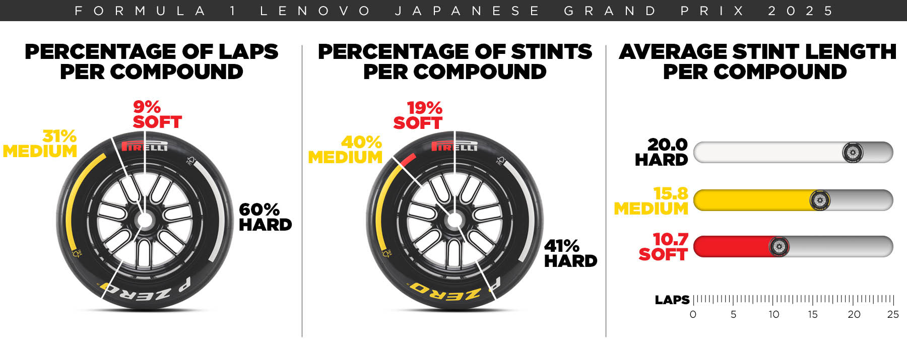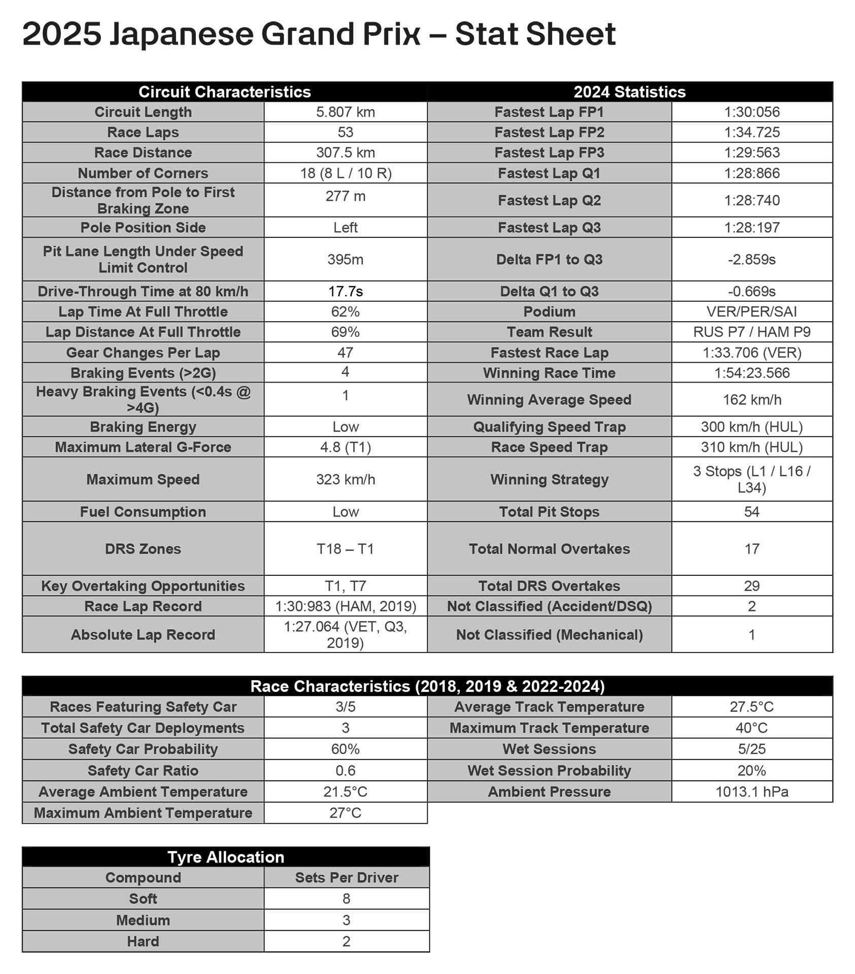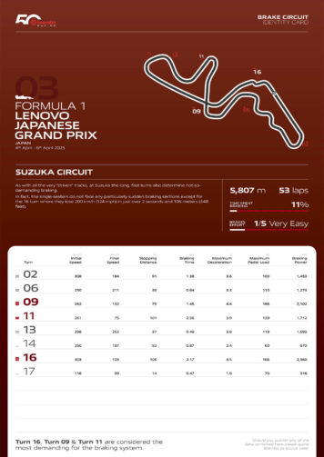 Στη Suzuka, η καταπόνηση του συστήματος πέδησης είναι μικρή, με μόλις 3 ζώνες έντονου φρεναρίσματος. Το σχήμα «8» την κάνει την πιο «συμμετρική» πίστα της χρονιάς, με 10 δεξιές και 8 αριστερές στροφές. Κατά συνέπεια, καταπονεί ισόποσα τα ελαστικά και των δύο πλευρών των μονοθεσίων, με υψηλά πλευρικά φορτία να ασκούνται σε αυτά.