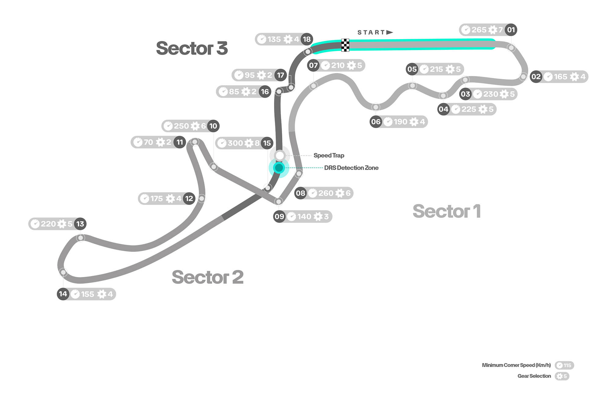 Στις κατατακτήριες δοκιμές, οι οδηγοί διανύουν την πρώτη στροφή της πίστας χωρίς να πατήσουν φρένο και βιώνουν πλευρικές επιταχύνσεις 4,3 G, με μερικές ταχύτατες εναλλαγές κατεύθυνσης να ακολουθούν στα «S» (στροφές 3-7). Οι οδηγοί διανύουν σχεδόν 2 χλμ. στην αρχή του γύρου (από τα 5.807 μ. συνολικά) στρίβοντας διαρκώς το τιμόνι. Είναι πίστα που απαιτεί καλή αεροδυναμική απόδοση (σχέση παραγόμενου φορτίου/οπισθέλκουσας) και το 1ο sector αποτελεί πολύ καλό δείκτη των ικανοτήτων των μονοθεσίων σε αυτό τον τομέα.