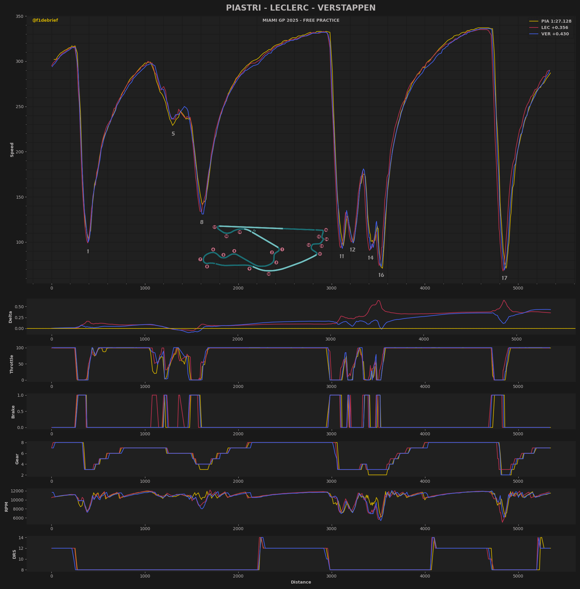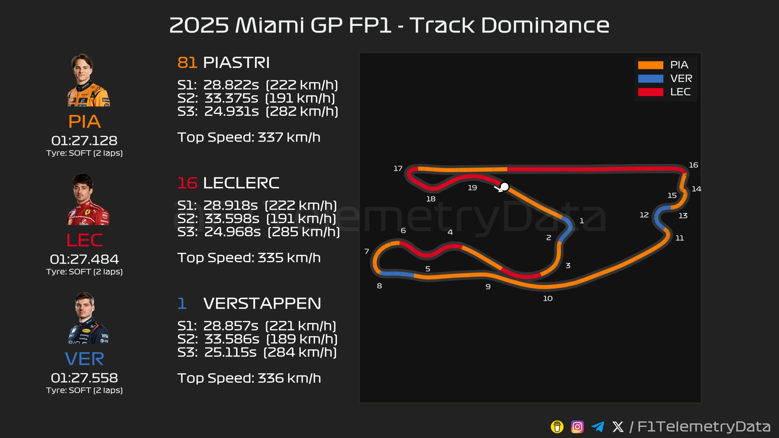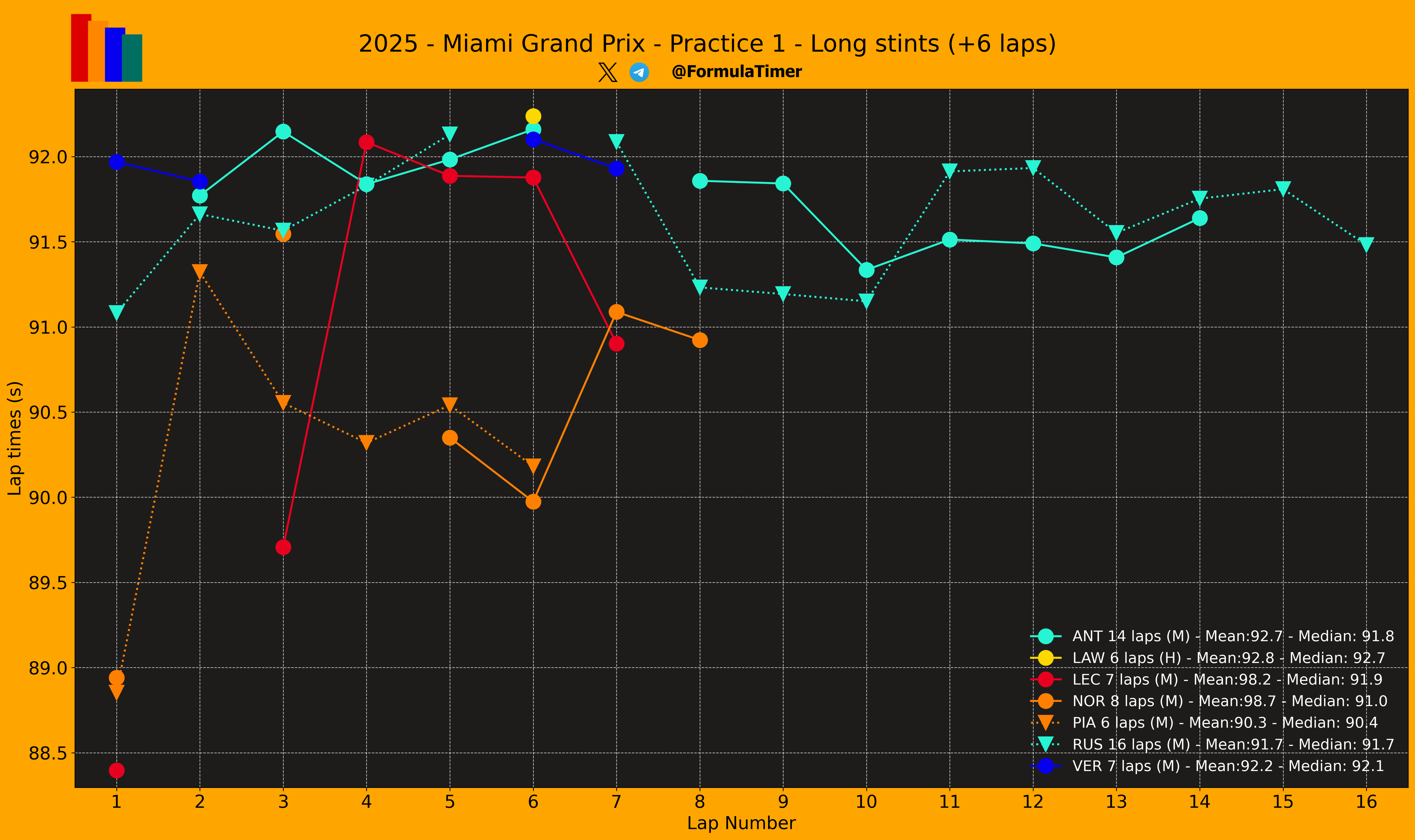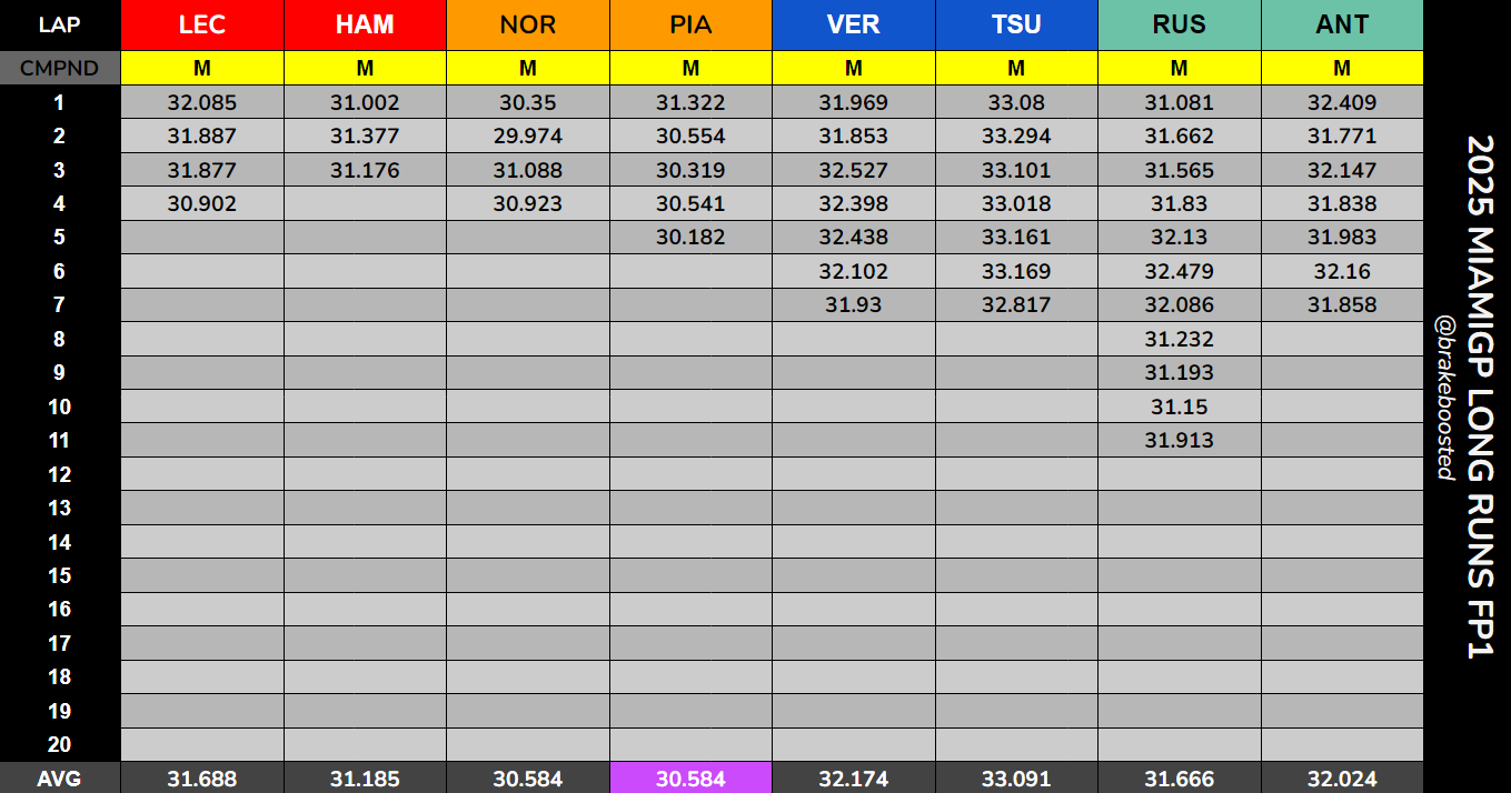 O Piastri, σε έναν από τους τελευταίους γύρους του με τη μέση γόμα, έξυσε λίγο τον τοίχο στην εξωτερική της στροφής 16. Στις προσομοιώσεις αγώνα, η McLaren είχε ξεκάθαρο προβάδισμα από τους υπόλοιπους, όπως μπορείτε να δείτε στους επισυναπτόμενους πίνακες στο κάτω μέρος του άρθρου.