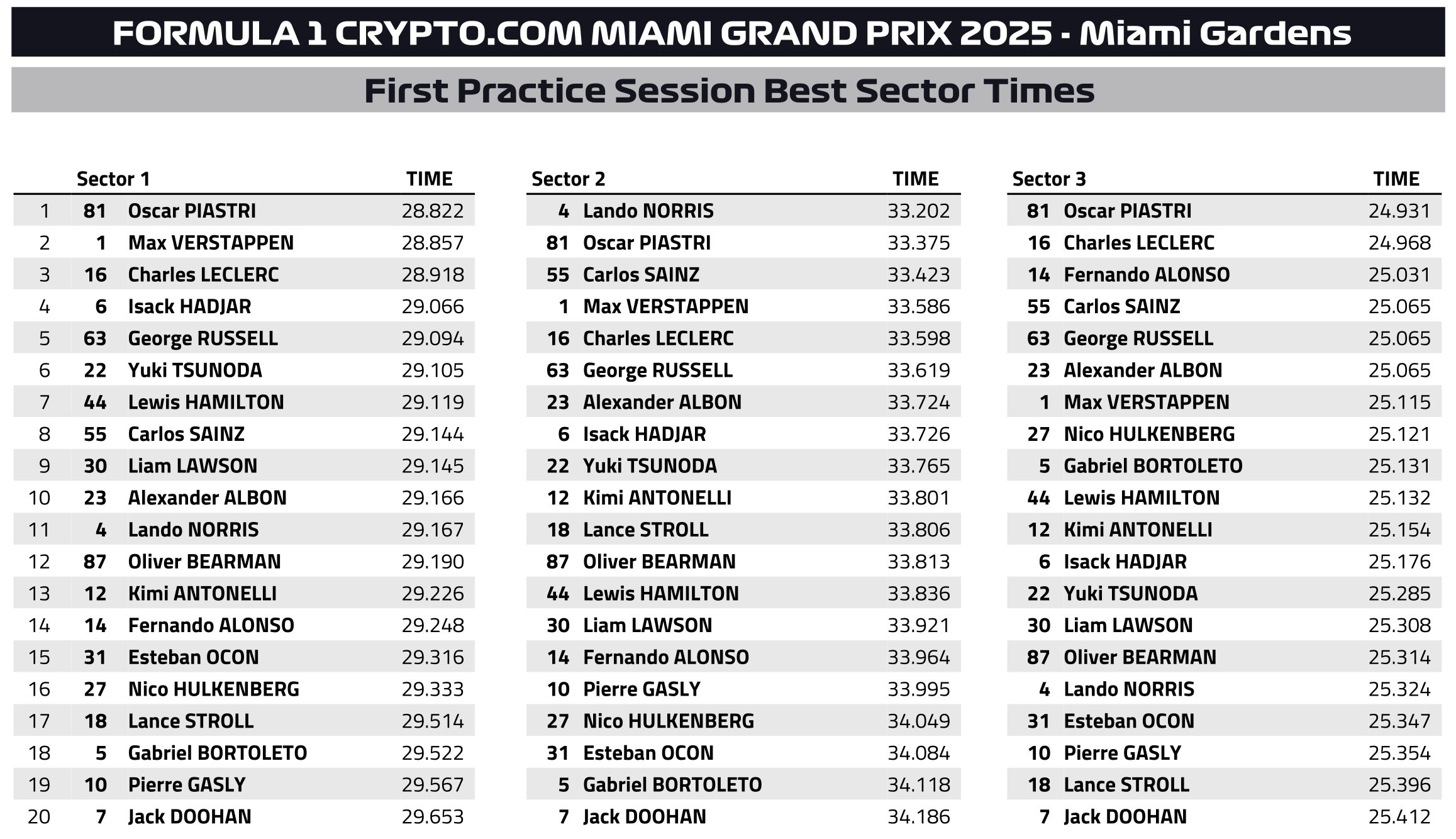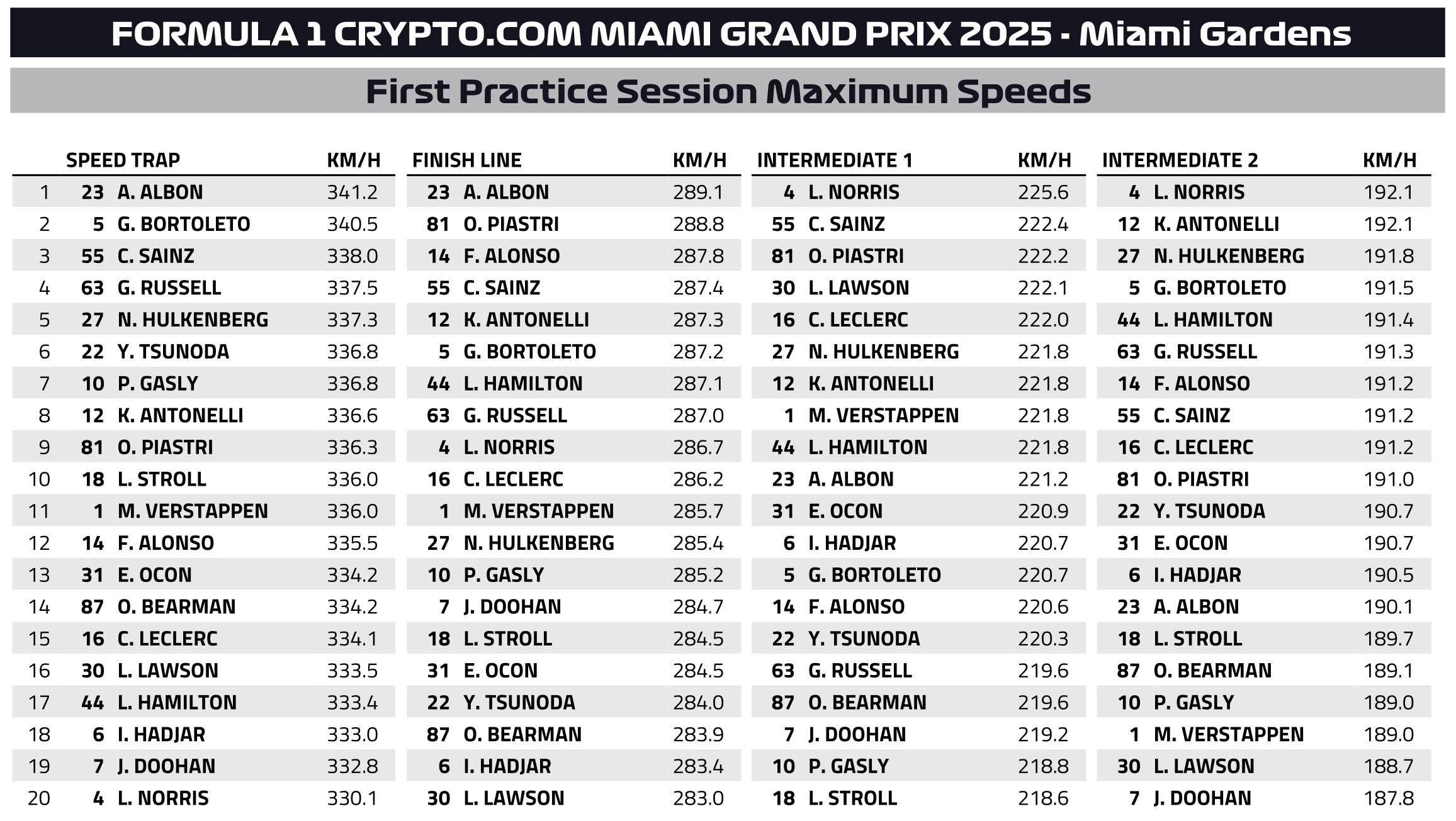 Ο Yuki Tsunoda, που βρέθηκε με τη Red Bull στην 8η θέση, μεταξύ των δύο Mercedes, ξεκίνησε το FP1 αναφέροντας ότι το κάθισμά του ήταν τοποθετημένο πολύ ψηλά. O Fernando Alonso συμπλήρωσε την πρώτη δεκάδα με την Aston Martin.