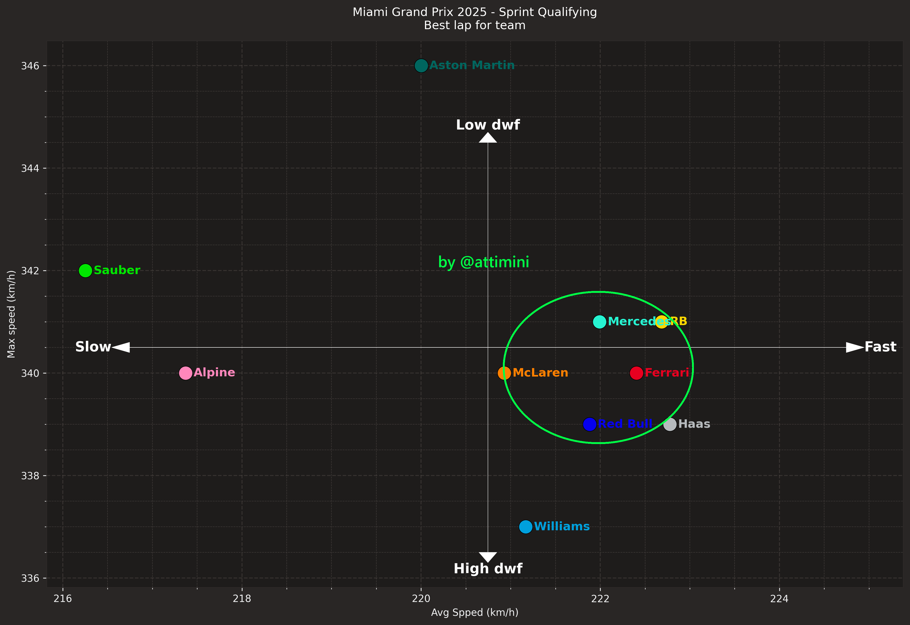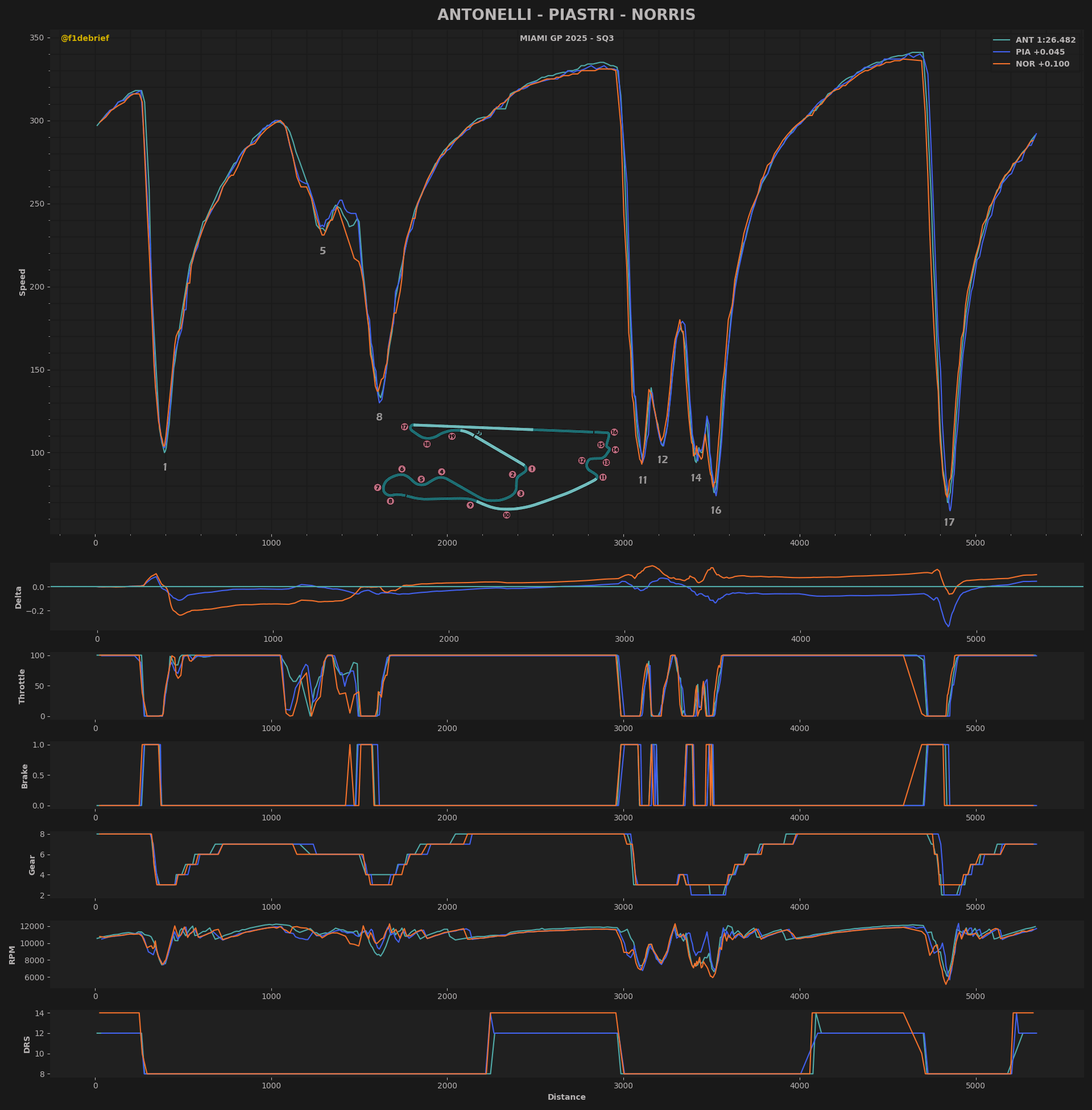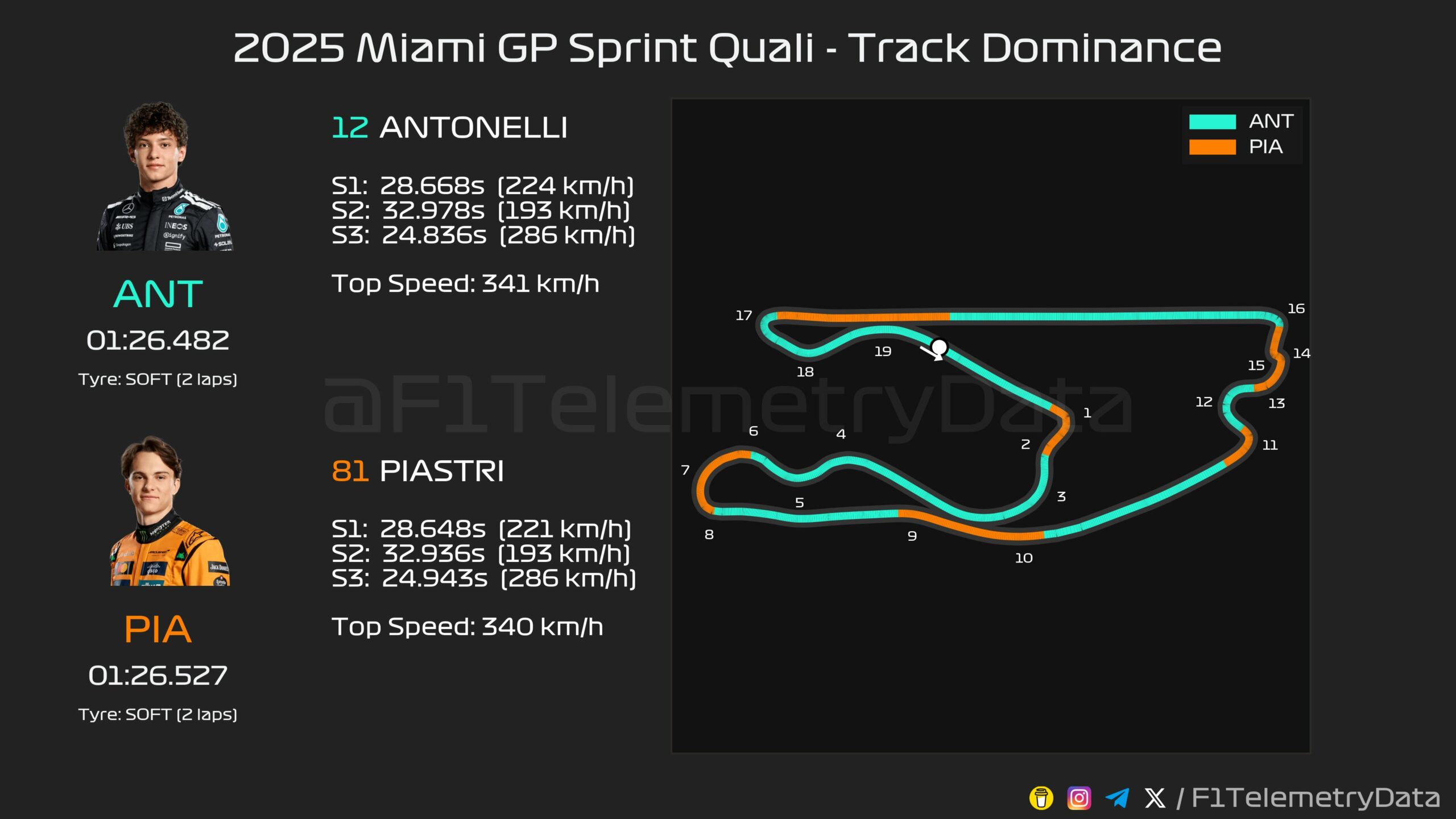 Ο Antonelli κατάφερε να κινηθεί 0,045 δλ. ταχύτερα από τον Oscar Piastri, ο οποίος ήταν ο ταχύτερος εκ των δύο οδηγών της McLaren, με τον Lando Norris να βρίσκεται ακριβώς 0,1 δλ. μακριά από την κορυφή. Ο Piastri είχε ένα μπλοκάρισμα φρένων στη στροφή 17, το οποίο του κόστισε την pole position, ωστόσο εξακολουθεί να βρίσκεται εμπρός από τον κύριο αντίπαλό του στο Πρωτάθλημα, τον team-mate του, σε μία πολύ κοντινή μάχη για την επικράτηση στις κατατακτήριες για το σπριντ του GP Μαϊάμι.