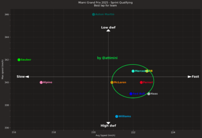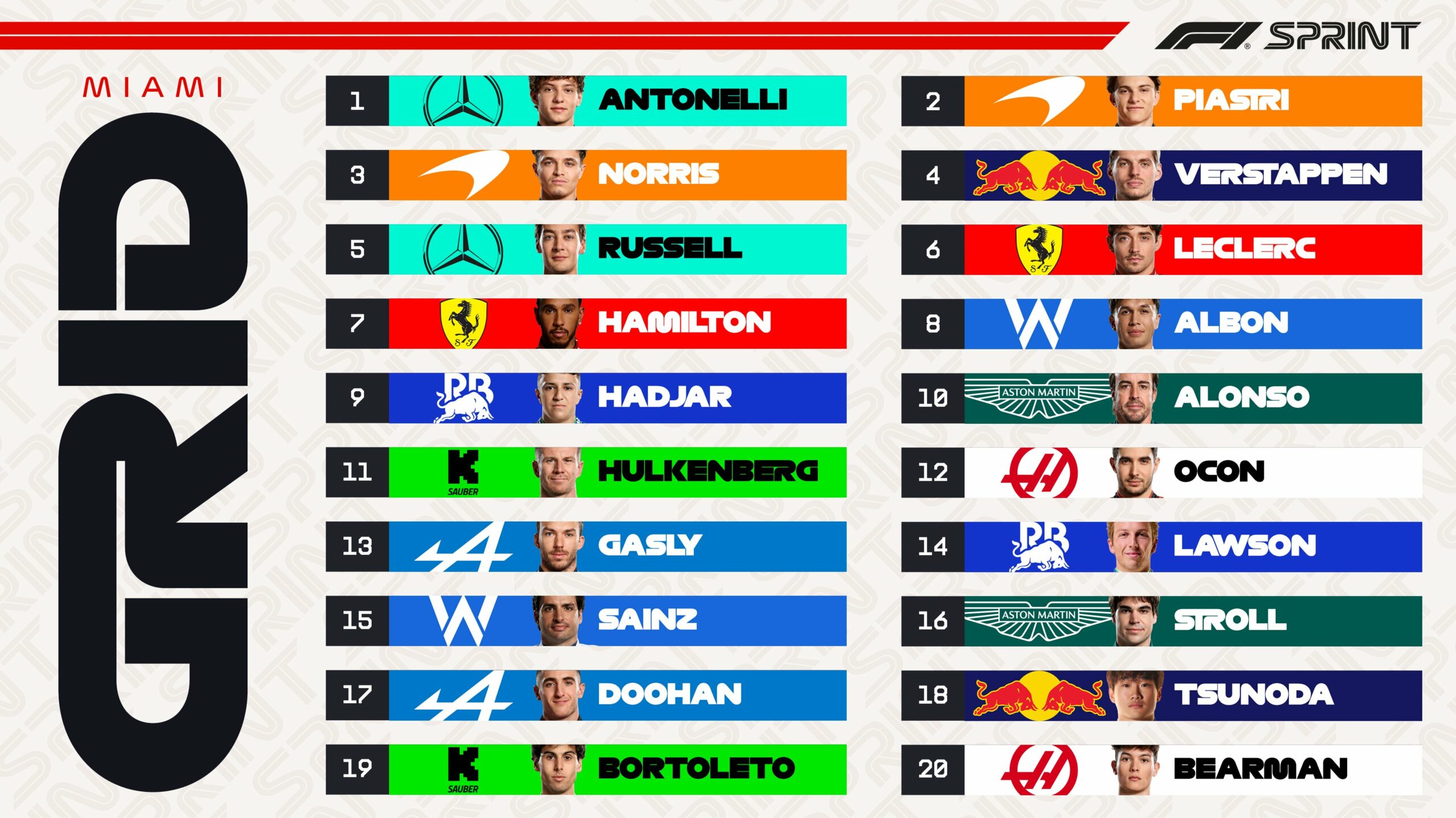 Ο Alex Albon με τη Williams ήταν ο κορυφαίος οδηγός πέραν των τεσσάρων κορυφαίων ομάδων και βρέθηκε στην 8η θέση. Στην 9η θέση εκκίνησης του σπριντ του Σαββάτου θα παραταχθεί άλλος ένας εντυπωσιακός rookie, o Isack Hadjar με τη Racing Bulls, η οποία φαίνεται να βρήκε και πάλι τη… σπιρτάδα της στον ένα γρήγορο γύρο στο Μαϊάμι. Ο Γάλλος είχε δει τον πρώτο χρόνο του στο SQ1 να διαγράφεται λόγω υπέρβασης ορίων πίστας, γεγονός που τον έθεσε υπό πίεση.