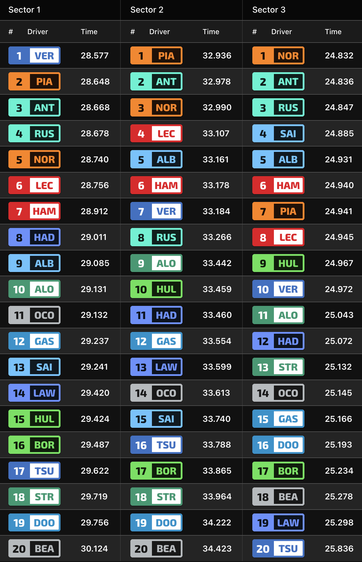 Ο Liam Lawson είχε μία πολύ κακή έξοδο από τη στροφή 17 και έχασε πολύ χρόνο έως τη γραμμή τερματισμού, για να βρεθεί στη 14η θέση με τη Racing Bulls. O Νεοζηλανδός παραδέχθηκε στον ασύρματο ότι ο γύρος του ήταν πολύ κακός. Ο Carlos Sainz είχε ένα τεράστιο μπλοκάρισμα φρένων στη στροφή 11 και δεν κατάφερε να γράψει χρόνο, για να καταλήξει στην 15η θέση.