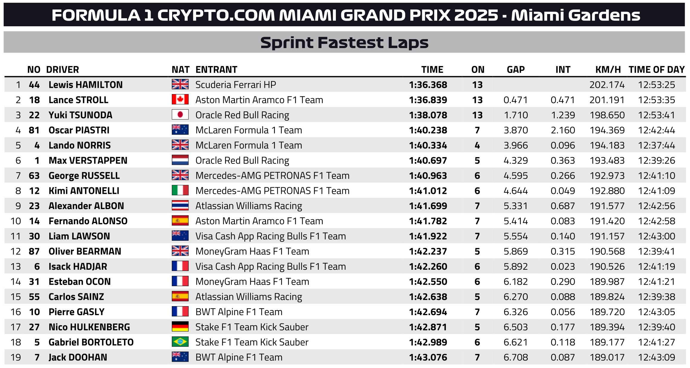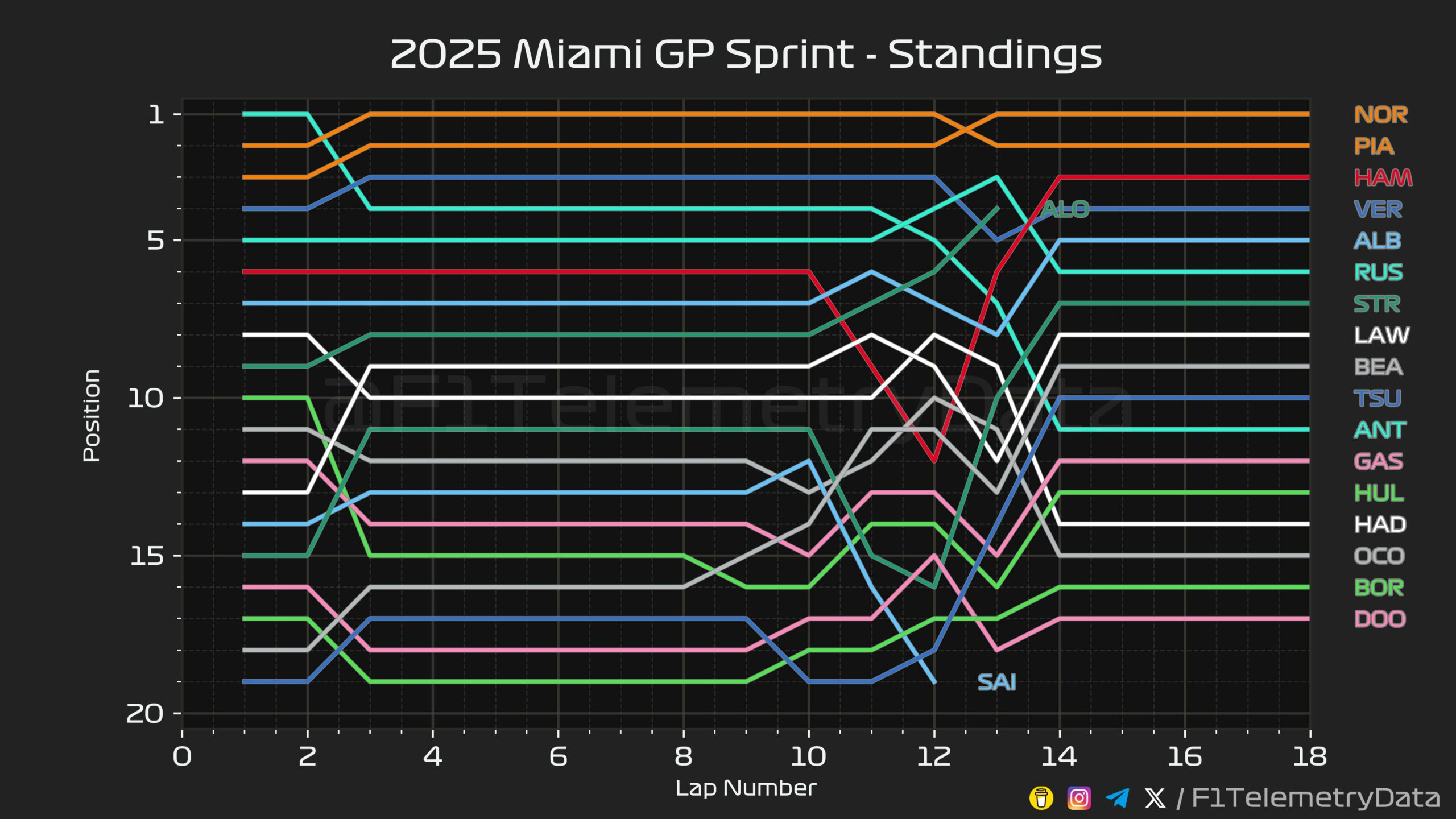 Εκεί κρίθηκε και το αποτέλεσμα, καθώς οι υπόλοιποι γύροι διεξήχθησαν πίσω από το αυτοκίνητο ασφαλείας, χωρίς να υπάρχει η δυνατότητα κάποιας αλλαγής θέσεων. Ακριβώς όπως είχε συμβεί και στο περυσινό GP Μαϊάμι, ο συγχρονισμός του αυτοκινήτου ασφαλείας ευνόησε τον Norris και στέρησε από τον Piastri τη νίκη.