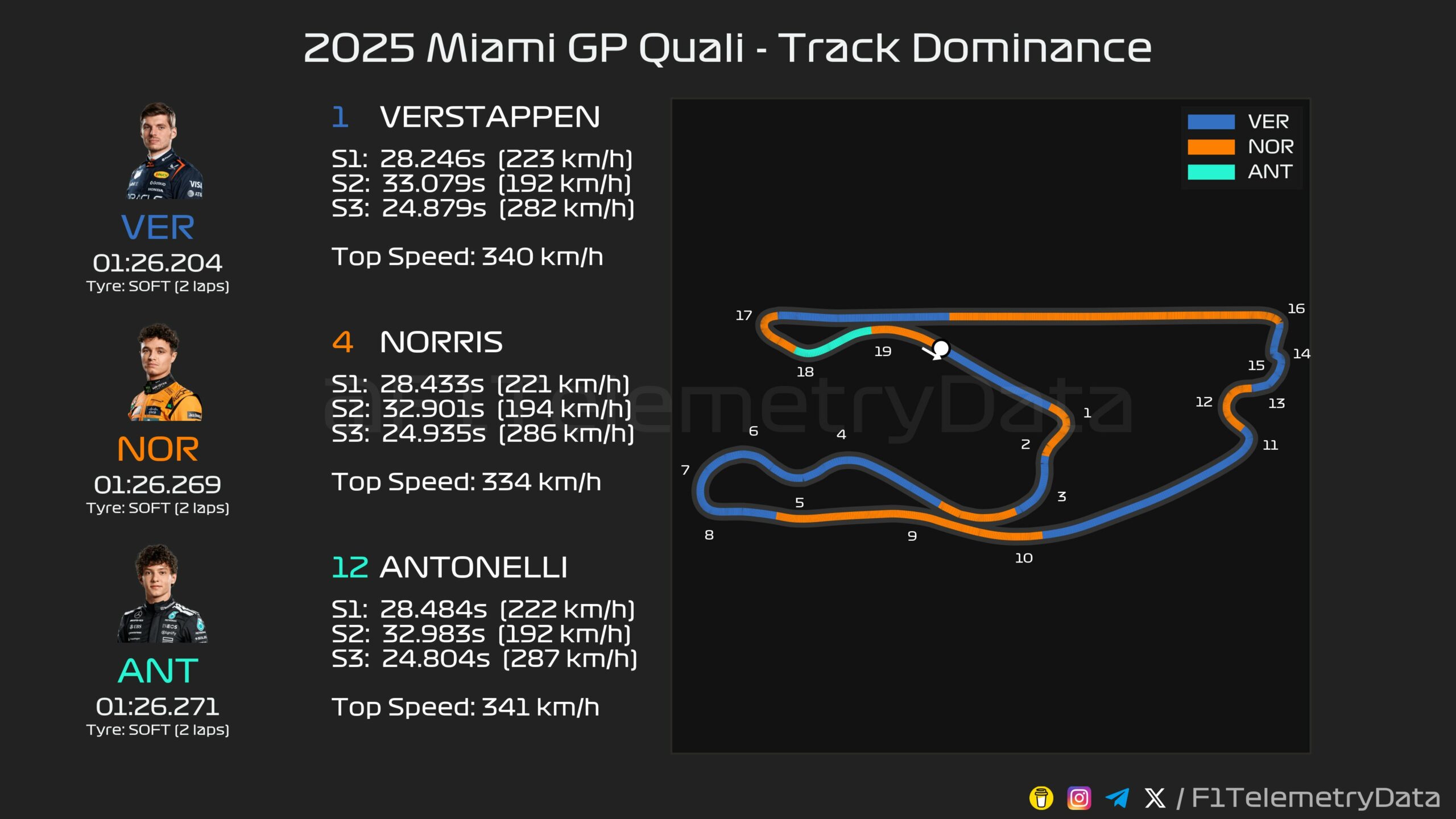 Στην πρώτη σειρά εκκίνησης του αγώνα θα πλαισιώσει τον Ολλανδό ο Lando Norris με τη McLaren, ο οποίος όμως χτύπησε αρκετά άτσαλα το εσωτερικό kerb της στροφής 17, γεγονός που σίγουρα του κόστισε χρόνο έως τη γραμμή τερματισμού. Εκεί είχε μπλοκάρει τα φρένα του στην πρώτη προσπάθεια του Q3. Ο Βρετανός βρέθηκε μόλις 0,065 δλ. πίσω από τον Verstappen, έχοντας χάσει χρόνο και στο 1ο sector, όπου η McLaren υστερούσε συγκριτικά με τη Red Bull.