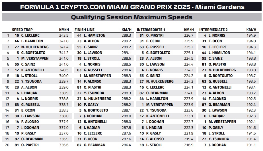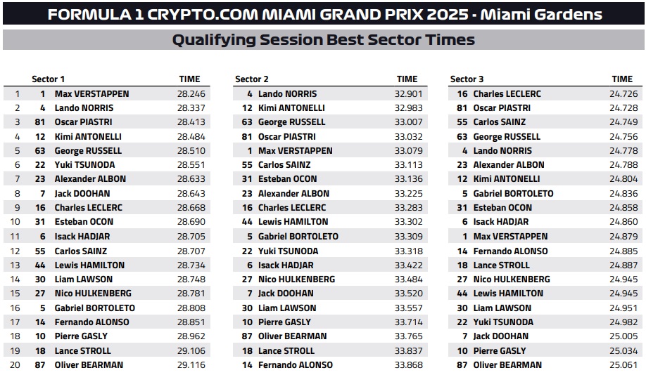 Ο Isack Hadjar κατάφερε να κινηθεί ταχύτερα από τον Hamilton, που αποτελεί το ίνδαλμά του, αλλά δεν ήταν καθόλου ευχαριστημένος από το γεγονός ότι αποκλείστηκε από τη συνέχεια της διαδικασίας 11ος. Ο Gabriel Bortoleto έκανε την καλύτερη εμφάνισή του σε κατατακτήριες δοκιμές για να πάρει τη 13η θέση με τη Sauber, η οποία δείχνει ανταγωνιστική στον ένα γρήγορο γύρο στο Μαϊάμι. Ο Jack Doohan θα εκκινήσει από τη 14η θέση, έχοντας βρεθεί μπροστά από τον team-mate του. Τελευταίος στο Q2 ήταν ο Liam Lawson, o οποίος αντιμετώπισε κάποιο πρόβλημα από την μπαταρία του υβριδικού συστήματος και δεν είχε πλήρη ισχύ από το ηλεκτρικό σύστημα.