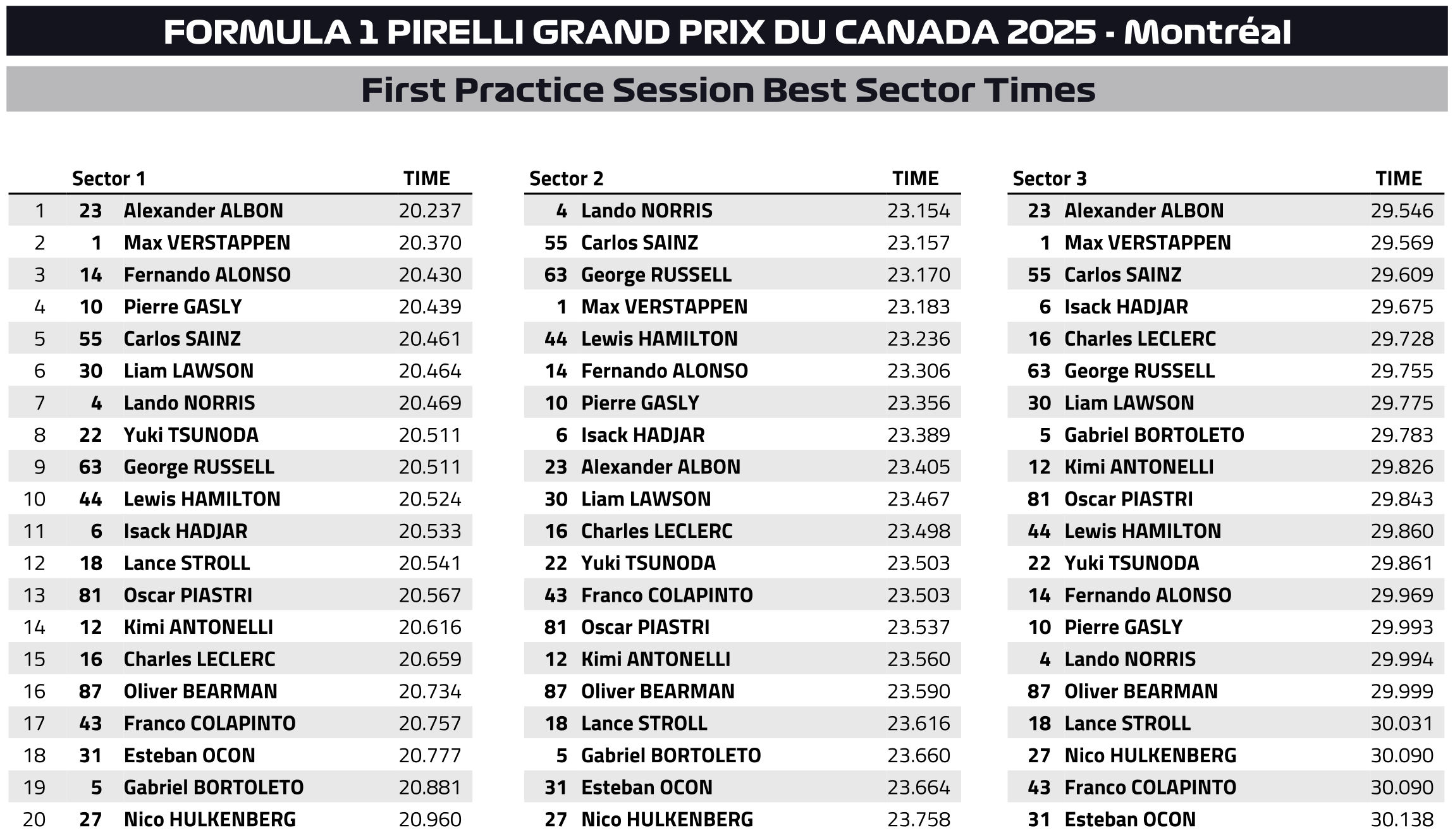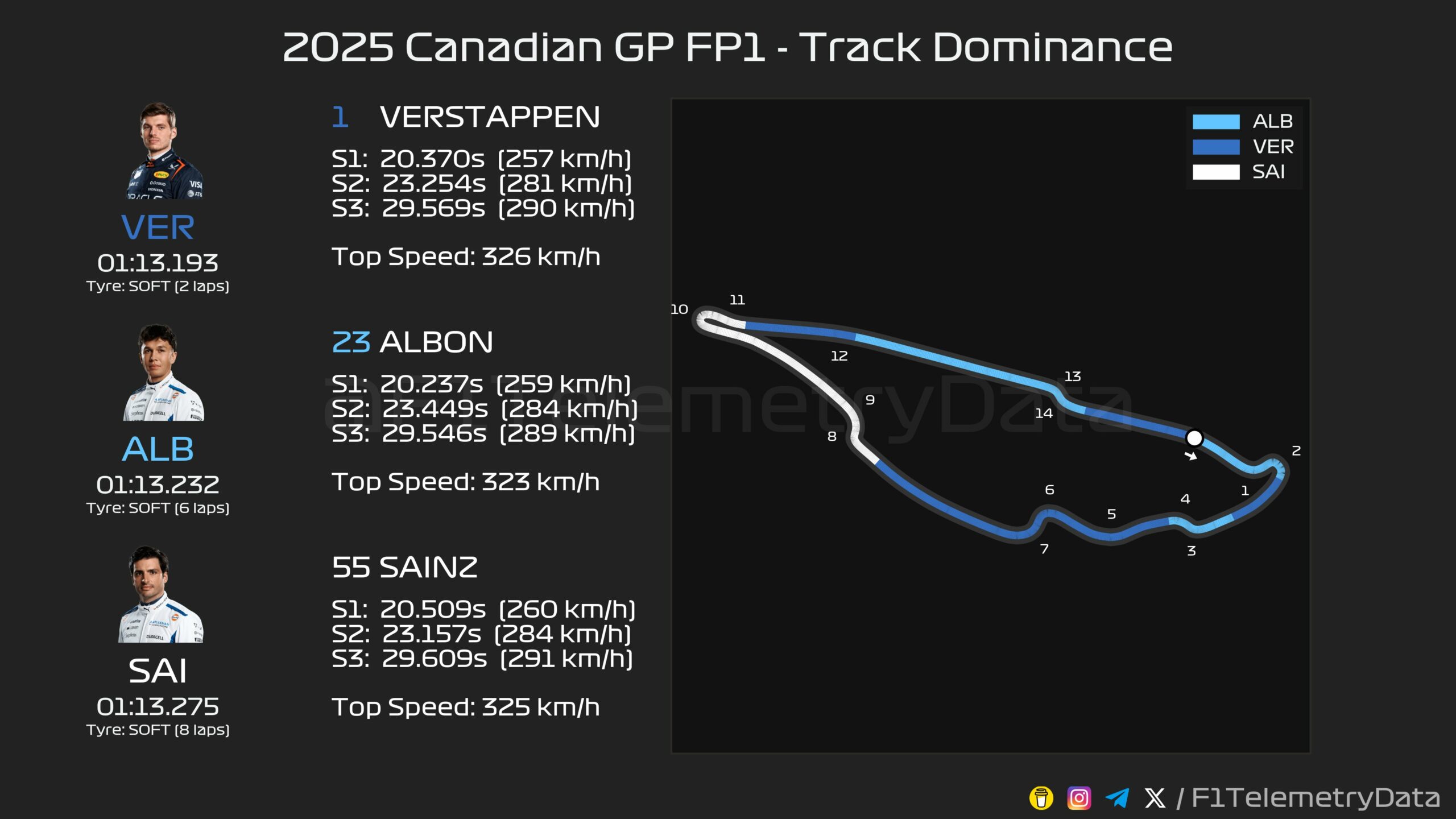 Τη μεγάλη έκπληξη έκαναν οι δύο οδηγοί της Williams, Alex Albon και Carlos Sainz, που βρέθηκαν στη 2η και 3η θέση, μόλις 0,04 και 0,08 δλ. μακριά από την κορυφή αντίστοιχα. Ίσως δείχνει πόσο ανταγωνιστική μπορεί να είναι η βρετανική ομάδα εκμεταλλευόμενη την απόδοση του μονοθεσίου της στις ευθείες, αν και η πίστα ήταν πολύ χλωρή και η μαλακή γόμα (C6) ενδέχεται να μην είναι η καλύτερη.