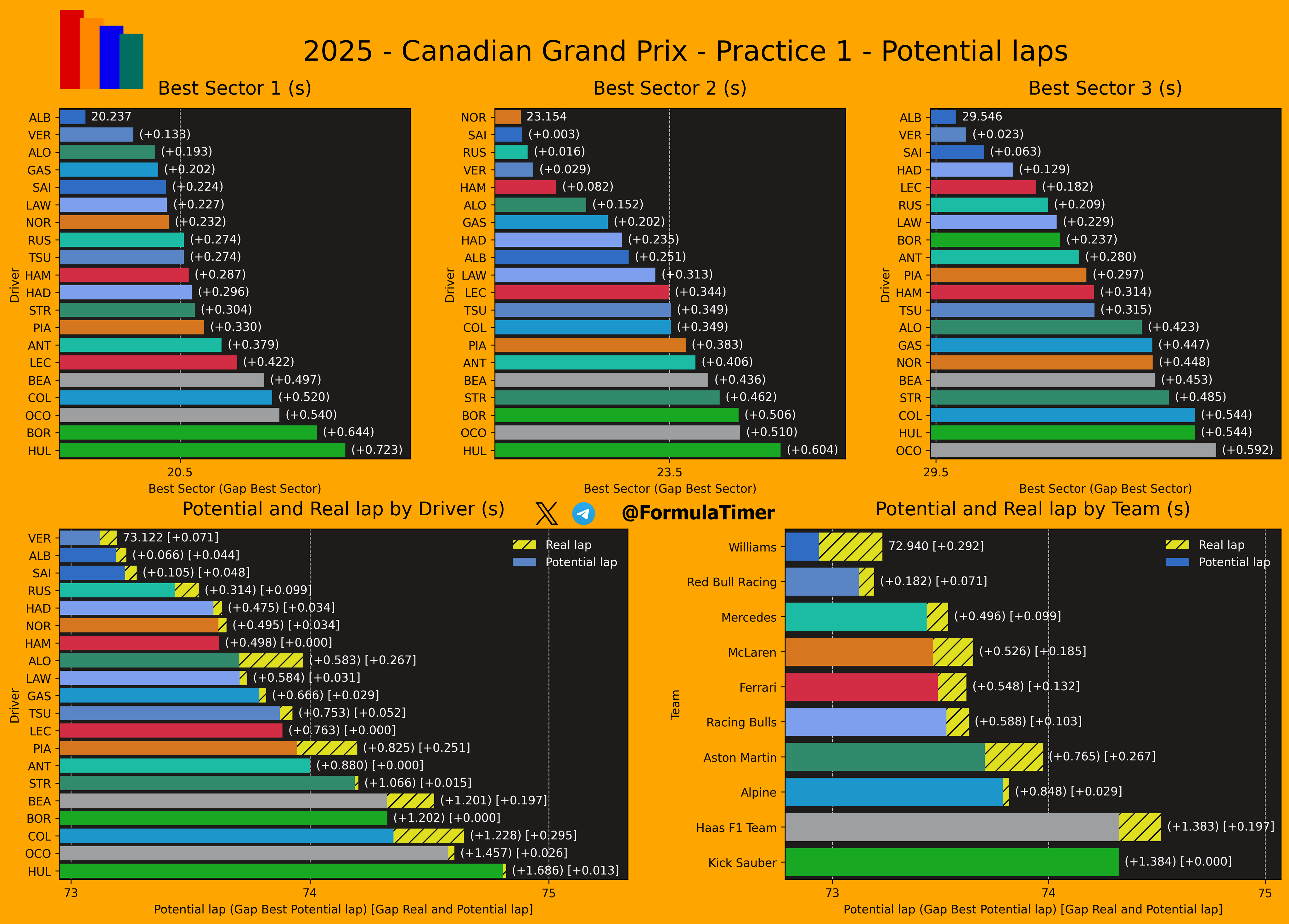 Πολύ καλή εικόνα επέδειξε η πάντα πολύ καλή στις αργές στροφές Racing Bulls, με τον Isack Hadjar 6ο και τον Liam Lawson στην 8η θέση. Αντιθέτως, δυσκολίες έδειξε να αντιμετωπίζει η McLaren, η οποία παρουσίασε τις πιο σημαντικές αναβαθμίσεις για αυτό το Σαββατοκύριακο, καθώς διαθέτει εμπρός αεροτομή με διαφορετική γεωμετρία (με μερικές τροποποιήσεις και στη διαμόρφωση της εμπρός ανάρτησης) και νέα πίσω αεροτομή μέσου αεροδυναμικού φορτίου.