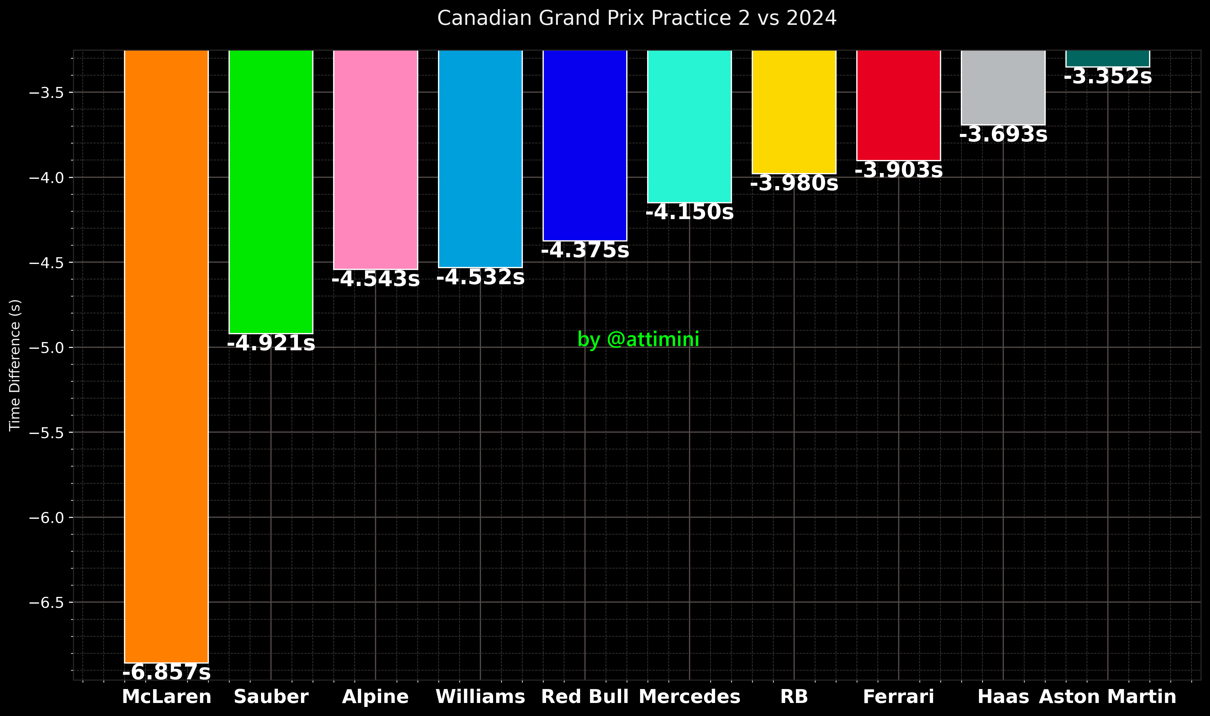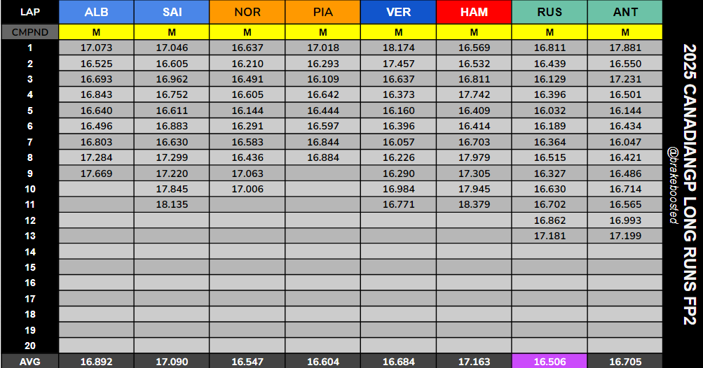 Ο Alex Albon επιβεβαίωσε ξανά ότι η ικανότητα της Williams στις ζώνες επιτάχυνσης και τις ευθείες αποδεικνύεται πολύ ανταγωνιστική στο Μόντρεαλ και σημείωσε και αυτός την ταχύτερη επίδοσή του με τη μέση γόμα. Μοναδικό ευτράπελο, ότι… προσπέρασε τα pits της ομάδας στο pit lane μία φορά. Ο team-mate του, Carlos Sainz βρέθηκε στην 7η θέση. Ο Fernando Alonso σημείωσε την 5η επίδοση με την Aston Martin, έχοντας χρησιμοποιήσει μόνο μαλακά ελαστικά σήμερα (4 σετ από τα 8 διαθέσιμα).