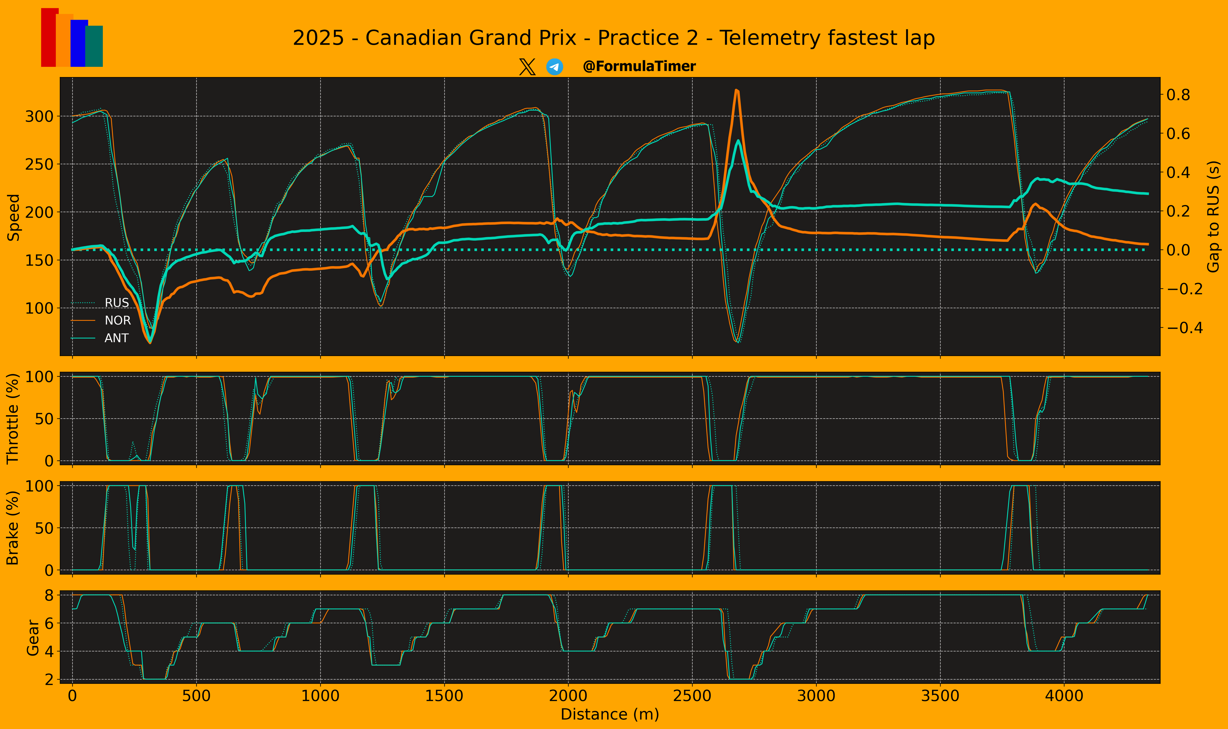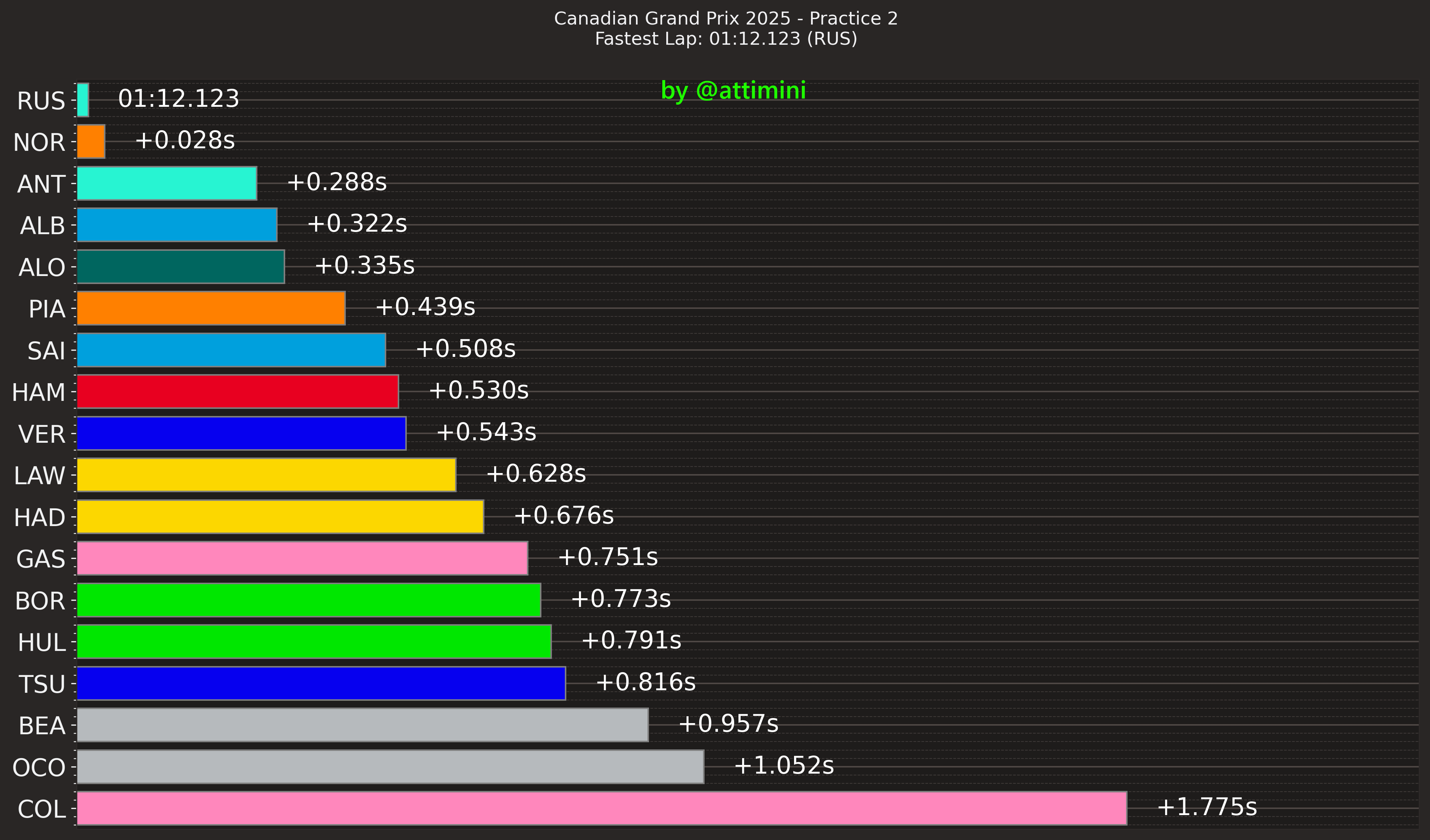 Με τη θερμοκρασία να υποχωρεί κάτω από τους 40 βαθμούς στο FP2 του Grand Prix Καναδά, η Mercedes βρέθηκε σε πρωταγωνιστικό ρόλο, με τον περυσινό poleman του Μόντρεαλ, George Russell, να σημειώνει την ταχύτερη επίδοση της ημέρας και μάλιστα με τη μέση γόμα ελαστικών, την οποία ο Βρετανός προτίμησε να χρησιμοποιήσει στο δεύτερο μισό της διαδικασίας. O Βρετανός δήλωσε ότι έκανε την ταχύτερη επίδοσή του με άδειο ρεζερβουάρ και μέγιστη ισχύ στον κινητήρα.