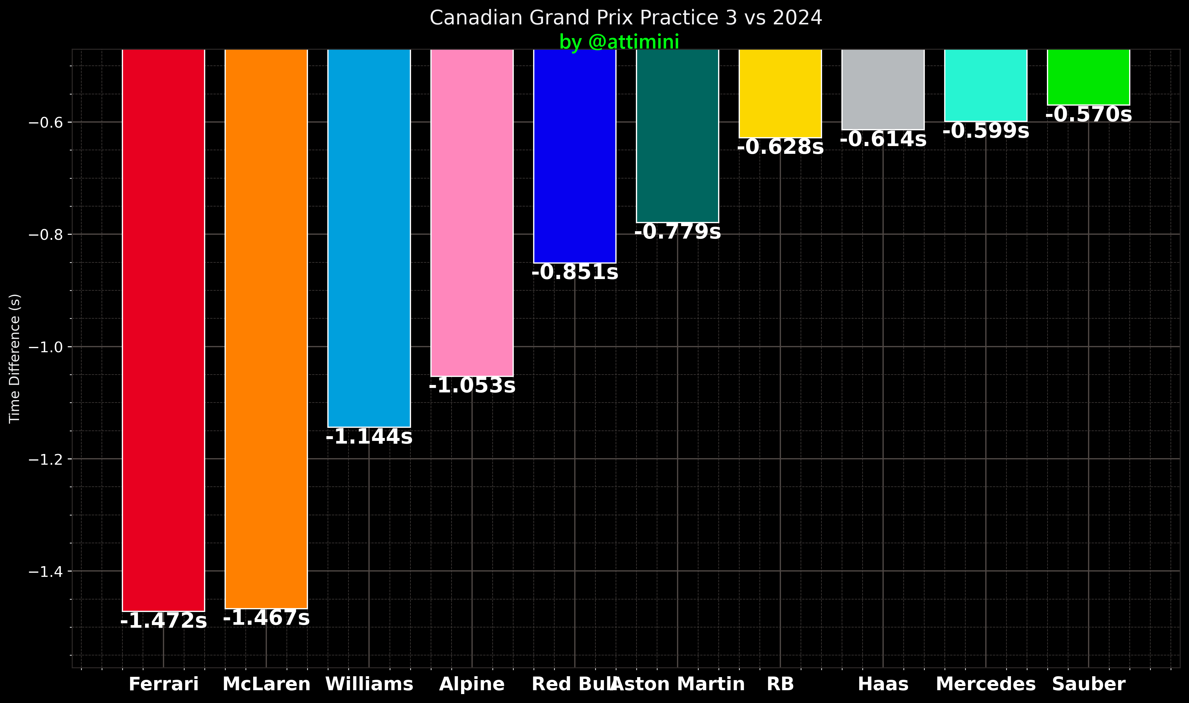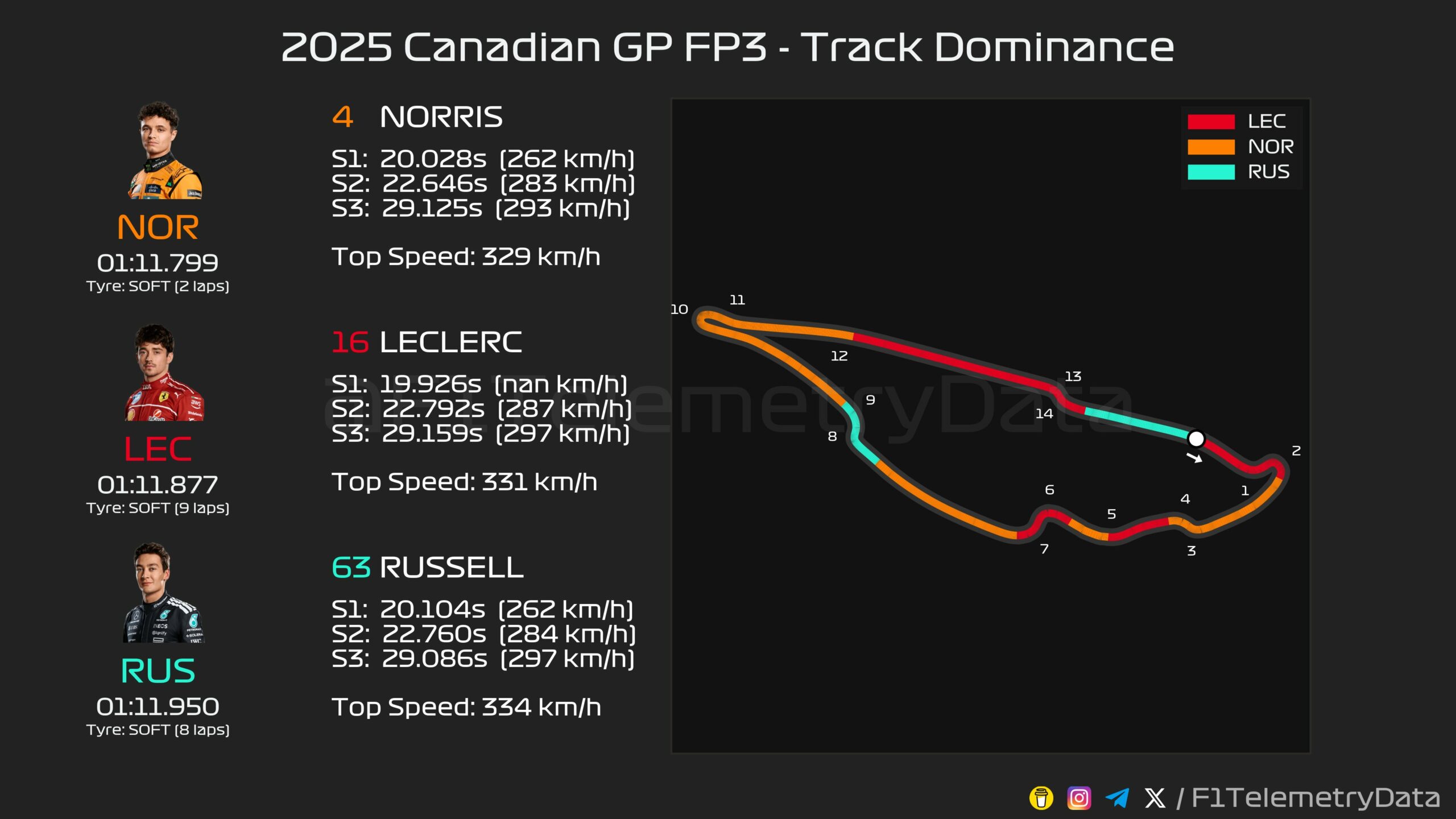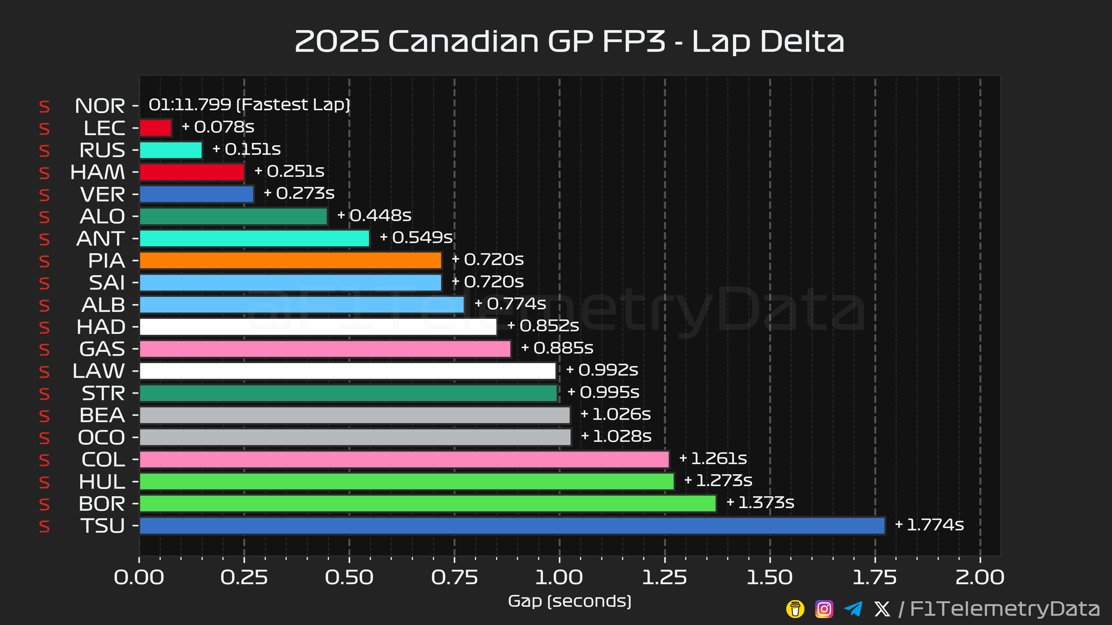 Η McLaren αποφάσισε να διατηρήσει τις αναβαθμίσεις αυτές, τις οποίες χρησιμοποιούσε μόνο ο Norris στο μονοθέσιό του στο FP3. Σε συνδυασμό με αυτό, η χάραξη της πίστας, με αργές κυρίως στροφές, όπου το μονοθέσιο δεν παραμένει πολύ χρόνο σε αυτές φαίνεται να ευνοεί το οδηγικό στυλ του Norris. Ο επικεφαλής της βαθμολογίας Oscar Piastri (του οποίου το οδηγικό στυλ φαίνεται να ταιριάζει καλύτερα σε γρήγορες στροφές, οι οποίες απουσιάζουν στο Μόντρεαλ) συνεχίζει να αντιμετωπίζει δυσκολίες να βρεθεί εντός του ιδανικού πλαισίου λειτουργίας των ελαστικών, καθώς κατέληξε στην 8η θέση.
