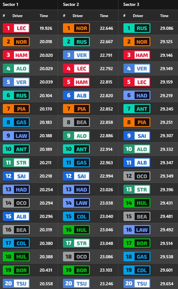 Πίσω από τον Piastri (8ος), οι δύο οδηγοί της Williams συμπλήρωσαν την πρώτη δεκάδα. Έπειτα από μία έξοδο στις στροφές 8/9 λίγο μετά το μέσο της διαδικασίας, ο Alex Albon ανέφερε ότι κάθε φορά που οδηγεί τη Williams, νιώθει σαν να βρίσκεται σε εντελώς διαφορετικό μονοθέσιο, κάτι που κανένας οδηγός δεν θέλει να συμβαίνει. Πίσω από τις Williams είδαμε τις Racing Bulls, με τον Pierre Gasly μεταξύ τους.
