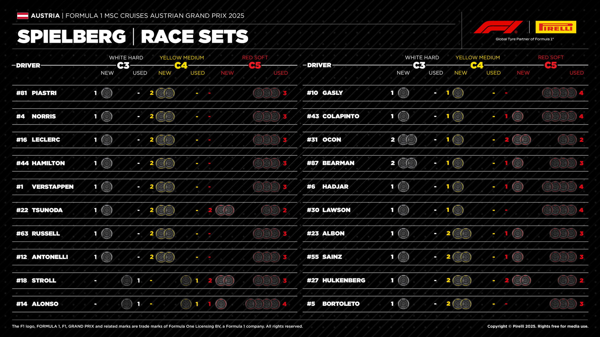 F1 Διαθέσιμα σετ ελαστικών GP Αυστρίας 2025