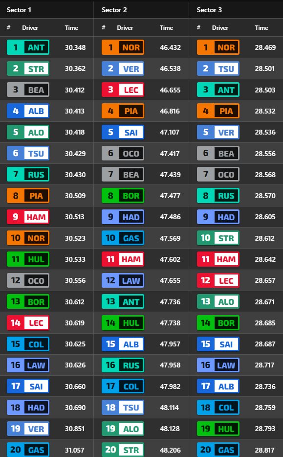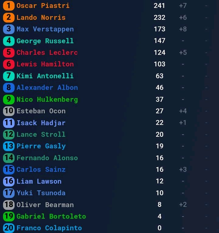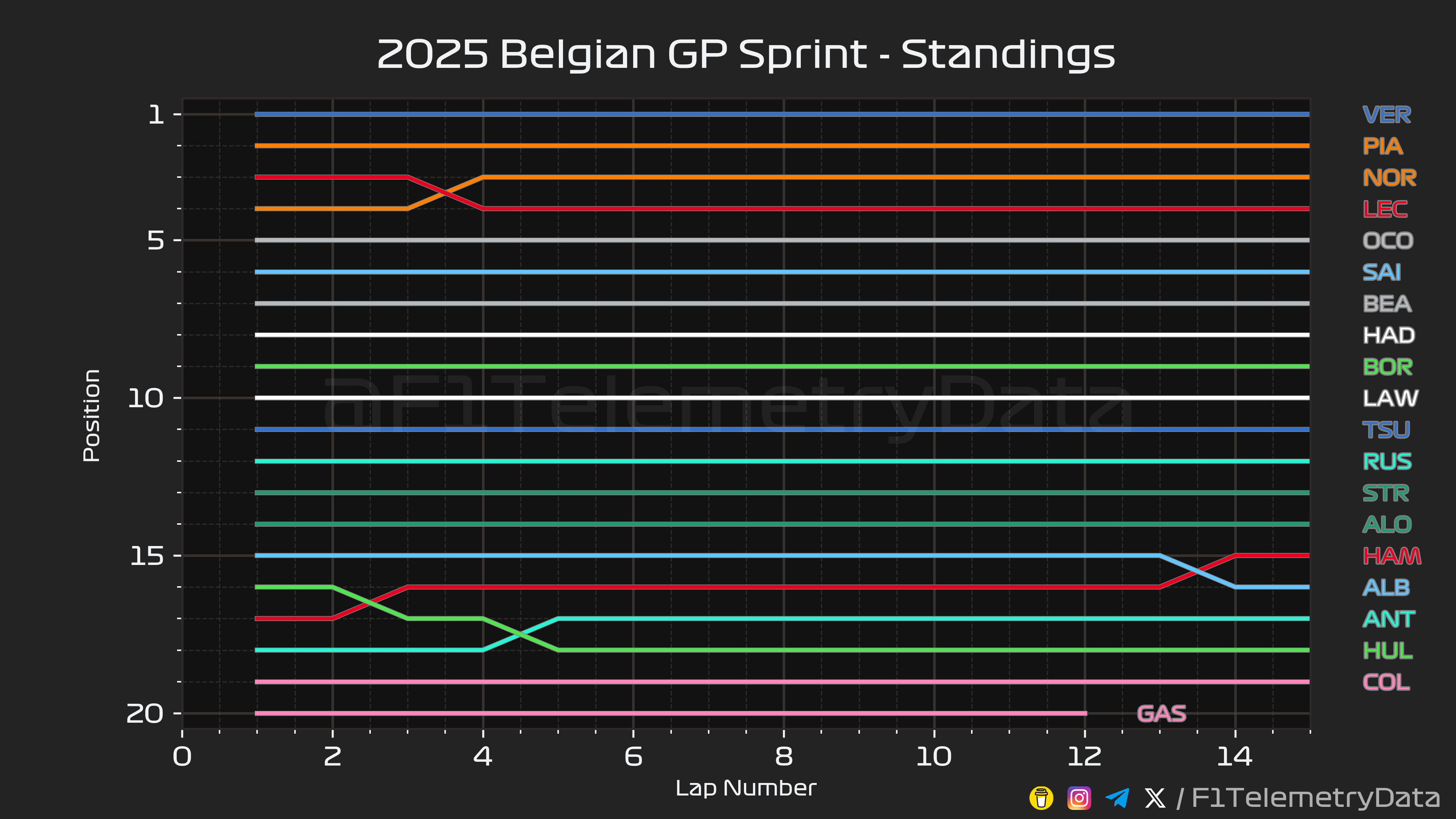 Στις πιο πίσω θέσεις, ο Lewis Hamilton ανέφερε ότι δεν είχε πρόσφυση στον πίσω άξονα από το μέσο του σπριντ, και βρέθηκε υπό την πίεση του Andrea Kimi Antonelli, αλλά κατάφερε να αντισταθεί και κατάφερε να πάρει τη 15η θέση από τον Alex Albon έπειτα από πολύ ωραία μάχη στον τελευταίο γύρο.