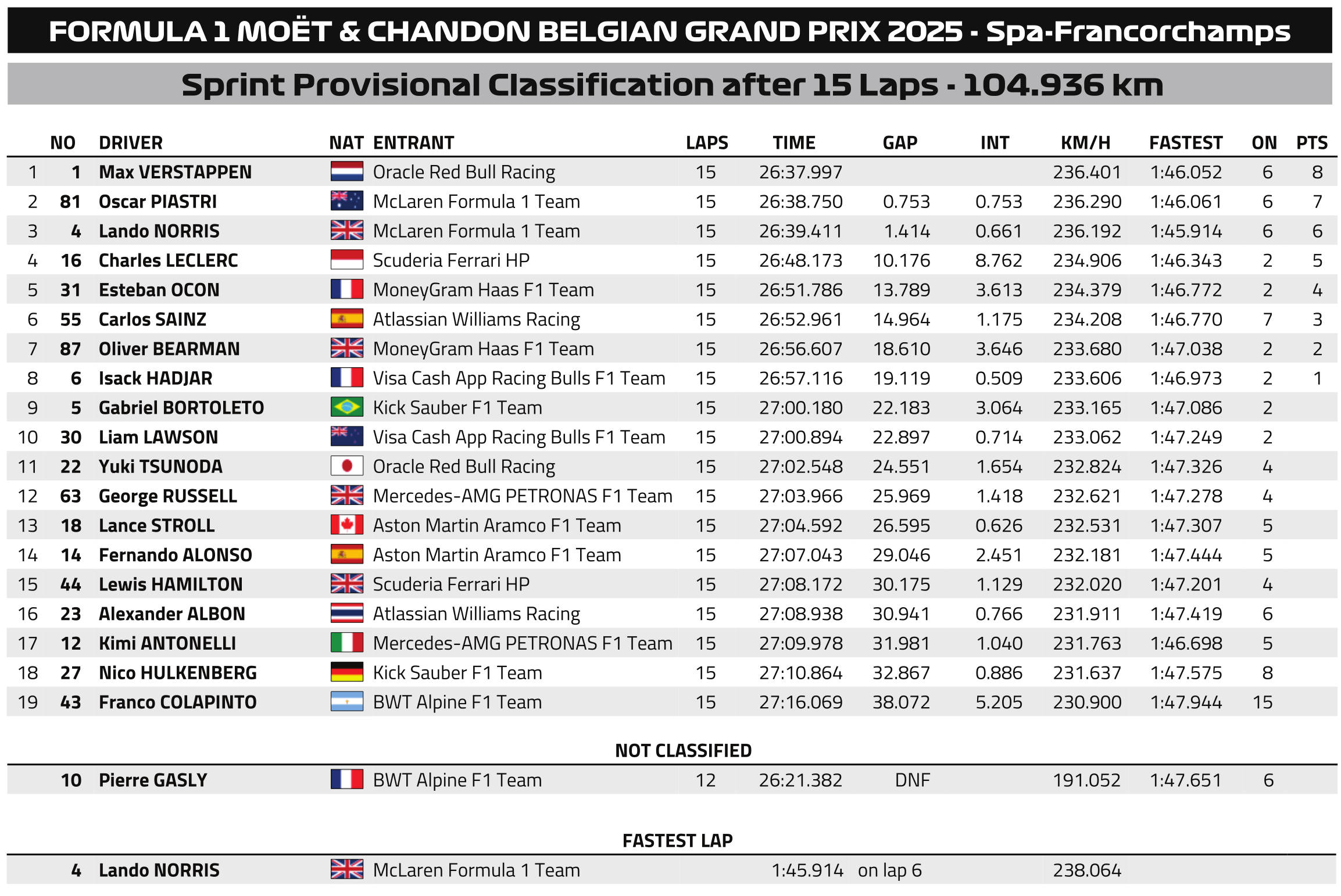 H Red Bull εισήλθε στη μετά Christian Horner εποχή με τον καλύτερο τρόπο στο σπριντ του Grand Prix Βελγίου, που ξεκίνησε το δεύτερο μισό της φετινής σεζόν της Formula 1, καθώς ο Max Verstappen κατάφερε να επικρατήσει. Ο Ολλανδός εκμεταλλεύτηκε το slipstream που του έδινε ο poleman, Oscar Piastri, στη μεγάλη ευθεία της Kemmel στον 1ο γύρο για να προσπεράσει από την εξωτερική στη Les Combes. Από εκεί και πέρα, ο Verstappen ήξερε τη να κάνει.
