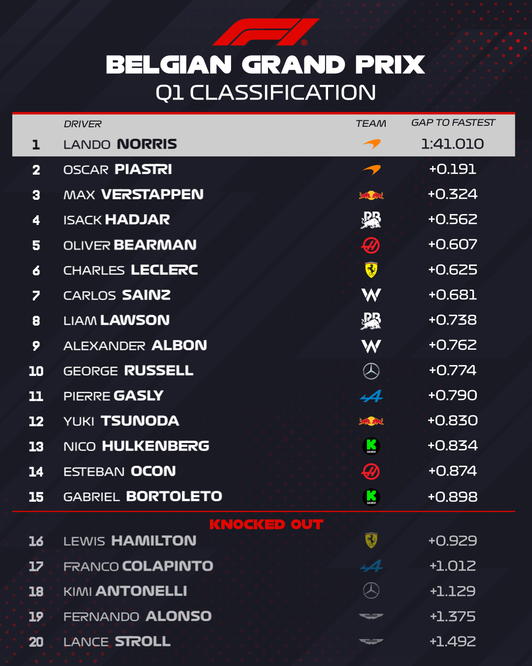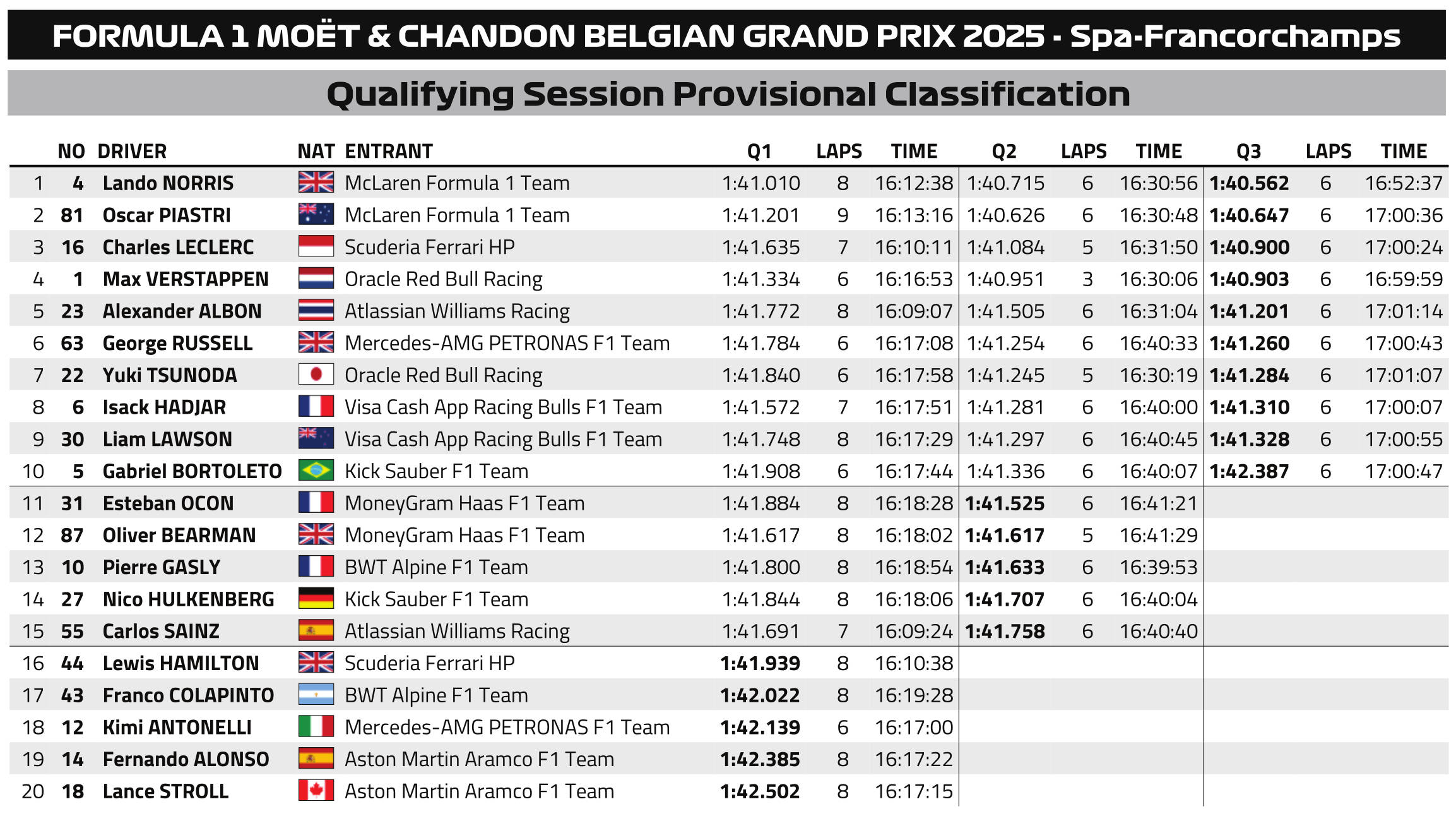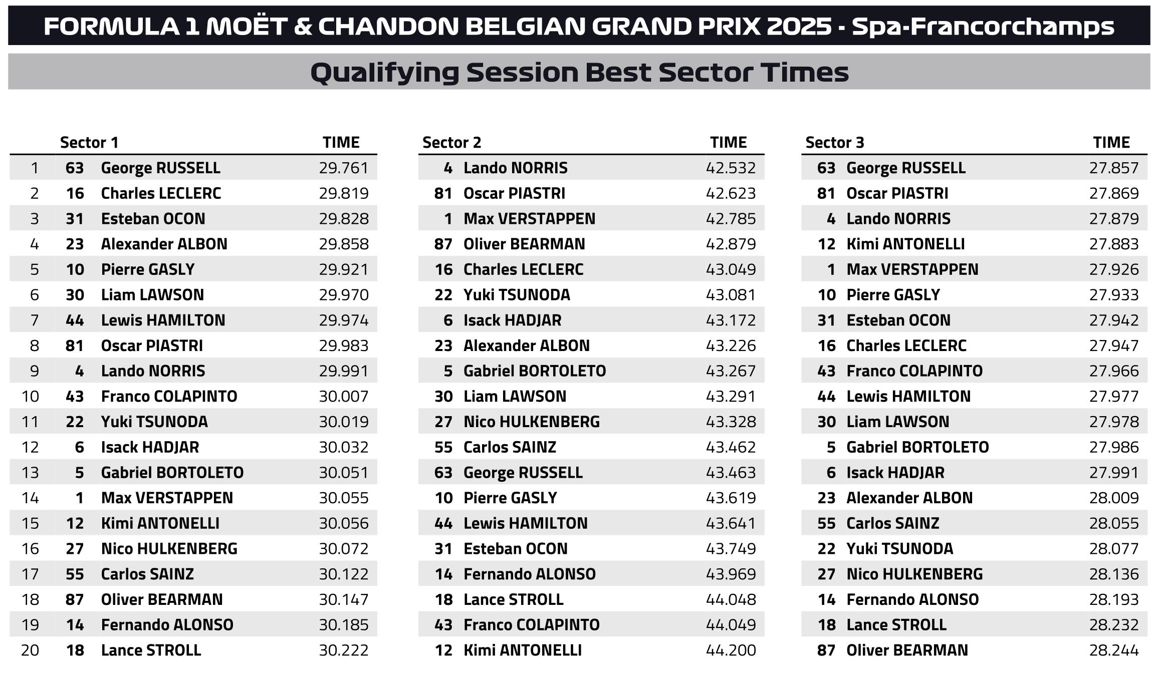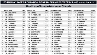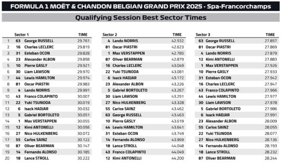 F1 Αποτελέσματα κατατακτήριων δοκιμών GP Βελγίου 2025