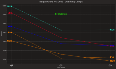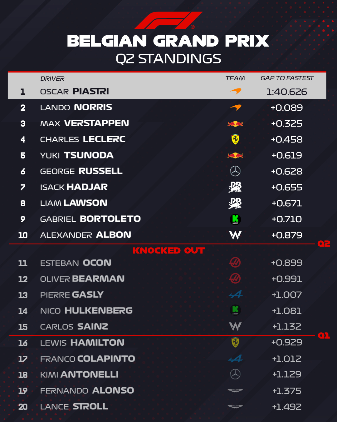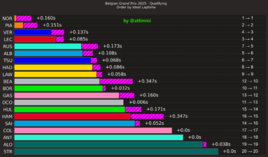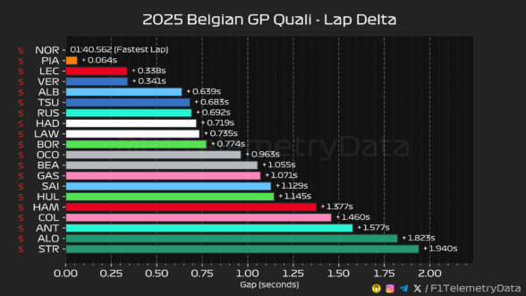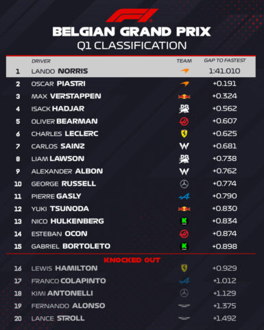Στο Q2 «έχασε» για μόλις 0,089 δλ. και στην πρώτη προσπάθεια του Q3 ήταν 0,189 δλ. ταχύτερος. O Piastri κατάφερε να πλησιάσει τον team-mate του στα 85 χλστ. του δλ. στην τελική του προσπάθεια, έχοντας κάνει ένα μικρό λάθος, διορθώνοντας υπερστροφή στην είσοδο της Stavelot. Ο Norris από την πλευρά του δεν κατάφερε να βελτιώσει την πρώτη του επίδοση, παρότι έγραψε το ταχύτερο μεσαίο sector.