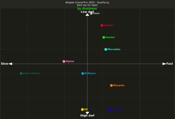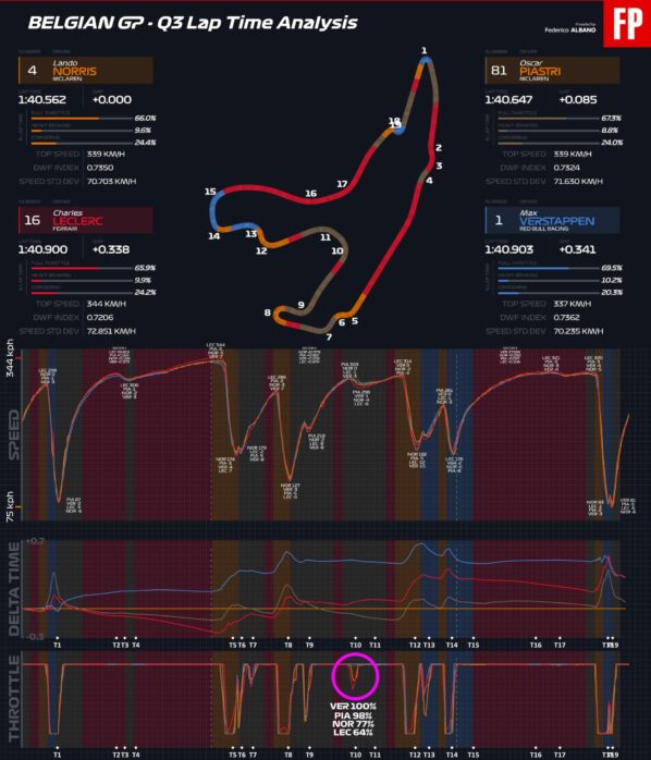 Ο Verstappen διέθετε μόνο ένα φρέσκο σετ ελαστικών μαλακής γόμας για το Q3, σε αντίθεση με τους οδηγούς της McLaren και τον George Russell. O τελικός γύρος του Ολλανδού δεν ξεκίνησε ιδανικά, καθώς είχε μία στιγμή υπερστροφής που προσπάθησε να ξεπεράσει σπινάροντας τα πίσω ελαστικά στην έξοδο της 1ης φουρκέτας (La Source), κάτι που του κόστισε καθ’ όλη τη διάρκεια των 23 δλ. με τέρμα γκάζι που ακολουθούν.