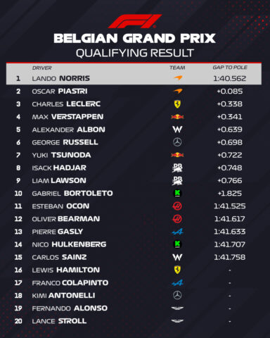 O Lando Norris κατέκτησε την pole position για το Grand Prix Βελγίου, κερδίζοντας την εσωτερική μονομαχία των οδηγών της McLaren για την επικράτηση στις κατατακτήριες δοκιμές. Ενώ σε όλες τις προηγούμενες διαδικασίες του αγωνιστικού τριημέρου ο Norris ήταν πιο αργός από τον team-mate του στη McLaren, ξεκίνησε τις κατατακτήριες δοκιμές όντας ταχύτερος από τον Oscar Piastri στο Q1.