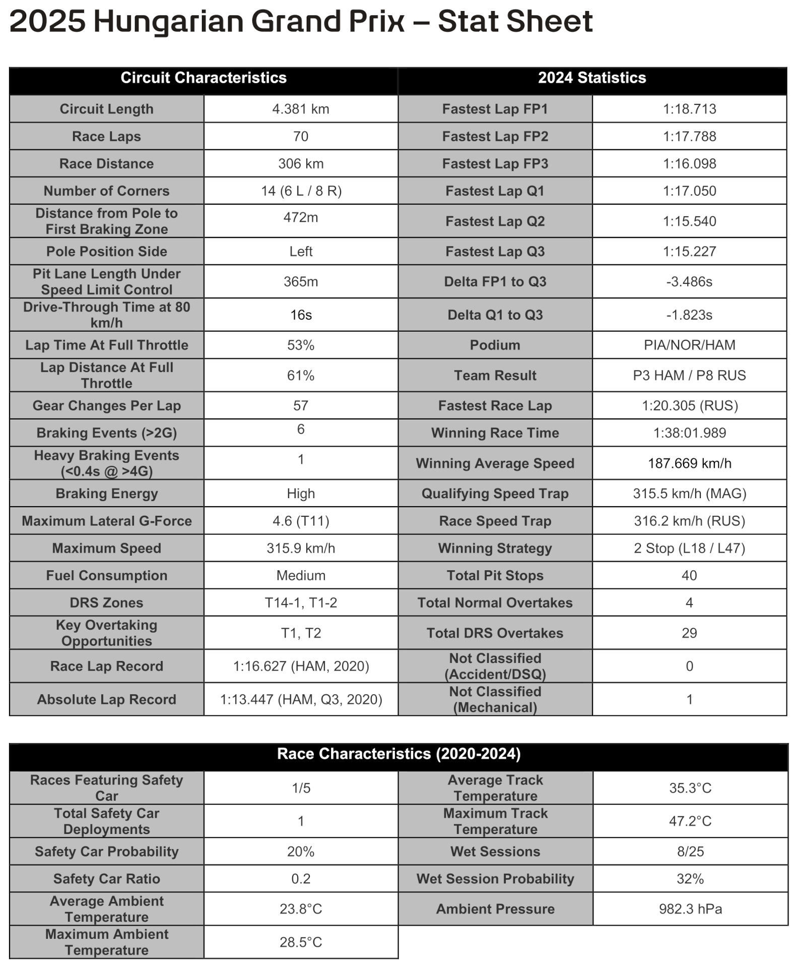 Δεδομένης της φύσης των στροφών που κυριαρχούν στη χάραξη (αργές και μέσης ταχύτητας), η McLaren είναι το ξεκάθαρο φαβορί όχι μόνο για να επικρατήσει, αλλά και για να κυριαρχήσει. Θα έχει ενδιαφέρον να παρακολουθήσουμε τη μάχη των δύο διεκδικητών του τίτλου, Oscar Piastri και Lando Norris, η διαφορά μεταξύ των οποίων στη βαθμολογία είναι 16 βαθμοί. Ενδέχεται οι πιο αργές στροφές του Hungaroring να ευνοήσουν περισσότερο το πιο επιθετικό (στην είσοδο των στροφών) στυλ οδήγησης του Norris έναντι του Piastri, ο οποίος αριστεύει σε πίστες με περισσότερες γρήγορες στροφές.