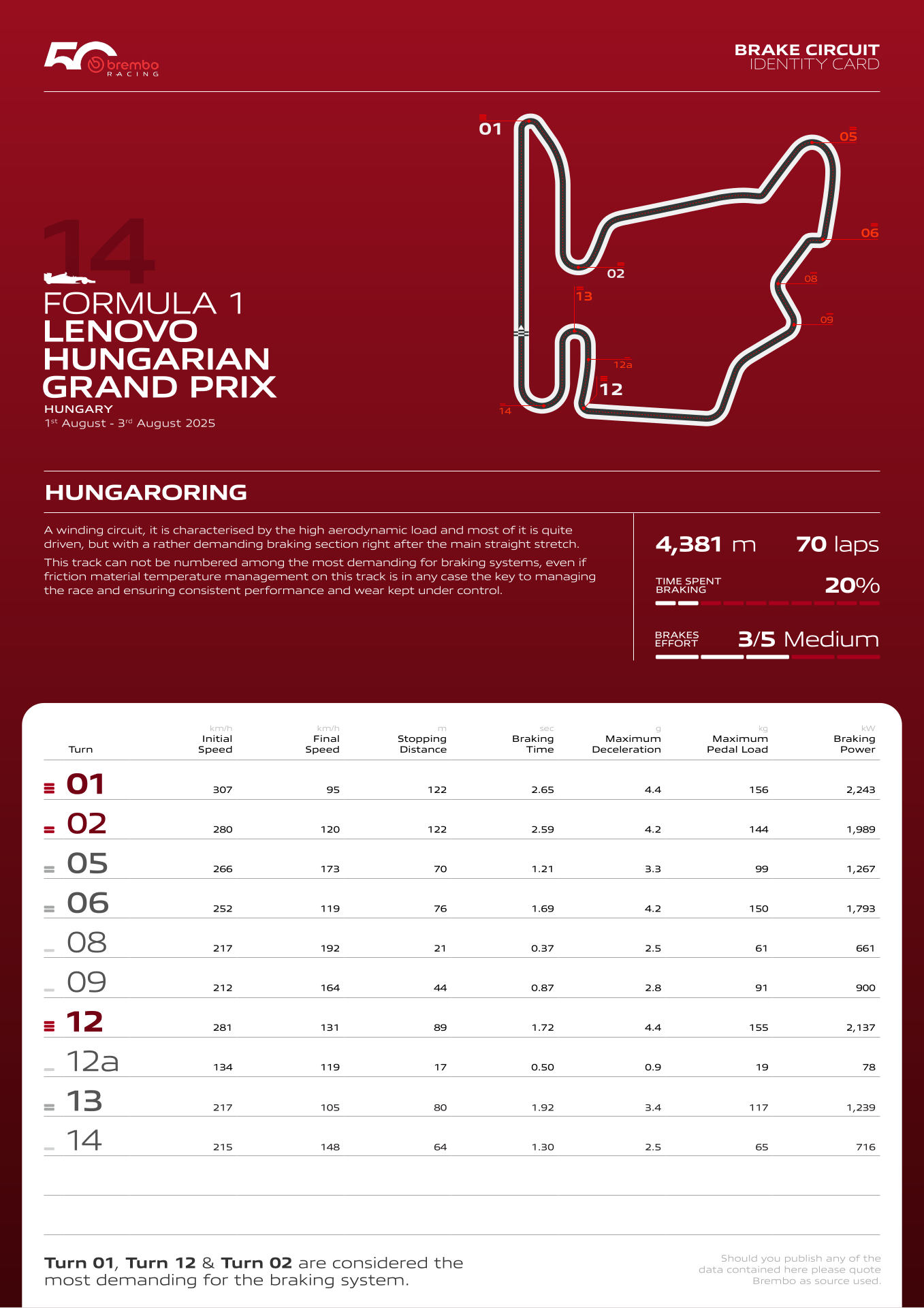 Συνεπώς, απαιτούνται μέγιστα επίπεδα αεροδυναμικού φορτίου και υπάρχει μόνο μία -σχετικά μικρή- ευθεία. Η μέγιστη ταχύτητα και οι χαμηλές τιμές οπισθέλκουσας δεν παίζουν σημαντικό ρόλο και η πίστα έχει ένα από τα χαμηλότερα ποσοστά της σεζόν με τέρμα γκάζι. Τα προσπεράσματα είναι αρκετά δύσκολα και η θέση στην εκκίνηση έχει μεγάλη σημασία. Παρ’ όλα αυτά, το Hungaroring πολλές φορές προσφέρει θεαματικούς αγώνες.