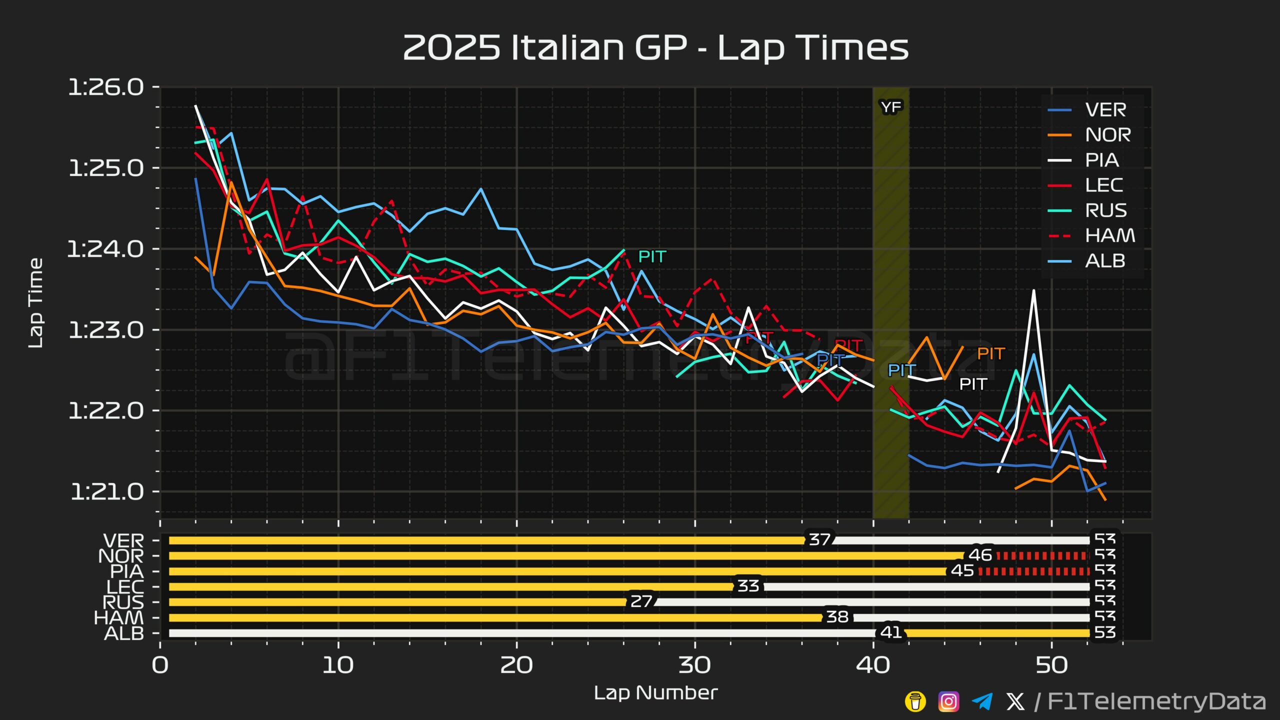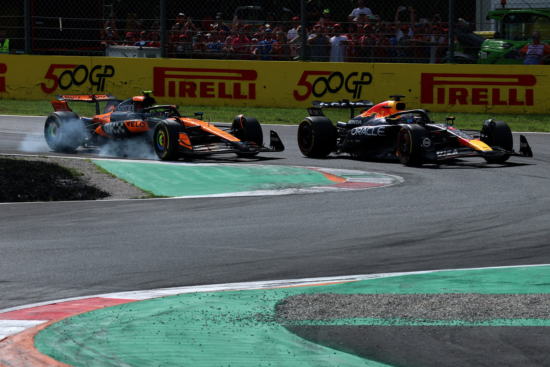 Ο Norris ήταν αρκετά επιθετικός στη μάχη του στους πρώτους γύρους με τον Verstappen, ρισκάροντας πολλά, χωρίς να κερδίσει κάτι τελικά, όπως δήλωσε. Την ίδια πυγμή έδειξε και ο Piastri στους πρώτους γύρους, παρότι αμφότεροι δεν θέλουν να χάσουν βαθμούς. Προσπέρασε από την εξωτερική στην 1η Lesmo τον Leclerc, από τον οποίο είχε χάσει την 3η θέση στο πρώτο chicane. Όταν ο Verstappen παραχώρησε την πρωτοπορία στον Norris, ο Piastri προσπάθησε να επωφεληθεί στην 1η στροφή, αλλά αυτό έδωσε την ευκαιρία στον Leclerc να ανακτήσει την 3η θέση.