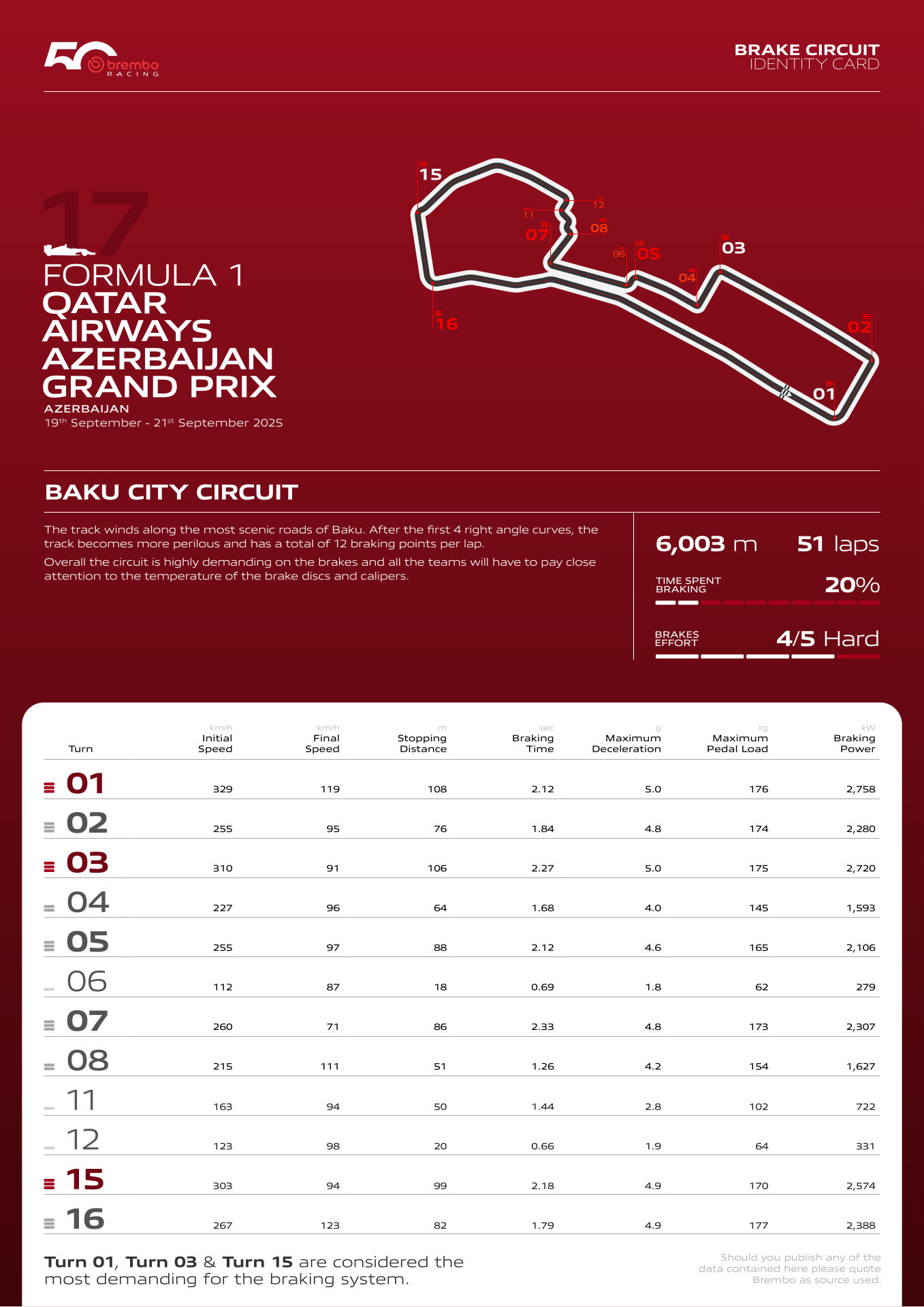 Με 9 ζώνες πέδησης που ξεπερνούν τα 2 G, περισσότερες από οποιαδήποτε άλλη πίστα, το Μπακού δοκιμάζει τόσο τα φρένα, όσο και το σύστημα ανάκτησης ενέργειας. Οι υψηλές ταχύτητες που επιτυγχάνονται στην ευθεία εκκίνησης/τερματισμού δοκιμάζουν τα ελαστικά, ειδικά με το αεροδυναμικό φορτίο που αναπτύσσουν τα σύγχρονα μονοθέσια.