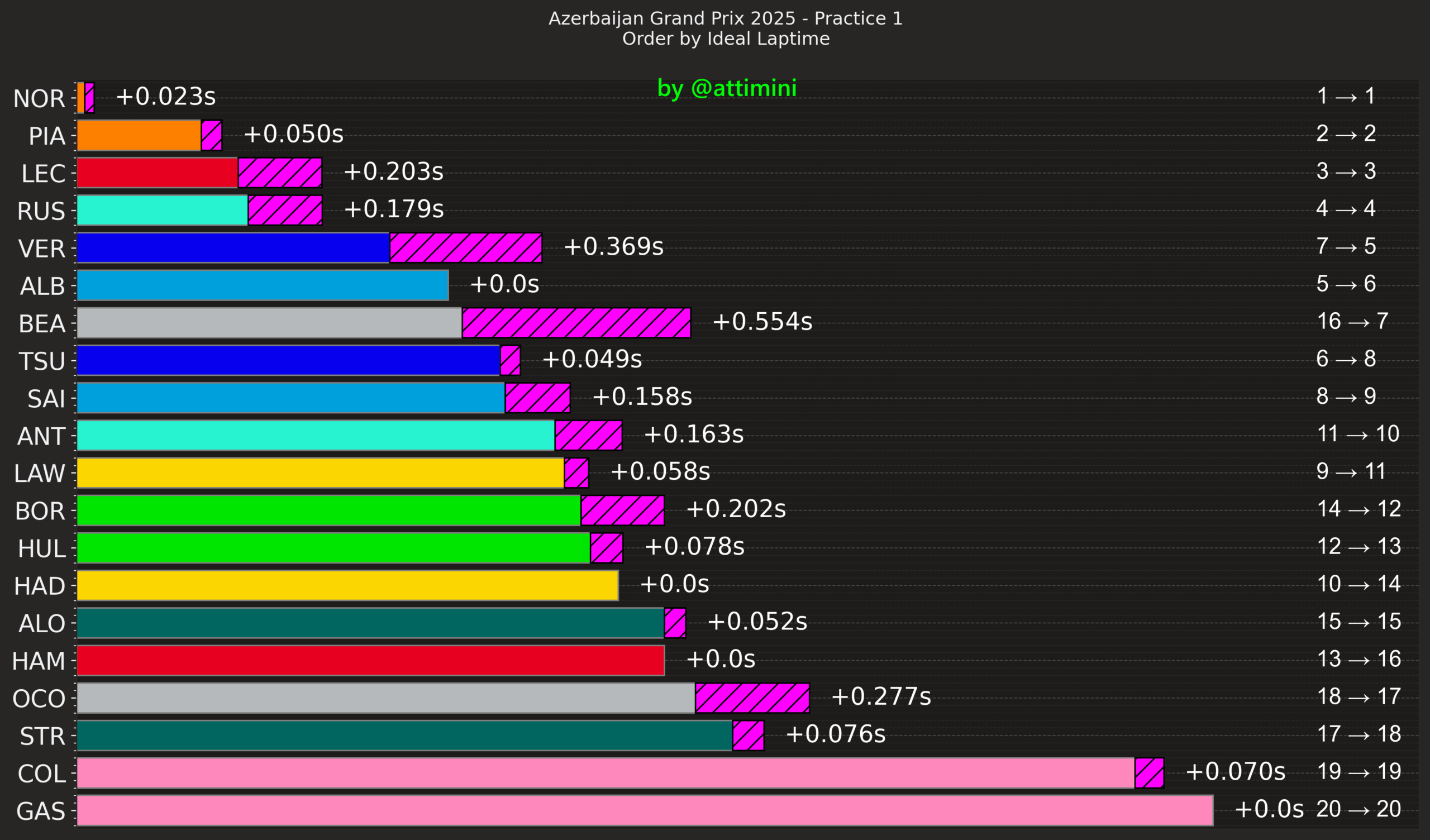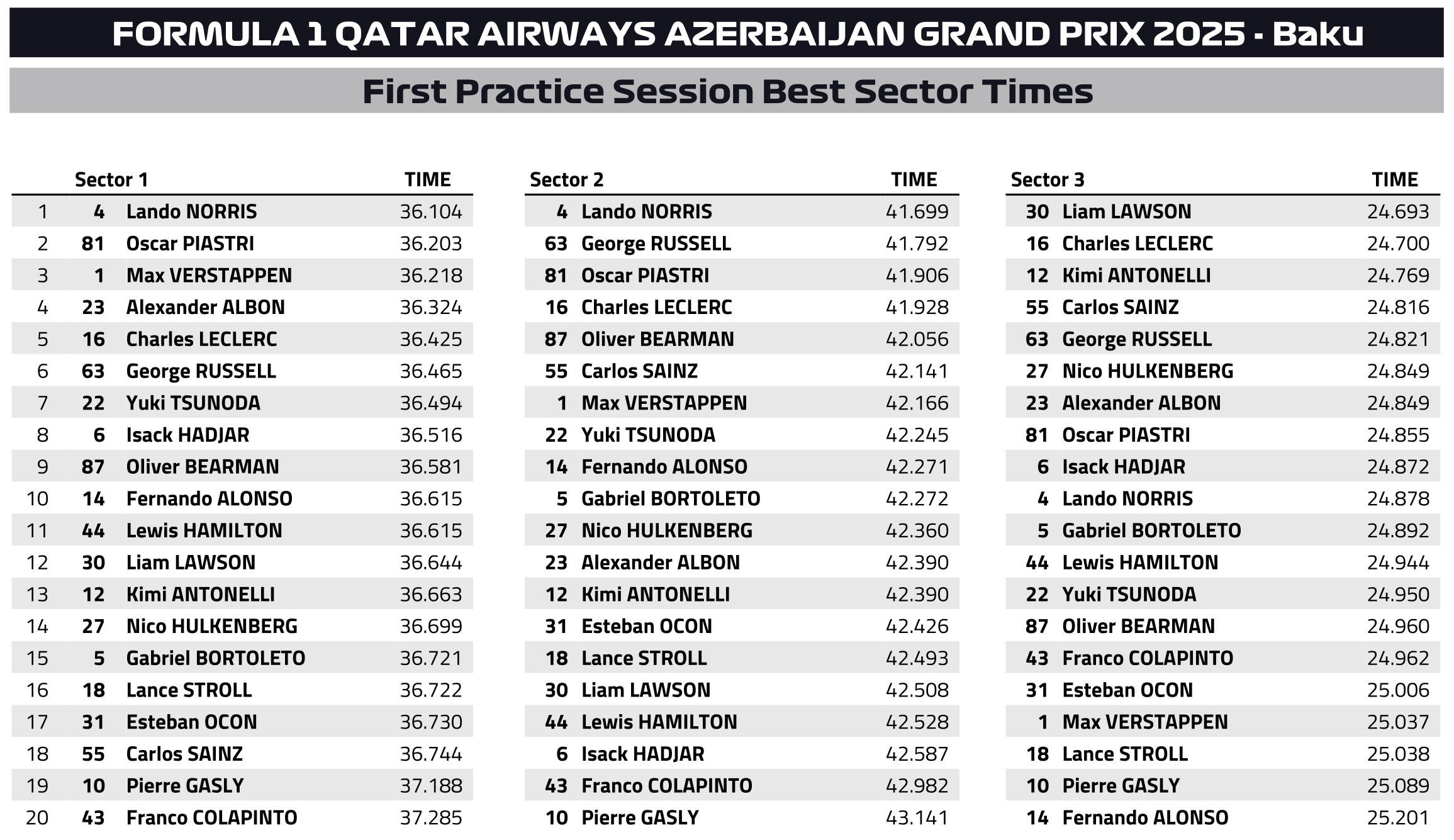 Βέβαια, το πρόγραμμα του Piastri βρισκόταν αρκετά πίσω από αυτό του Norris. Στο τέλος, o Piastri, στην πρώτη του προσπάθεια με το δεύτερο σετ μαλακής γόμας ελαστικών, χτύπησε με τον πίσω δεξιό τροχό τις μπαριέρες TecPro στην έξοδο της στροφής 15, κάτι που δικαιολογεί περαιτέρω τη διαφορά 0,31 δλ. που τον χωρίζει από τον Norris.