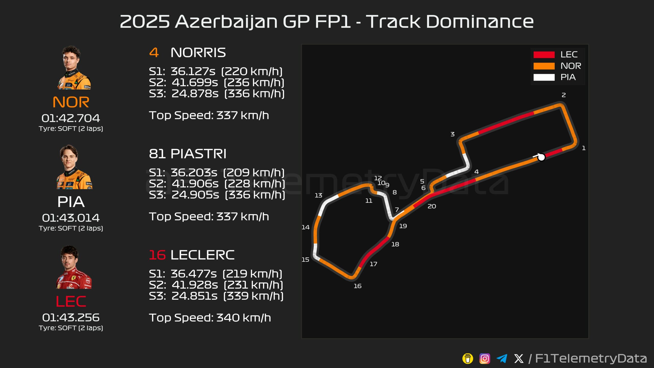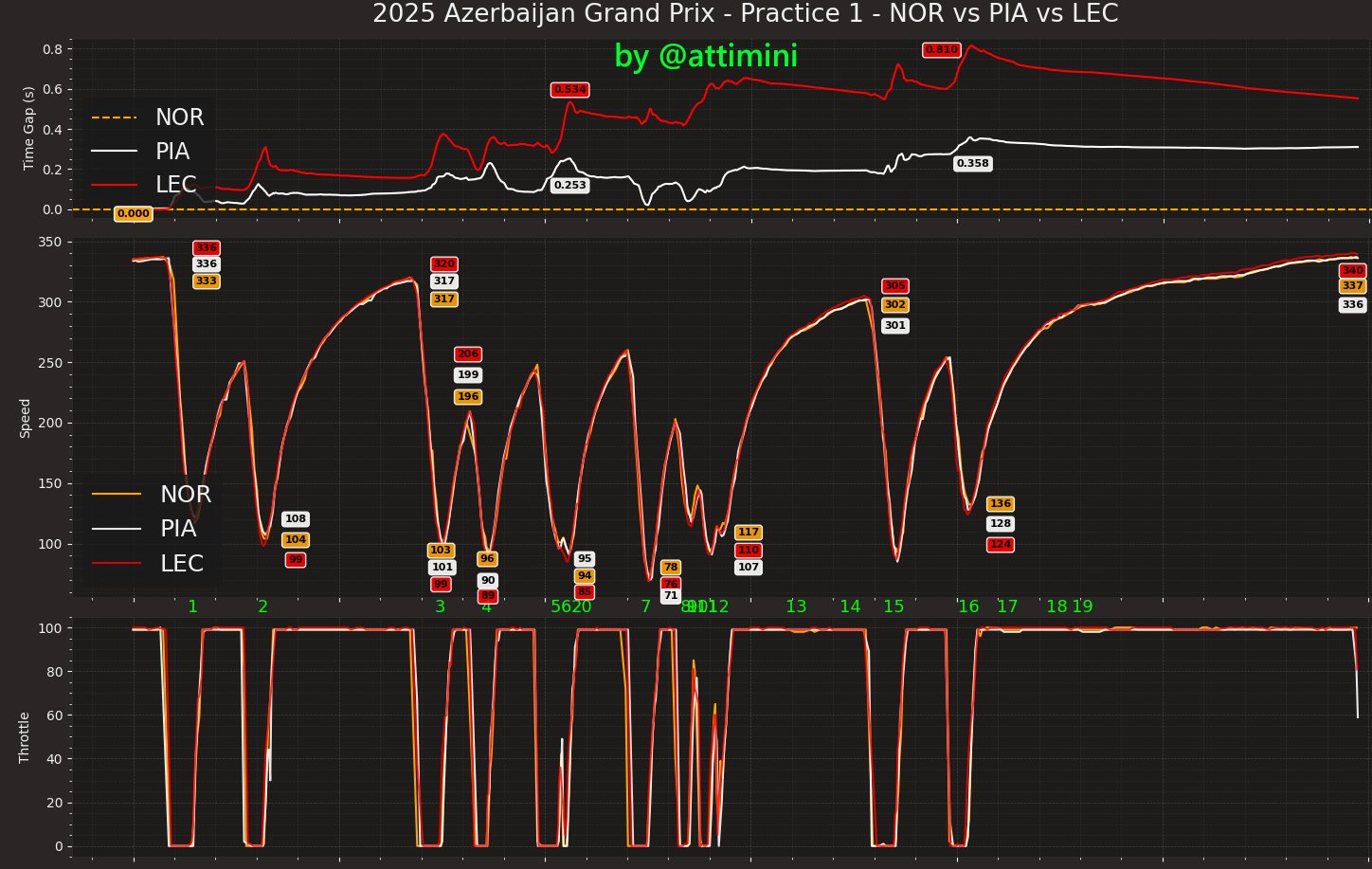 Η McLaren διαθέτει το ταχύτερο μονοθέσιο στις αργές στροφές, όπου η Mercedes υπερέχει επί της Ferrari. Το ιταλικό μονοθέσιο ανακτά έδαφος όμως στις ευθείες και ο σπεσιαλίστας στον ένα γρήγορο γύρο στο Μπακού, Charles Leclerc, κατάφερε να κινηθεί μόλις 0,001 δλ. ταχύτερα από τον George Russell στη μάχη για την 3η θέση. Ωστόσο, αμφότεροι βρίσκονταν 0,55 δλ. μακριά από τις McLaren.