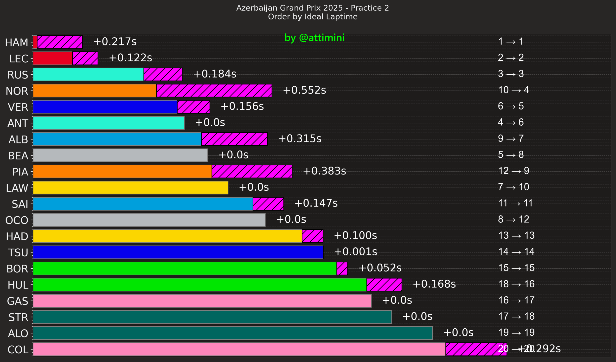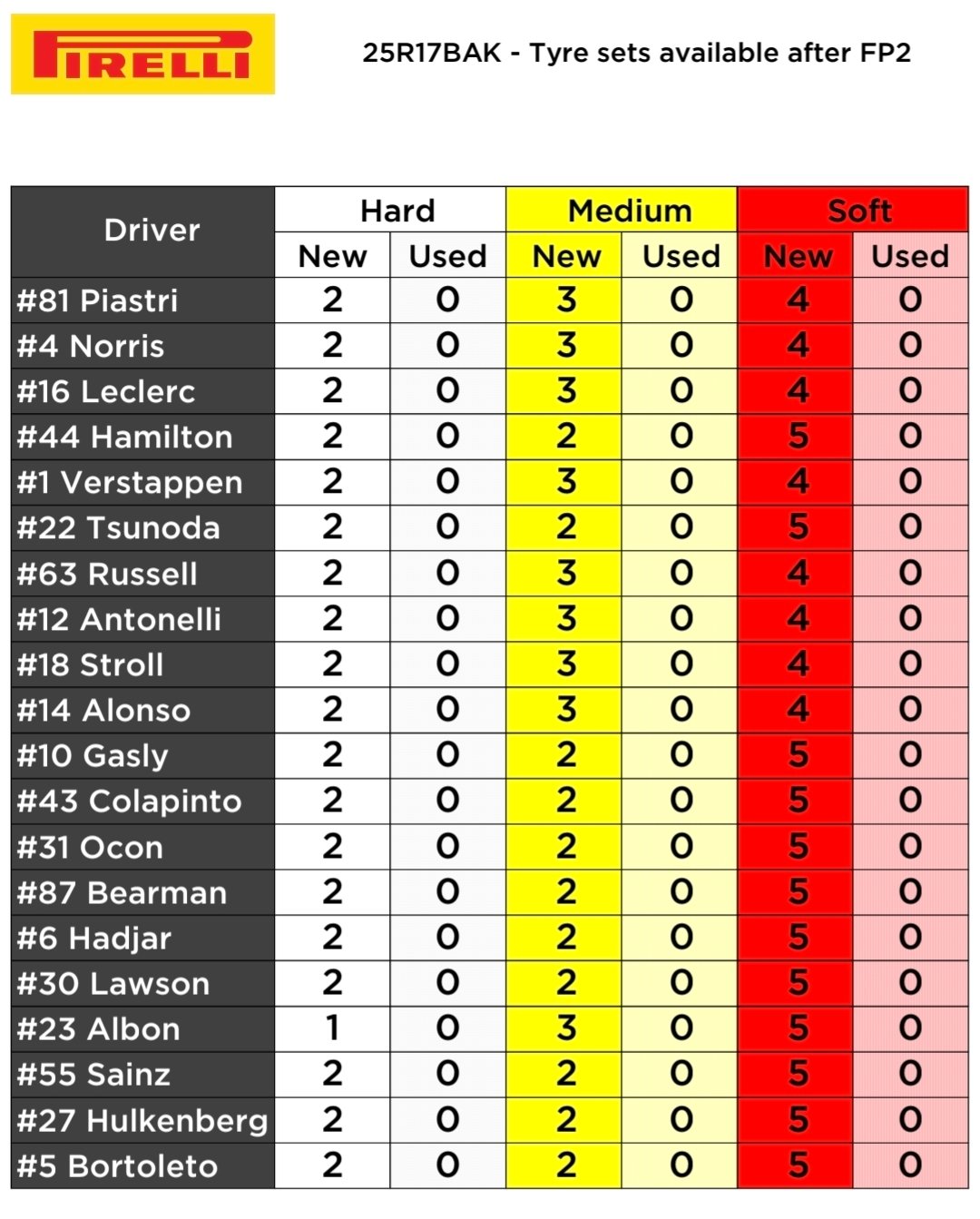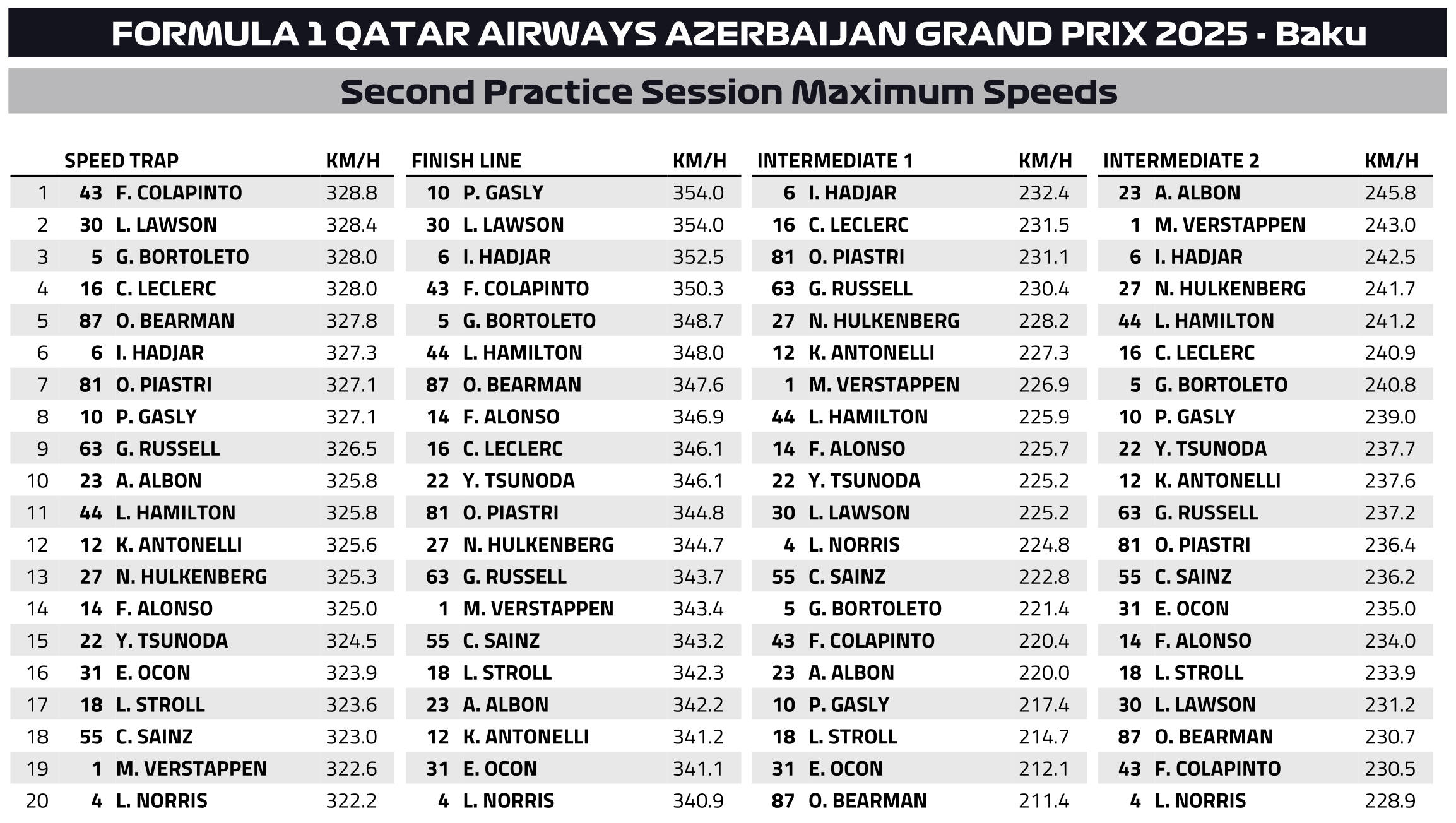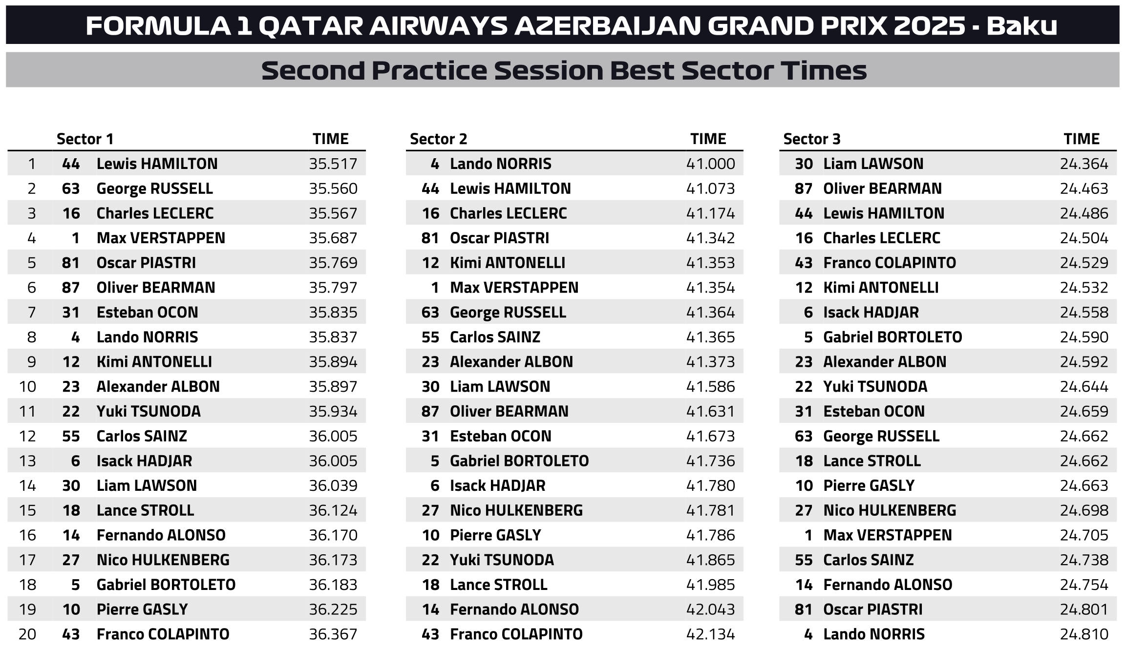 Εντέλει, ο Norris κατετάγη στη 10η θέση και ο Piastri 12ος στον πίνακα των χρόνων, όπου τις Ferrari ακολούθησαν οι δύο οδηγοί της Mercedes, με τον George Russell ταχύτερο, αλλά για μόλις 0,009 δλ. από τον 19χρονο Andrea Kimi Antontelli.