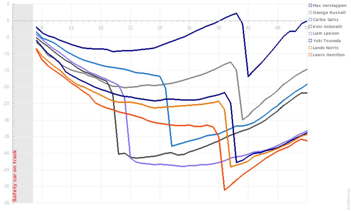 Ο Russell στριμώχτηκε, έχασε φόρα, και αυτό επέτρεψε στον Tsunoda να τον περάσει ξανά. Ο Βρετανός κατάφερε να προσπεράσει ξανά τη Red Bull του Ιάπωνα στο 10ο γύρο. Στη συνέχεια, ζήτησε από την ομάδα της Mercedes να τον φέρει μπροστά από τον Antonelli, για να κυνηγήσει τον Liam Lawson που βρισκόταν στην 3η θέση. Η Mercedes κάλεσε στα pits τον Ιταλό στον 18ο γύρο και ο δρόμος άνοιξε πλήρως για τον Russell όταν και η Racing Bulls έφερε στα pits τον Lawson στον 20ό γύρο.
