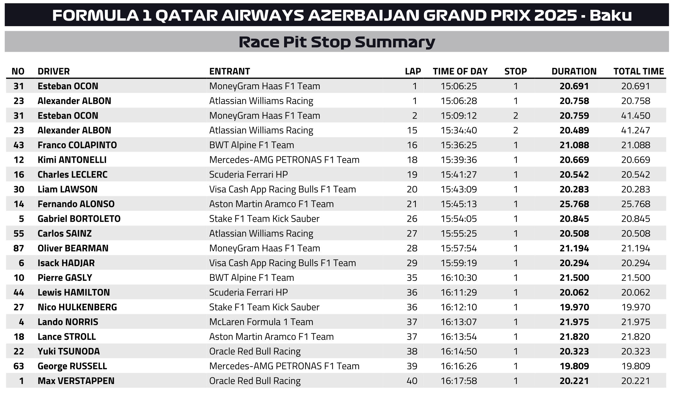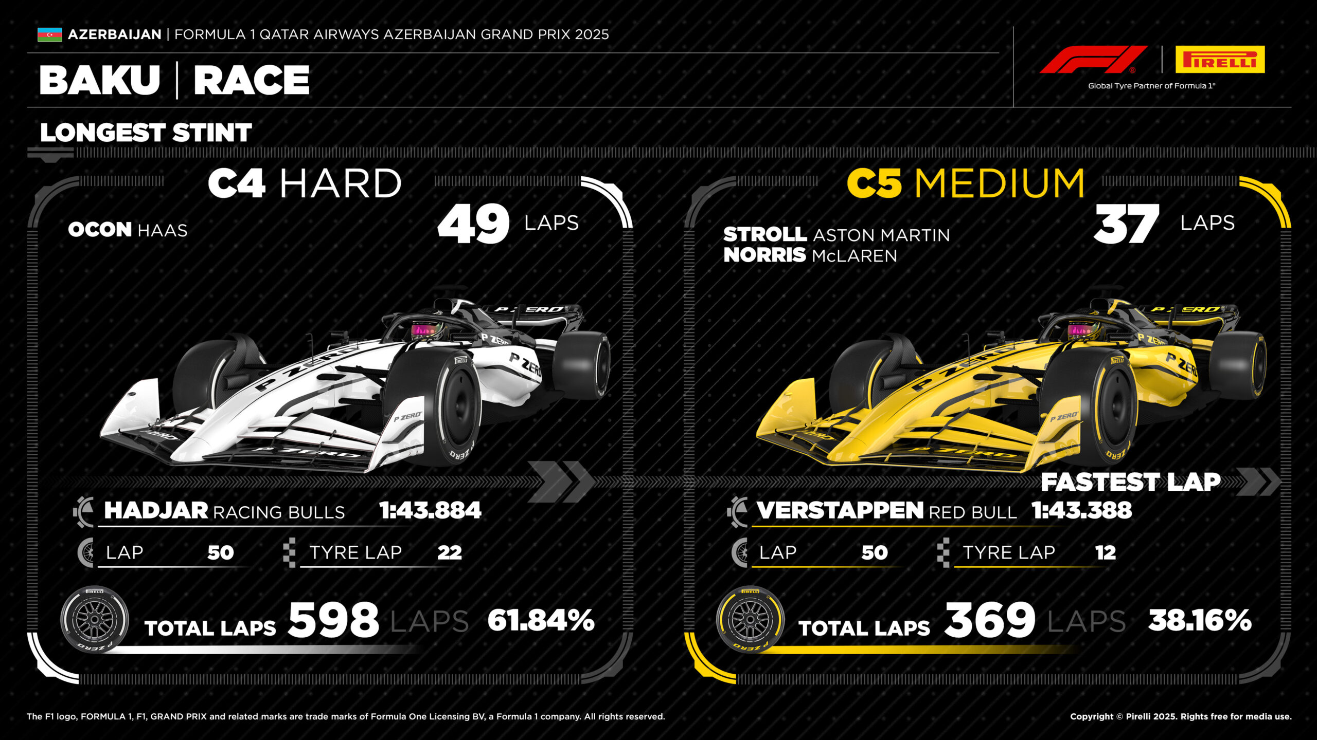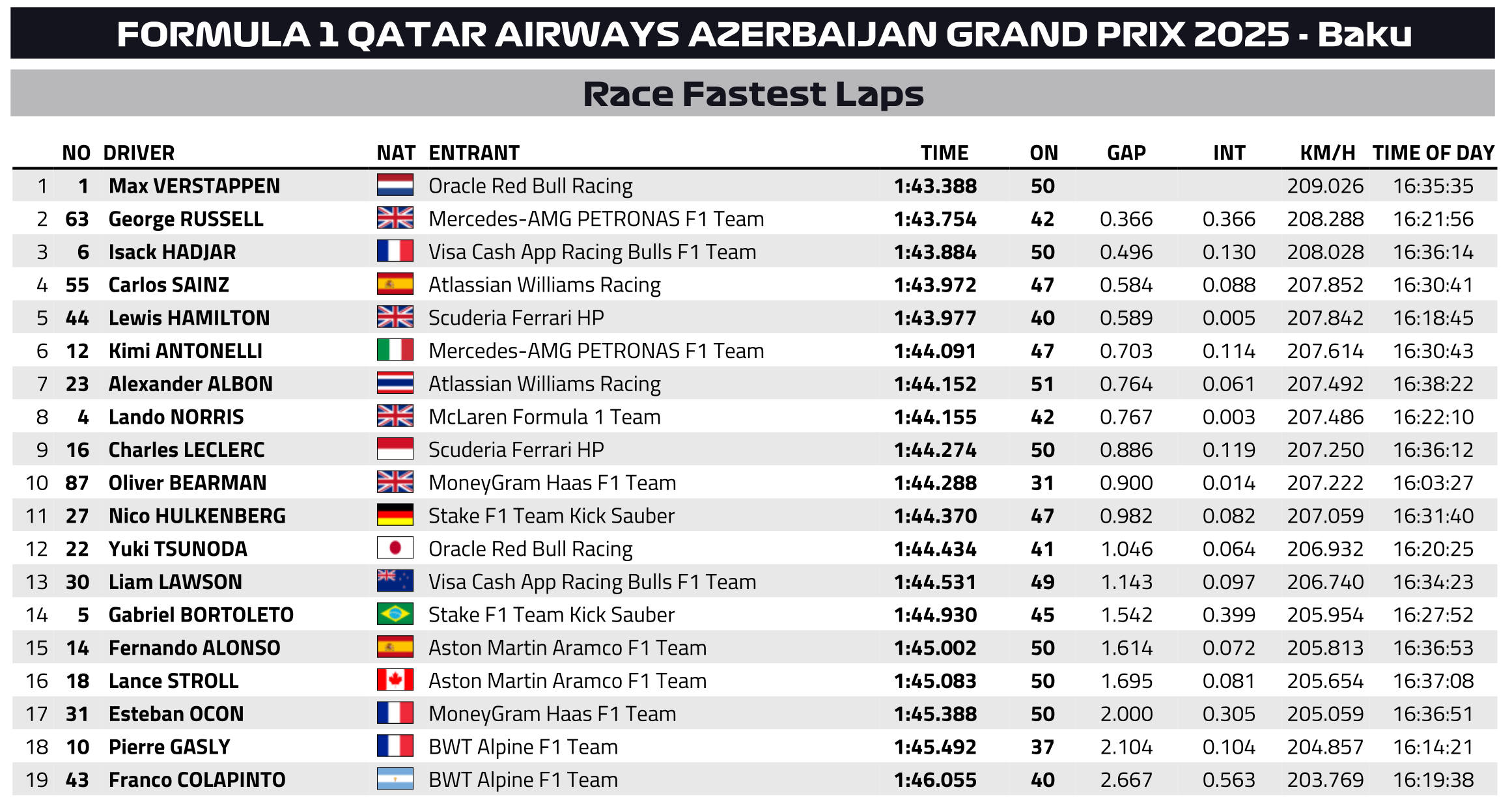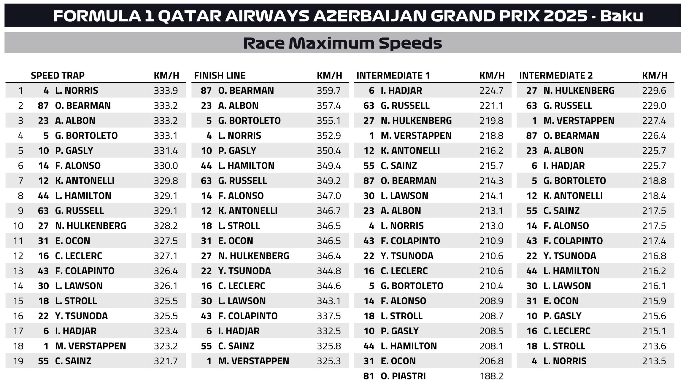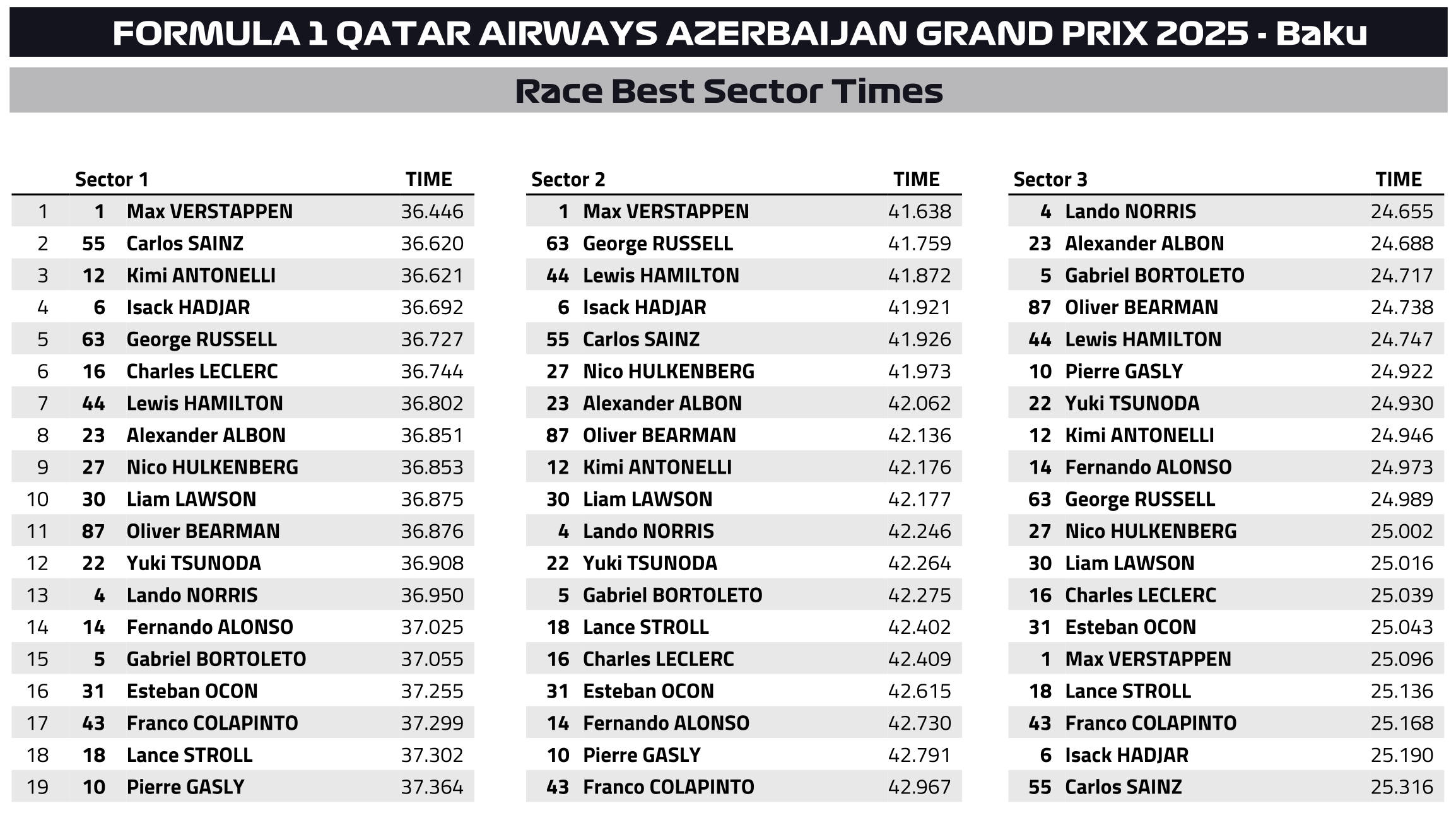 O Max Verstappen κατέκτησε για πρώτη φορά φέτος συνεχόμενες νίκες στο Grand Prix Αζερμπαϊτζάν και όχι μόνο αυτό: πέτυχε το 6ο grand slam της καριέρας του στη Formula 1 (ισοφαρίζοντας τον Hamilton στη 2η θέση όλων των εποχών, πίσω από τον Jim Clark – με 8), καθώς πήρε pole position, νίκη, σημείωσε τον ταχύτερο γύρο και ήταν επικεφαλής καθ’ όλη τη διάρκεια του αγώνα. Μάλιστα, ο Ολλανδός έχει βρεθεί επικεφαλής φέτος για περισσότερους αγωνιστικούς γύρους από τον Lando Norris.