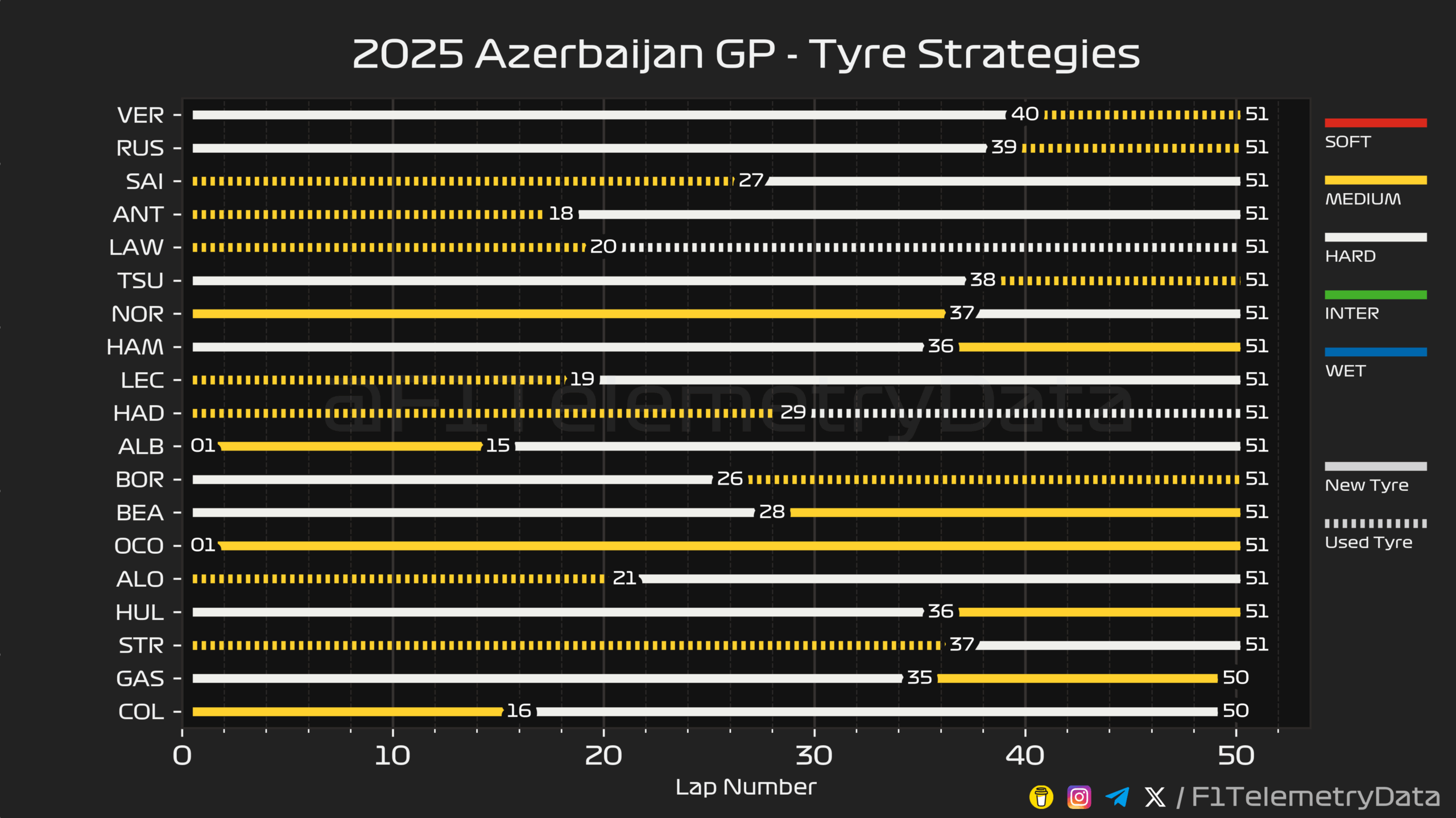 Ο Verstappen, έχοντας εκκινήσει με τη σκληρή γόμα, χωρίς δυνατούς αντιπάλους γύρω του, είχε τη δυνατότητα να ακολουθήσει συντηρητικό ρυθμό στους αρχικούς γύρους, για να επεκτείνει τη ζωή των ελαστικών του και να κυριαρχήσει απόλυτα, χωρίς να υπάρχει κάποιος να τον απειλήσει. Η στρατηγική ήταν ιδανική και με τη Red Bull να βλέπει ότι δεν είχε επικίνδυνους αντιπάλους στη σειρά εκκίνησης, έκανε τη σωστή επιλογή να εκκινήσει με τη σκληρή γόμα, επιλογή που αποδείχθηκε ότι η καλύτερη στρατηγική.