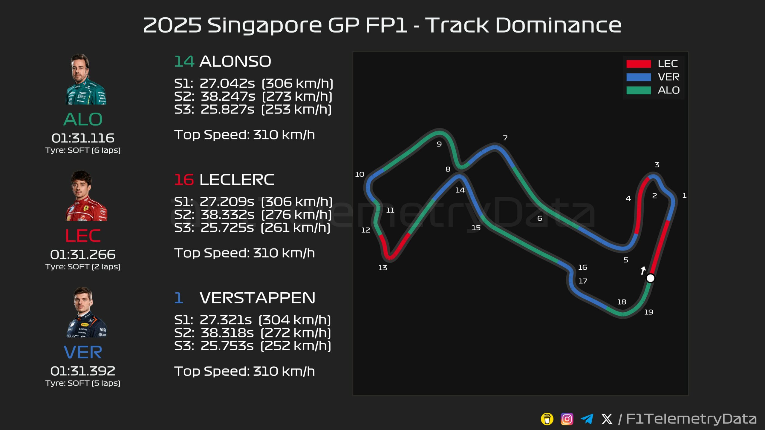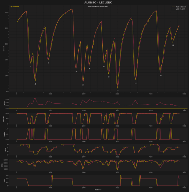 Ο Leclerc ξεκίνησε το δεύτερο γύρο του με ταχύτερο πρώτο sector, αλλά έπειτα από ένα γλίστρημα, εγκατέλειψε την προσπάθεια. H Ferrari έχει καλή μηχανική πρόσφυση, η οποία μπορεί να βοηθήσει πολύ στη Σιγκαπούρη. Στο τέλος, ο Alonso κινήθηκε 0,15 δλ. ταχύτερα από τον Leclerc.