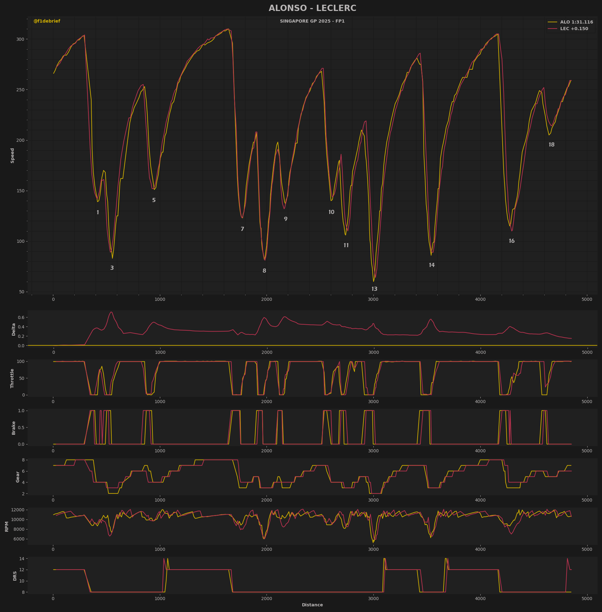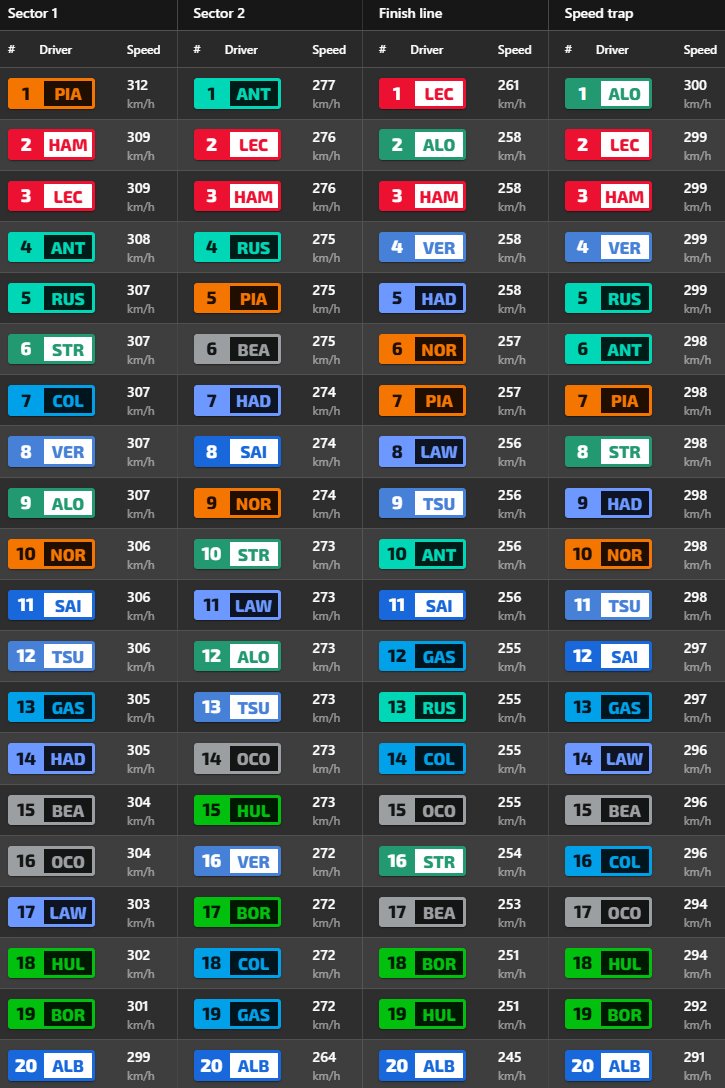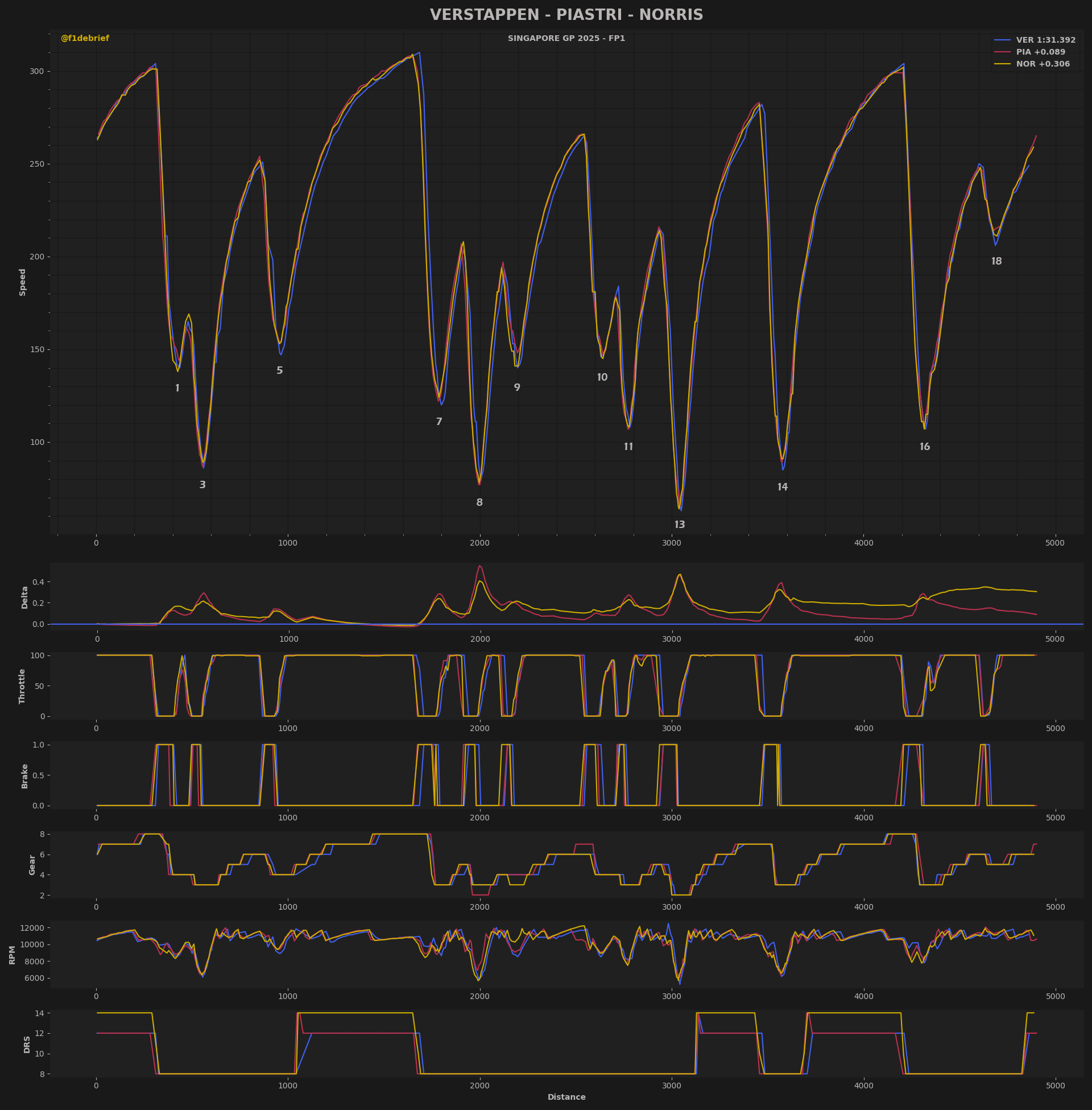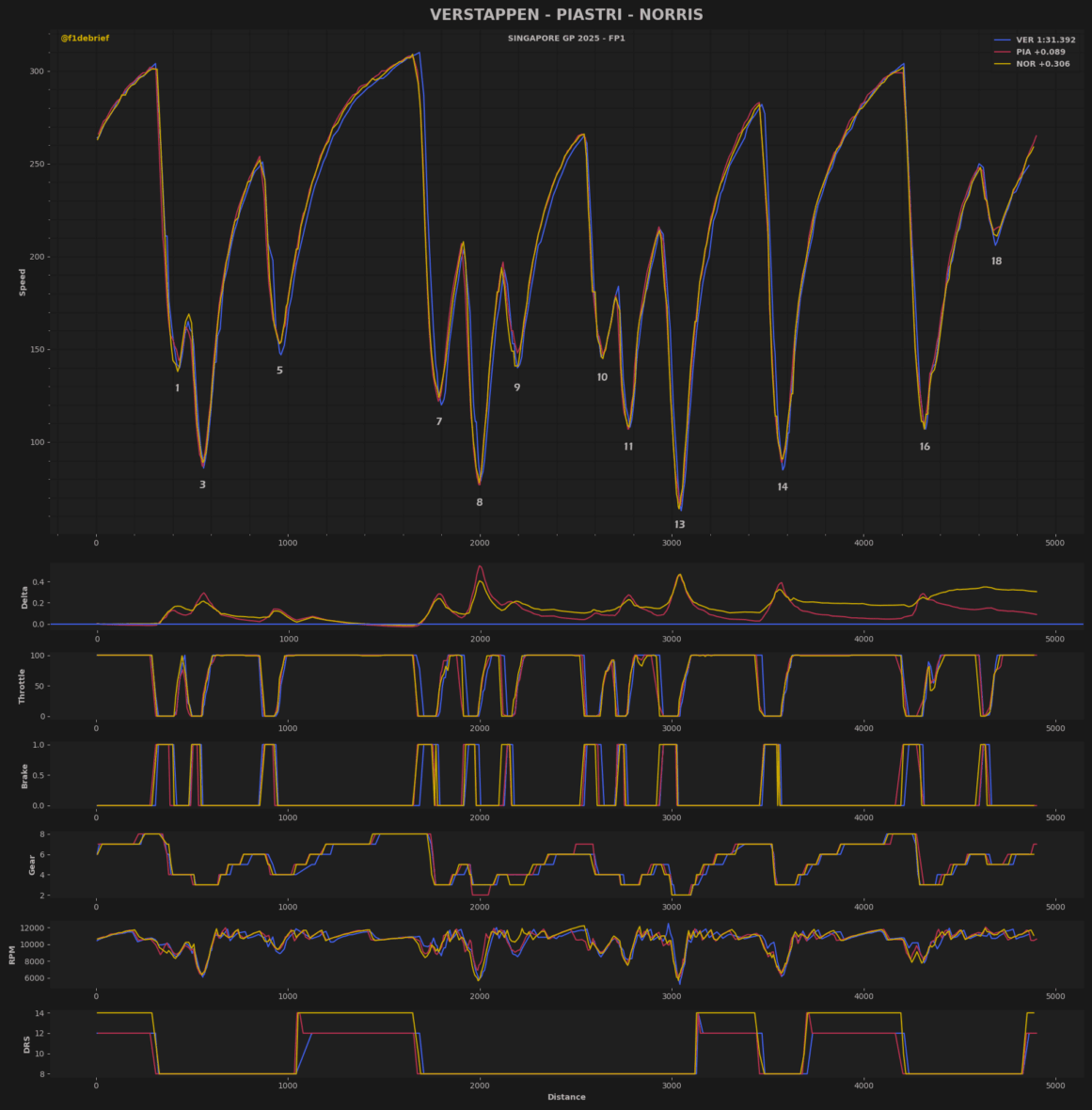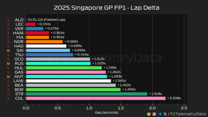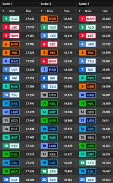 Ο Lando Norris σημείωσε χρόνο σχεδόν 0,22 δλ. μακριά από αυτόν του team-mate του, καθώς η McLaren δεν ξεκίνησε με κυριαρχικό τρόπο ένα κρίσιμο τριήμερο. Ο Isack Hadjar συνεχίζει να εντυπωσιάζει, με τη Racing Bulls να πιστεύει ότι η Σιγκαπούρη θα ευνοήσει τα δυνατά σημεία του μονοθεσίου της. Δυνατός έδειξε και ο Carlos Sainz με τη Williams, αν ληφθεί υπ’ όψη ότι έγραψε τον ταχύτερο χρόνο του με τη μέση γόμα, για να βρεθεί στην 8η θέση. Στα τελευταία δευτερόλεπτα της διαδικασίας, οι Sainz και Hulkenberg ενεπλάκησαν σε μία μονομαχία που θύμιζε… αγώνα, με τον Ισπανό να βγαίνει εκτός πίστας.