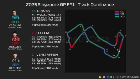 Ο Fernando Alonso ξεκίνησε με τον ιδανικό τρόπο τις διαδικασίες του αγωνιστικού τριημέρου του Grand Prix Σιγκαπούρης της Formula 1. Ο 44χρονος Ισπανός εκμεταλλεύτηκε το γεγονός ότι βγήκε στην πίστα πιο αργά από τους αντιπάλους του, όταν η αγωνιστική γραμμή είχε στρωθεί με γόμα και παρείχε περισσότερη πρόσφυση, για να σημειώσει τον ταχύτερο χρόνο του FP1.