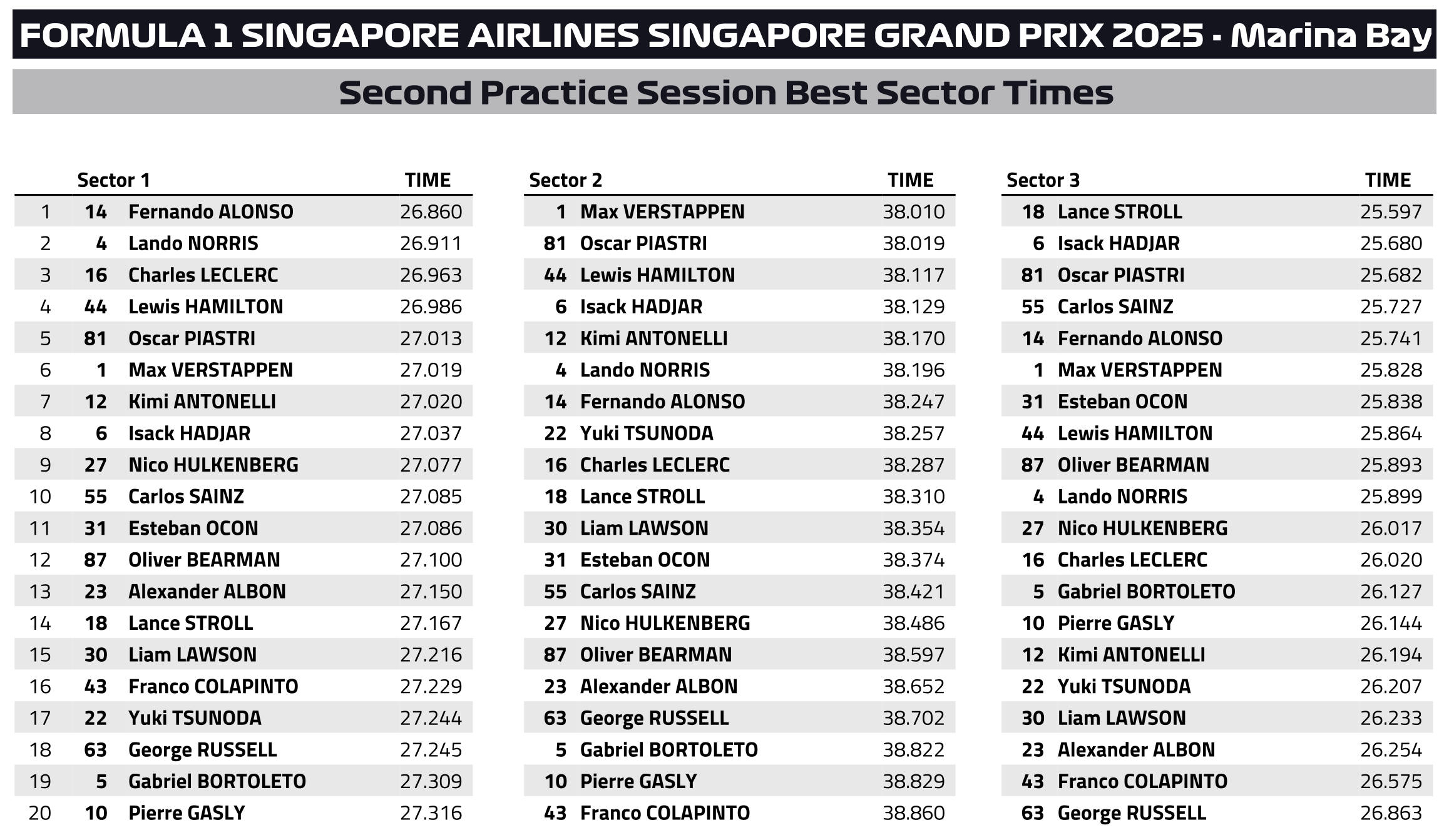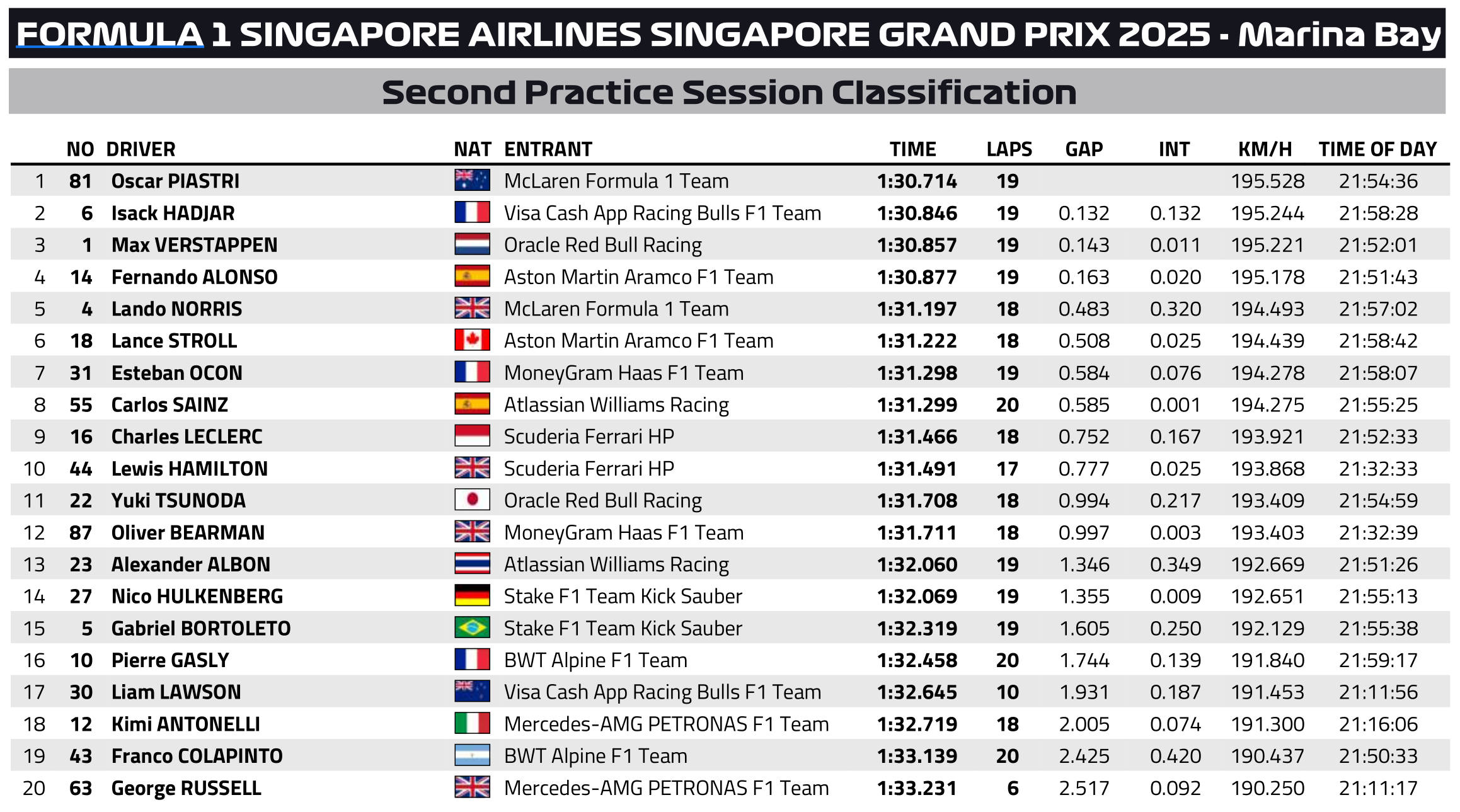 Όπως συνηθίζει, ο Piastri φαίνεται να χτίζει σταδιακά την ταχύτητά του κατά τη διάρκεια του τριημέρου. Την έκπληξη στην επεισοδιακή και γεμάτη αντιθέσεις διαδικασία έκανε ο Isack Hadjar, γράφοντας το δεύτερο χρόνο με τη Racing Bulls, για να πλησιάσει στα 0,132 δλ. τον Piastri και να βρεθεί εμπρός από τον Max Verstappen. Φαίνεται ότι το μονοθέσιο της ιταλικής ομάδας λειτουργεί πολύ καλά στο σιρκουί της Marina Bay και δίνει αυτοπεποίθηση στο Γάλλο rookie.
