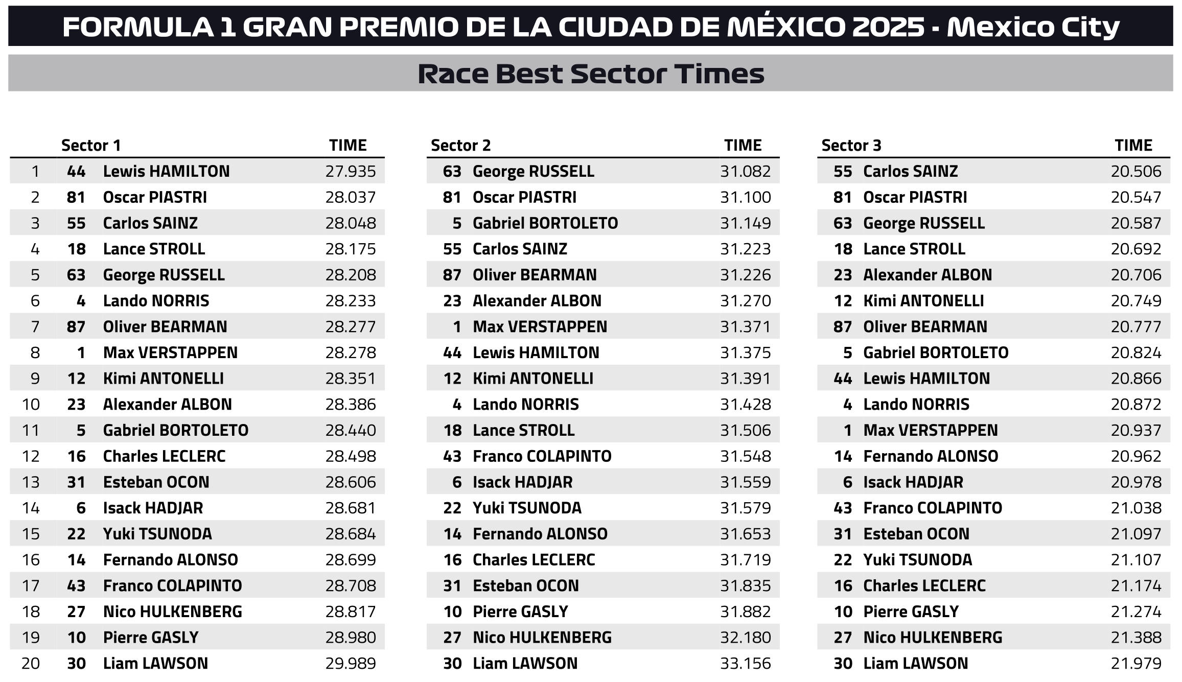 Ο Lando Norris κατέκτησε μία εξαιρετική νίκη στο Grand Prix Πόλης Μεξικού, όντας κυρίαρχος καθ’ όλη τη διάρκεια του αγώνα, για να τερματίσει με διαφορά μισού λεπτού από τον 2ο, Charles Leclerc. Η McLaren κατάφερε να επιστρέψει στις νίκες για πρώτη φορά από το GP Ολλανδίας έχοντας φανερά ταχύτερο ρυθμό αγώνα – τουλάχιστον στα χέρια του Βρετανού. Ο Norris έκανε πολύ καλή εκκίνηση και δεν απειλήθηκε ποτέ στη συνέχεια, εφόσον οι δύο Ferrari που βρίσκονταν πίσω του αρχικά, ήταν αναγκασμένες να κάνουν lift & coast, σηκώνοντας το πόδι από το γκάζι 50 μέτρα πριν από τις ζώνες φρεναρίσματος.