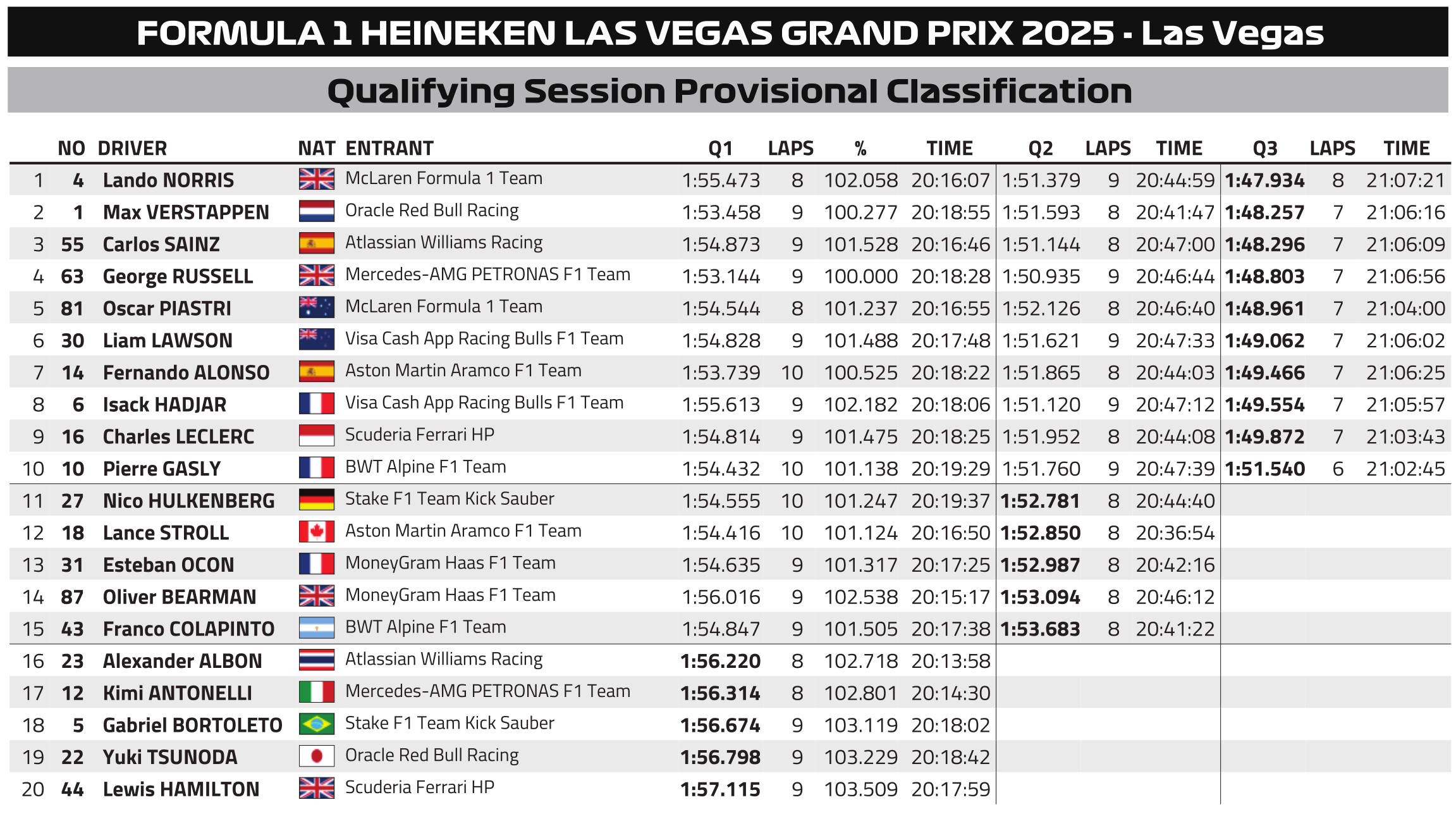 Ο Lando Norris κατέκτησε με τη McLaren στο Grand Prix Λας Βέγκας την 7η pole position του (και 3η συνεχόμενη) στη φετινή σεζόν της Formula 1, για να ισοφαρίσει τον Max Verstappen στην κορυφή του σχετικού πίνακα στατιστικών (για το 2025). Ήταν μία πολύ προκλητική διαδικασία λόγω της βροχής που είχε πέσει πριν από την έναρξη και συνεχίστηκε έως τα τελευταία λεπτά του Q1, με περιορισμένη πρόσφυση στην πίστα και τις χαμηλές θερμοκρασίες να δυσκολεύουν την ανάπτυξη θερμοκρασίας στα ελαστικά. Το αποτέλεσμα ήταν οι πιο δύσκολες κατατακτήριες δοκιμές της χρονιάς.
