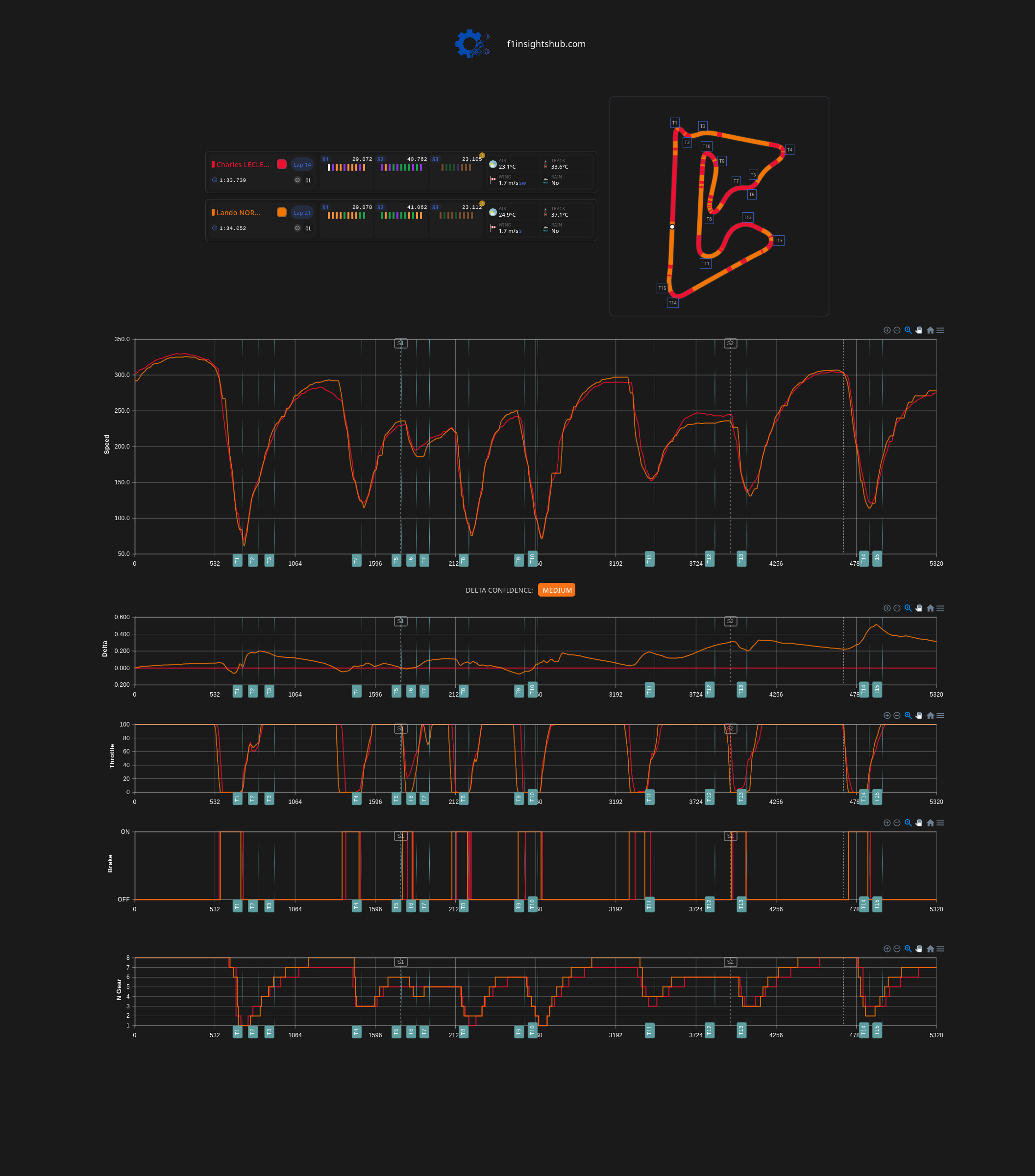 O περυσινός Πρωταθλητής Lando Norris, βρέθηκε στη δεύτερη θέση του πίνακα των χρόνων, 0,3 δλ. μακριά από την κορυφή, καθώς έκανε και ένα μικρό λάθος στην τελευταία στροφή στο γρήγορο γύρο του με τη McLaren, η οποία φαινόταν αρκετά νευρική σε μία άλλη γρήγορη προσπάθεια του Βρετανού. Η McLaren είχε περισσότερο «superclipping» (λειτουργία ανάκτησης ενέργειας) στο γρήγορο τμήμα των στροφών 11-12, αλλά είχε αποδεσμεύσει περισσότερη ενέργεια από τη Ferrari στις ευθείες μεταξύ των στροφών 3-4 και 10-11.