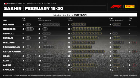 Σε αυτό το τεστ, οι ομάδες έχουν την ευκαιρία να δοκιμάσουν την πλήρη γκάμα των νέων ελαστικών της Pirelli, αν και οι γόμες C4 και C5 είναι πολύ μαλακές για τη συγκεκριμένη πίστα. Οι περισσότερες ομάδες έχουν επικεντρώσει την επιλογή τους στα σετ της γόμας C3, αλλά οι McLaren και Audi προτίμησαν να έχουν περισσότερα σετ της πιο σκληρής C2.