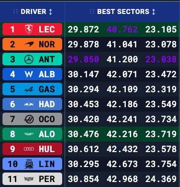 Την πρώτη τριάδα των ταχύτερων χρόνων συμπλήρωσε ο Andrea Kimi Antonelli με τη Mercedes, με χρόνο 0,4 δλ. μακριά από την κορυφή, έχοντας σημειώσει τον ταχύτερο χρόνο στο 1ο και το 3ο sector της πίστας. Η Mercedes παρουσιάστηκε σήμερα με αναβαθμισμένο αμάξωμα στο πίσω μέρος του καλύμματος του κινητήρα και νέο δάπεδο. Οι τρεις κορυφαίες ομάδες είχαν διαφορά 1,5 δλ. από το υπόλοιπο grid, ηγέτης του οποίου ήταν ο Alex Albon με τη Williams, με τον Pierre Gasly (Alpine) 0,2 δλ. πίσω του. Α